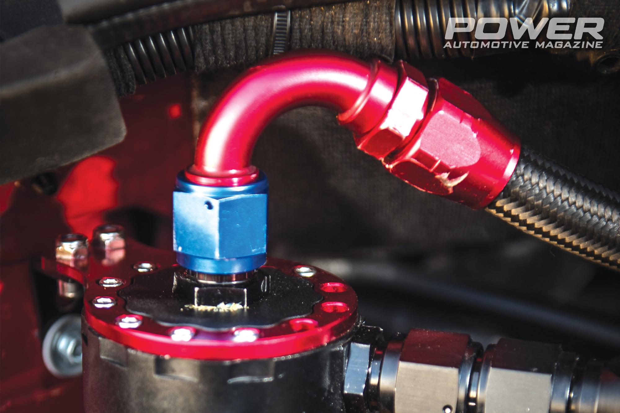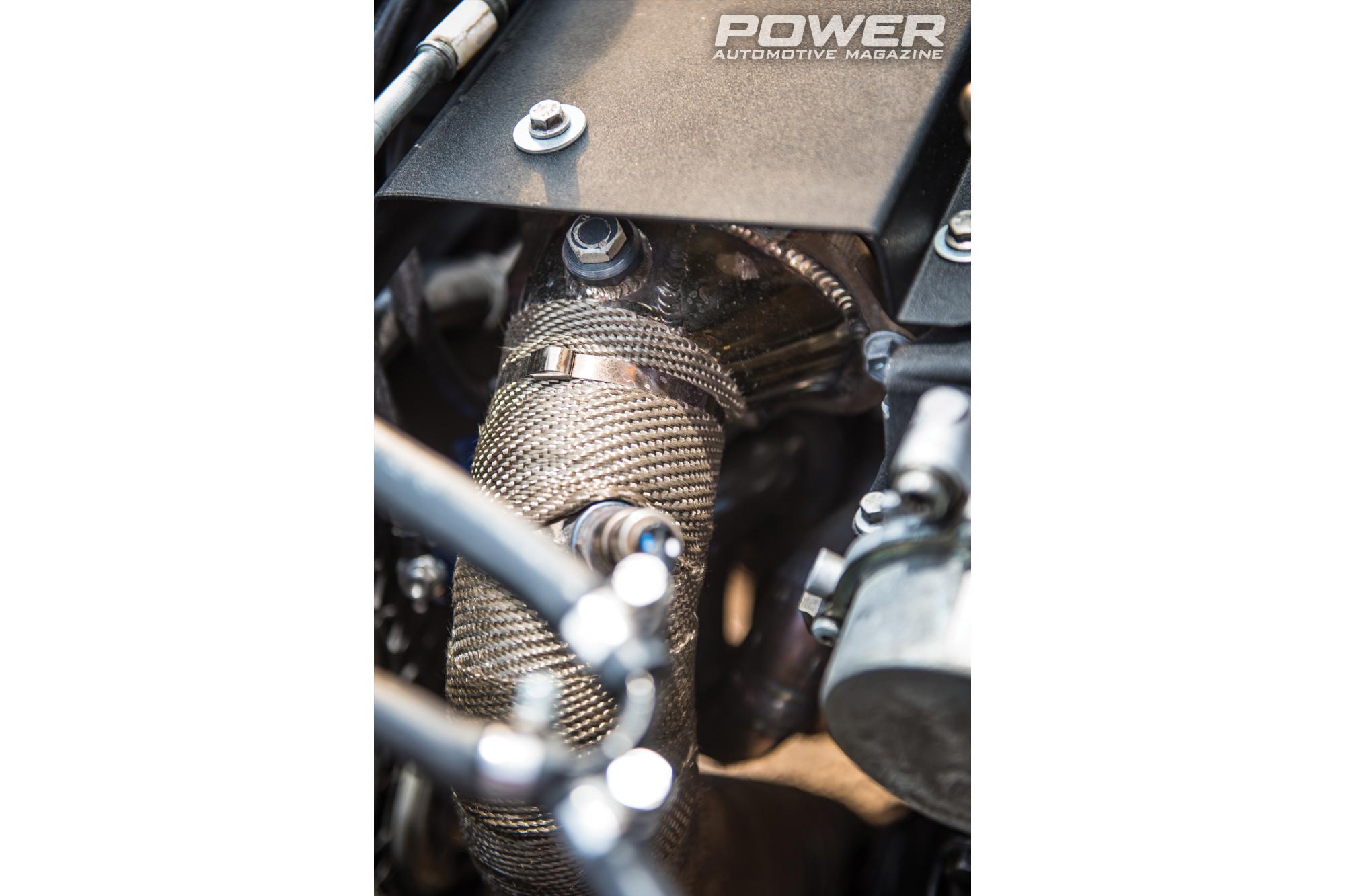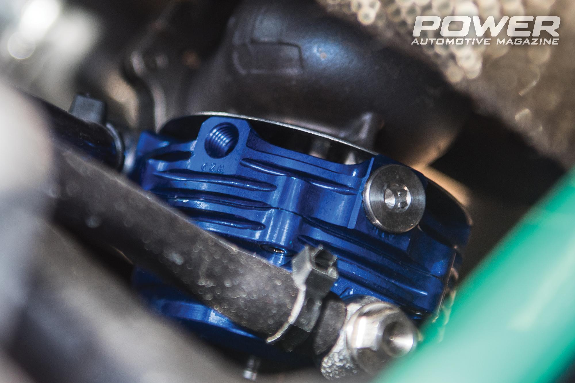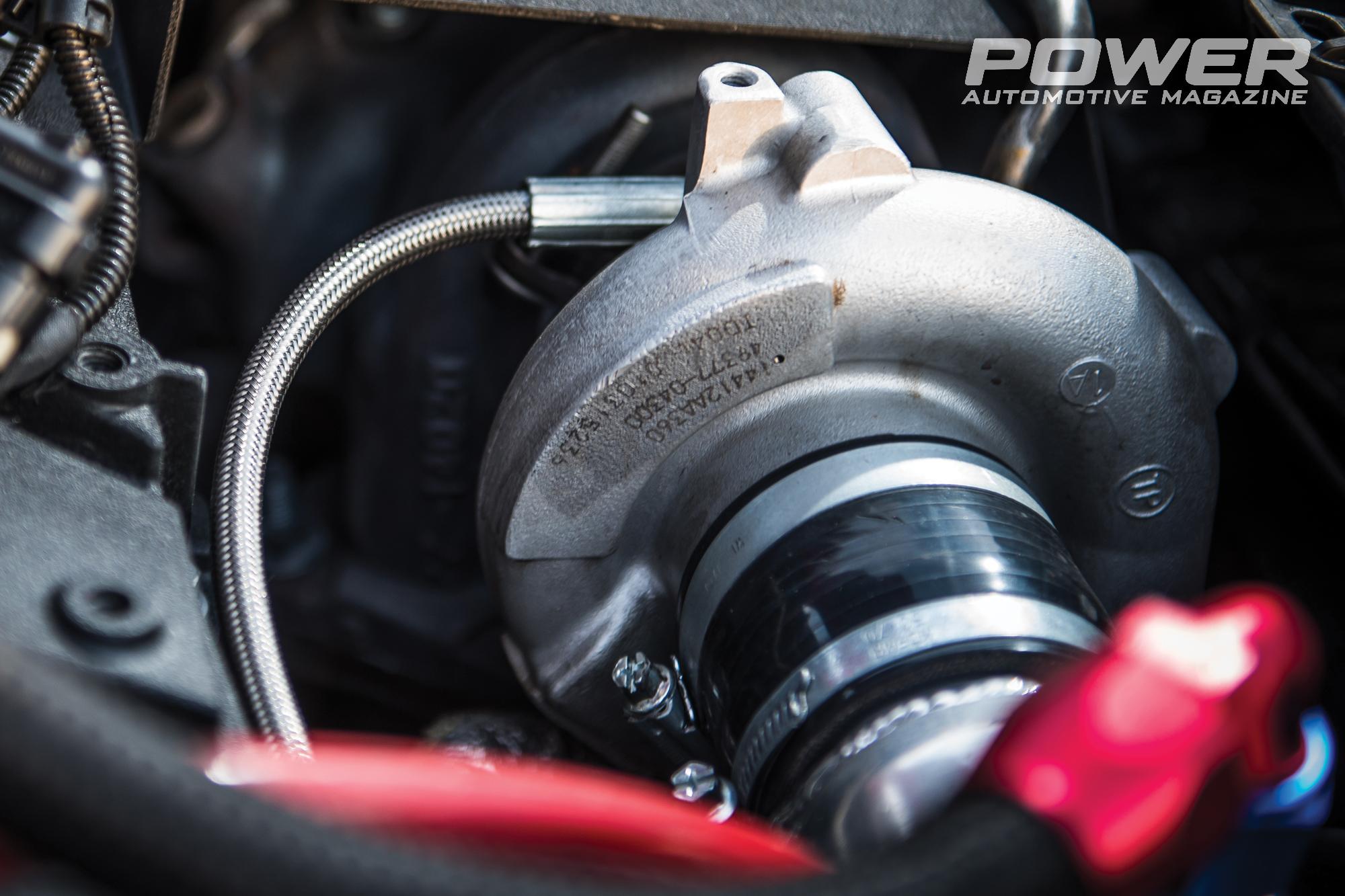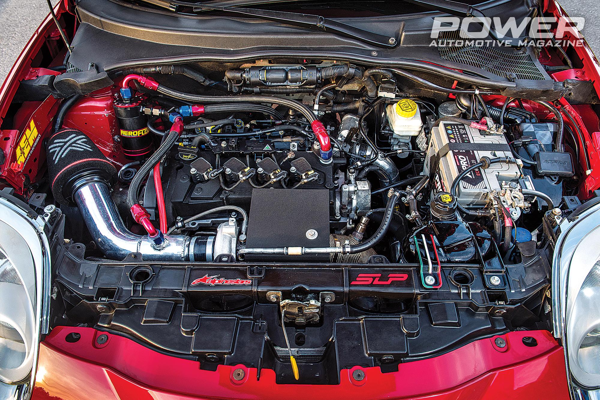 Για να γίνει ανταγωνιστικό στην κατηγορία, όπως είπαμε και παραπάνω, επέλεξαν την TD04 για turbo και για να μπορέσει να μπει στο μηχανοστάσιο, ο Σπύρος κατασκεύασε ένα χειροποίητο χταπόδι. Το turbo αναπνέει μέσω του custom kit εισαγωγής αέρα της SLP, που καταλήγει σε μία κωνική φιλτροχοάνη της Aeroflow. Η εξάτμιση είναι 70άρα, με 76mm downpipe, κατασκευασμένο από την Mavroidakos Racing Exhaust, με εργοστασιακό look, αλλά όχι εργοστασιακό ήχο. Επιπλέον φοράει μεγαλύτερο intercooler, με χειροποίητες σωληνώσεις, external wastegate της TiAL, ενώ η σκάστρα του είναι custom και ηλεκτρονικά ελεγχόμενη (ειδική κατασκευή για Multiair). Όπως στα T-Jet έτσι και στα Multiair, τα μεγαλύτερα μπεκ είναι αναγκαία σε τέτοια setup, γι’ αυτό και τα εργοστασιακά αντικαταστάθηκαν από νέα, με παροχή 390cc/min, ενώ φοράει και water-methanol kit της AEM. Φυσικά και μιλάμε για stock κινητήρα, αφού η μόνη προσθήκη που έχει γίνει στα «ενδότερα» είναι ο stage 1 εκκεντροφόρος της MTD.
