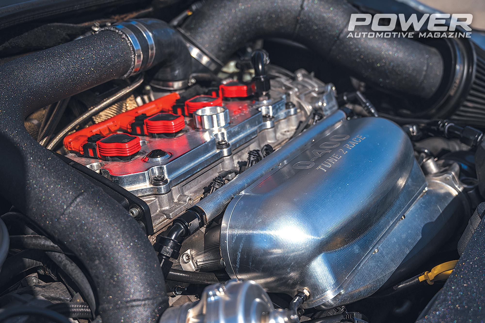Η εξάτμιση είναι χειροποίητη, με downpipe 90mm από την PPM Exhausts, η οποία έχει κατασκευάσει και τις σωληνώσεις στην μεριά της εισαγωγής. Το intercooler είναι και αυτό custom κατασκευή της 0-400 Tune 2 Race με «πυρήνα» της Garrett πάχους 100mm, ενώ το ίδιο ισχύει και για το σύστημα τροφοδοσίας καυσίμου, με ένα πλήρες fueling kit που περιλαμβάνει δύο αντλίες υψηλότερης παροχής. To external wastegate είναι της Turbosmart με διάμετρο 45mm. Από την άλλη μεριά, αυτή της εισαγωγής, ακολουθώντας την ροή του αέρα, συναντάμε αρχικά μια φιλτροχοάνη της Aeroflow και μετά το turbo και το intercooler ο συμπιεσμένος αέρας καταλήγει στην γνωστή και αποδοτική billet αλουμινένια πολλαπλή εισαγωγής με πεταλούδα 75mm της 0-400 Tune 2 Race, ένα κόσμημα σήμα κατατεθέν σε όλα τα δυνατά μηχανοστάσια της εταιρείας. Για να «αποφορτίζεται» το κύκλωμα στο άφημα του γκαζιού φροντίζει μια σκάστρα 50mm της TiAl, ενώ για το «τάισμα» του TFSI, φροντίζουν τα τεράστια μπεκ της FIC με παροχή 1.300cc/min. Οι πολλαπλασιαστές είναι και αυτοί δυνατότεροι από την MSD και τον προγραμματισμό του εγκεφάλου Extreme MS3 TFSI της MS Labs για να μπορέσει να συνεργαστεί με όλες αυτές τις καινούριες παραμέτρους τον έχει προγραμματίσει η Dynodrome. Ο Extreme MS3 ειδικά για τους κινητήρες 2.0TFSI EA113 είναι plug&play στην εργοστασιακή πλεξούδα, αλλά είναι πολύ πιο παραμετροποιήσιμος από τον εργοστασιακό MED9.1 της Bosch. Η μεγαλύτερη διαφορά είναι ότι με τον Extreme MS3 καταργείται η εργοστασιακή αντλία υψηλής πίεσης και τα μπεκ του άμεσου ψεκασμού και ο κινητήρας μετατρέπεται σε έμμεσου ψεκασμού, χωρίς τροποποίηση όμως στην πλεξούδα, αφού οι φίσες του άμεσου ψεκασμού συνδέονται κατευθείαν στα καινούργια μπεκ του έμμεσου. Όλα τα υπόλοιπα συστήματα λειτουργούν κανονικά, ABS, ASR, ESP, DSG, Haldex, πίνακας οργάνων, A/C, immobilizer, ακόμα και το διαγνωστικό της VW μπορεί να συνδεθεί μέσω της νέας θύρας OBD2 και να αναγνωρίσει βλάβες ή να κάνει ρυθμίσεις.