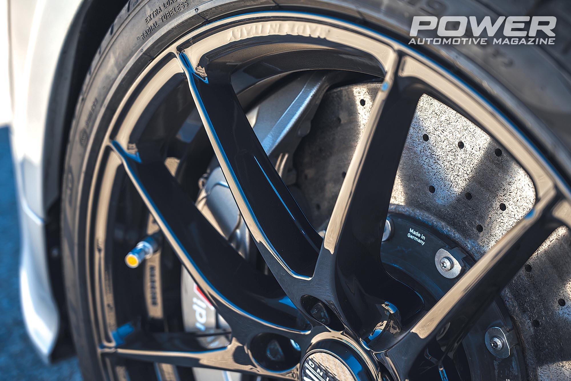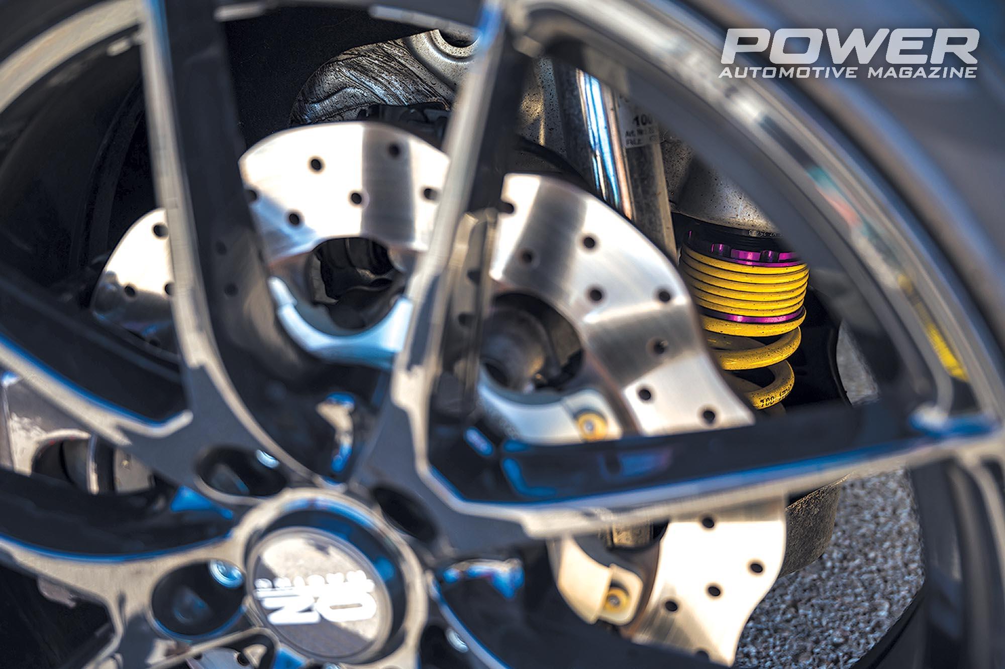Η ανάρτηση είναι η KW Variant 3 με σκληρότερα όμως ελατήρια από τη σειρά Clubsport, ενώ τα τρομερά φρένα του προέρχονται από Audi RS4 B9, με carbon-ceramic δίσκους 400x38mm εμπρός και τις ανάλογες εξαπίστονες δαγκάνες, ενώ πίσω έχει κάτι πανέμορφες custom «μαργαρίτες» της 0-400 Tune 2 Race. Οι ζάντες είναι οι ελαφριές ΟΖ Leggera HLT διαμέτρου 19in, με λάστιχα Pirelli P Zero 245/35, τα οποία χρησιμοποιούνται για καθημερινή χρήση. Όταν το αυτοκίνητο φορέσει την «νυχτερινή τουαλέτα», οι ζάντες γίνονται 18in και τα λάστιχα επίσης ειδικού σκοπού -semi-slicks.