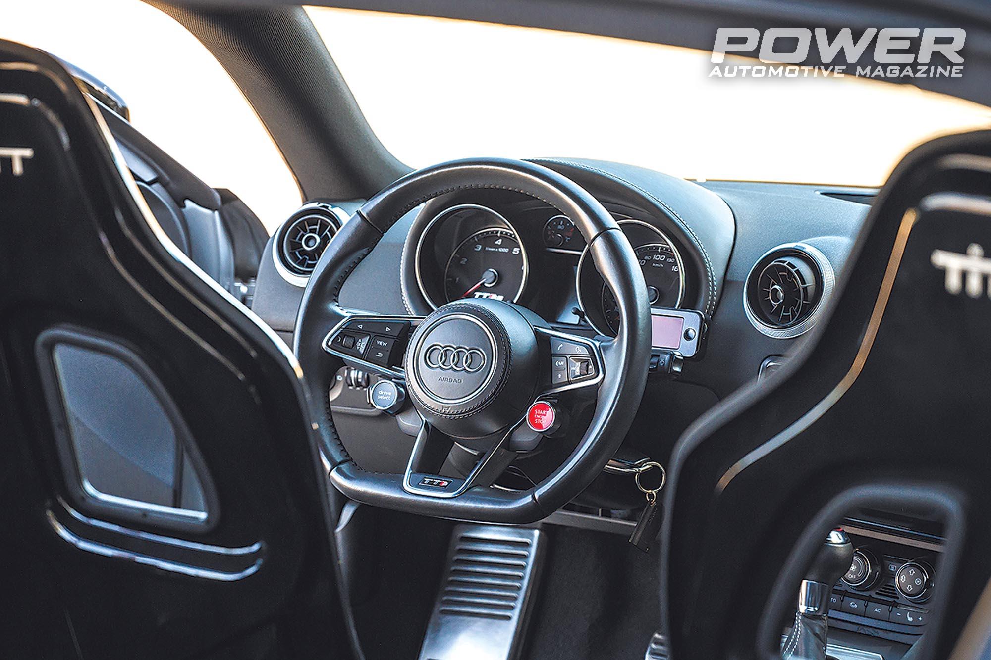 Το συγκεκριμένο είναι το «δικό του» Audi TTS, το οποίο χρησιμοποιεί κάθε μέρα, πηγαίνει με αυτό στο μαγαζί, πηγαίνει σε δουλειές, για ψώνια, τα παιδιά στο σχολείο και γενικά ό,τι κάνει ένα Toyota Yaris (όχι σαν αυτό που έχουμε στο τεύχος..) ενός φυσιολογικού ανθρώπου. Ο Τάκης είναι λίγο διαφορετικός από το δικό μας «φυσιολογικό» και για αυτήν την δουλειά χρησιμοποιεί Audi TTS 750 ίππων στους τροχούς, έτσι, γιατί μπορεί. Εδώ που τα λέμε, αν δεν κυκλοφορείς με αυτοκίνητο σαν αυτά που φτιάχνεις, τι σόι μάστορας είσαι; Τι δοκιμάζεις, τι βελτιώνεις, τι λάθη και αδυναμίες εντοπίζεις όταν δεν ζεις με ένα από αυτά τα αυτοκίνητα καθημερινά; Περιμένεις από τους πελάτες να σου πούνε τι είδαν και τι έκαναν, λες και είναι μηχανικοί και αυτοί; Από το «ακούω ένα τακ τακ τακ κάπου δεξιά», άκρη δεν έβγαλε ποτέ κανείς. Την «βιονική» φύση αυτού του παιδιού μπορεί κάποιος εύκολα να αντιληφθεί απλά και μόνο κοιτάζοντας μέσα στο σαλόνι του «καθημερινού» του ΤΤS, όπου θα συναντήσει τα πανάλαφρα και πανάκριβα ανθρακονημάτινα καθίσματα της Tillett, τα οποία εδραιώθηκαν στα Dragster, πέρασαν όμως και σε καμπίνες άλλων αγωνιστικών και trackday αυτοκινήτων, αλλά τον κύριο Τάκη μας τον βολεύουν και τα βρίσκει μάλιστα πολύ άνετα! Αυτό είναι και το μοναδικό ελάφρωμα μαζί με την πίσω carbon πόρτα που έχει το αυτοκίνητο, ενώ στο πάτωμα του χώρου αποσκευών έχουν προστεθεί μονώσεις για να μην ακούγονται οι αντλίες.