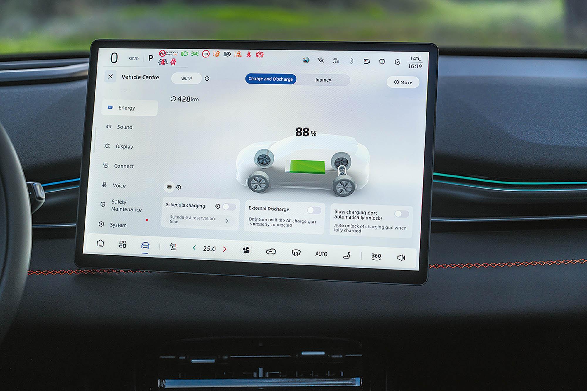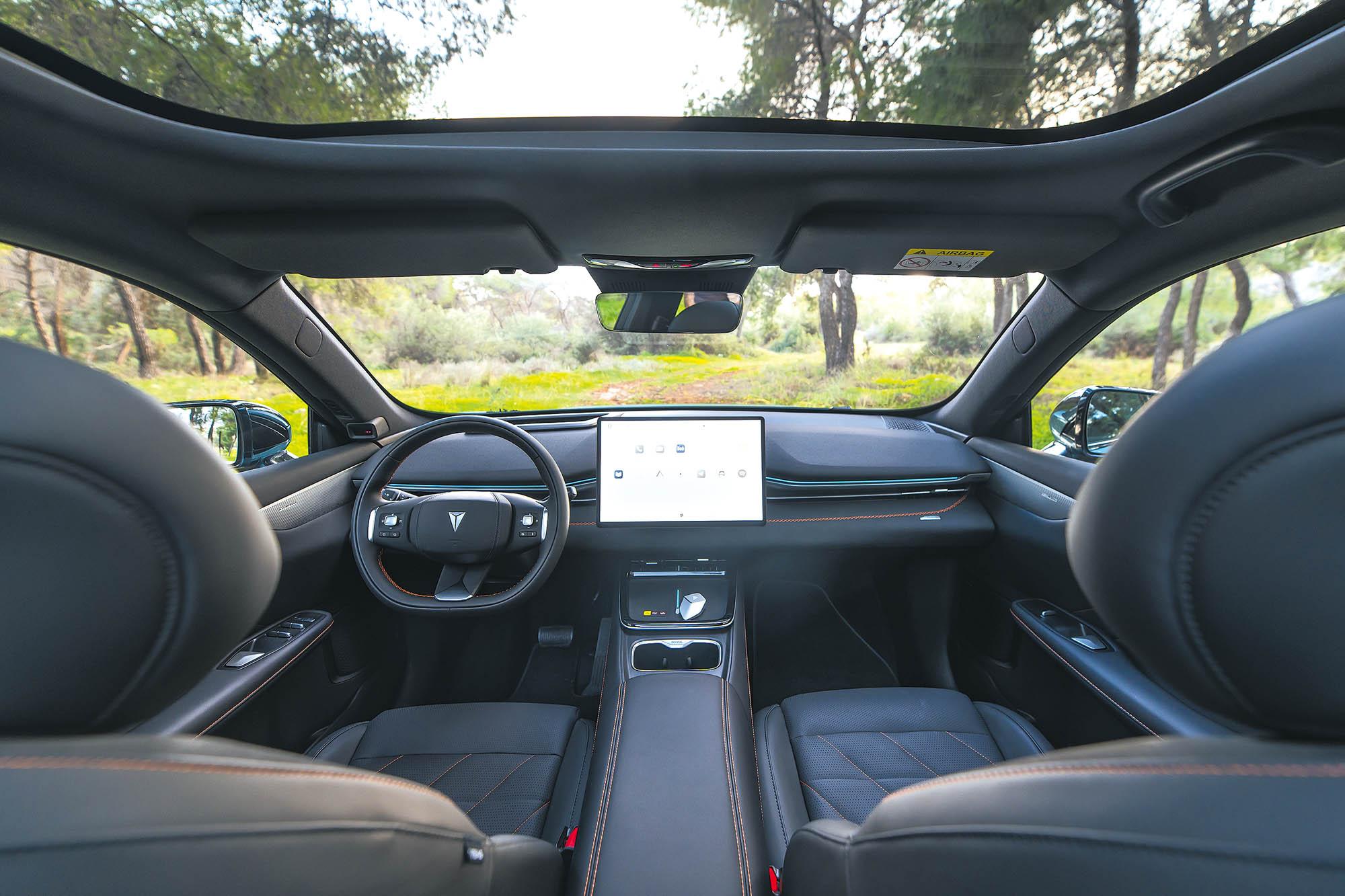 Η σχεδίαση του εσωτερικού δεν παρεκκλίνει ιδιαίτερα από αυτά που μας έχουν συνηθίσει οι Κινέζοι. Μινιμαλιστικό ταμπλό, ελάχιστοι φυσικοί διακόπτες, μεγάλη οθόνη αφής. Όλα αυτά τα έχουμε δει πολλές φορές, ωστόσο η προσέγγιση της Changan είναι πιο προσεγμένη τόσο σε ποιοτικό όσο και ουσιαστικό επίπεδο. Για παράδειγμα, η μεγάλη οθόνη αφής 15,4in δεν γυρνάει σαν σβούρα για εντυπωσιασμό, αλλά περιστρέφεται κατά 15 μοίρες προς το μέρος του οδηγού -για ευκολότερο χειρισμό- όταν αυτός καθίσει στο κάθισμα, ενώ μέσα από το μενού μπορείς να ορίσεις προς τα ποια μεριά θα κλίνει. Η κεντρική οθόνη (ανάλυσης 2.5Κ) είναι φυσικά το κέντρο ελέγχου όλου του αυτοκινήτου αφού στην ουσία όλες οι ρυθμίσεις γίνονται από το μενού. Το οποίο μενού είναι σχετικά απλό, με ταχύτατη απόκριση χάρη στον ισχυρό 8πύρηνο επεξεργαστή Snapdragon 8155P, όμως η πληθώρα επιλογών απαιτούν μία εξοικείωση μαζί του. Μπορείς να επιλέξεις από προεπιλεγμένα wallpapers, να προσθέσεις το δικό σου, ενώ στο κάτω μέρος υπάρχει μία μπάρα επιλογών η οποία είναι πλήρως παραμετροποιήσιμη. Ψηφιακός πίνακας οργάνων δεν υπάρχει, αφού οι ενδείξεις που χρειάζεται ο οδηγός προβάλλονται στο Head-up Display (στάνταρ στην έκδοση Ultra της δοκιμής). Η σουίτα των συστημάτων υποβοήθησης και ασφάλειας είναι φυσικά υπερπλήρης κάτι που ισχύει για τα περισσότερα αυτοκίνητα της κατηγορίας, όμως το S05 κάνει κάτι πολύ έξυπνο: από το να σου σπάει τα νεύρα με 8 διαφορετικές ηχητικές ειδοποιήσεις για απόσπαση προσοχής, υπέρβαση του ορίου κ.α., σου δίνει τη δυνατότητα για εύκολη απενεργοποίηση των ηχητικών ειδοποιήσεων αν αυτές εμφανιστούν συχνά.
