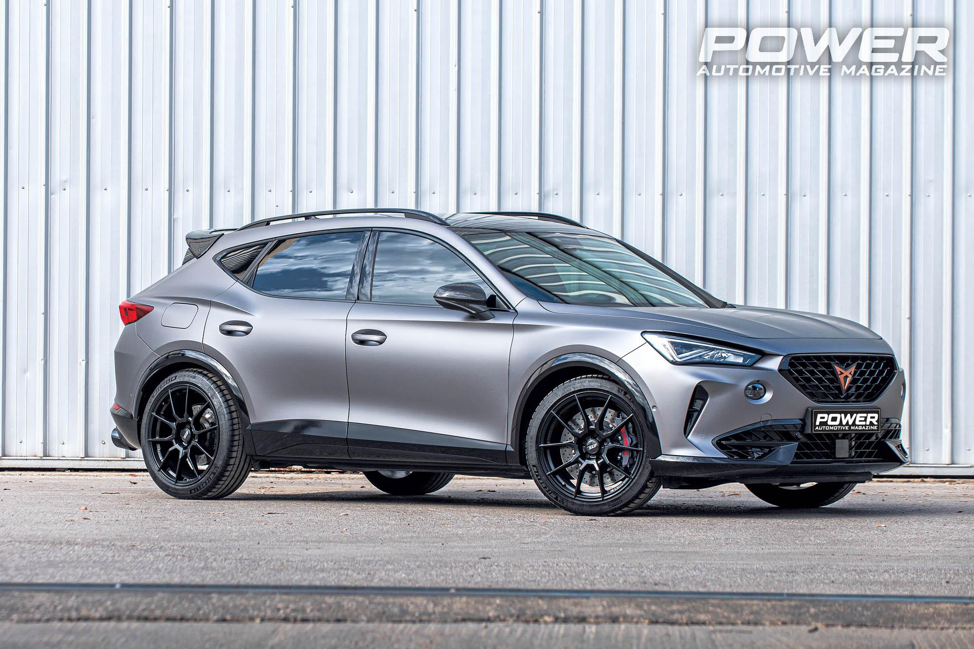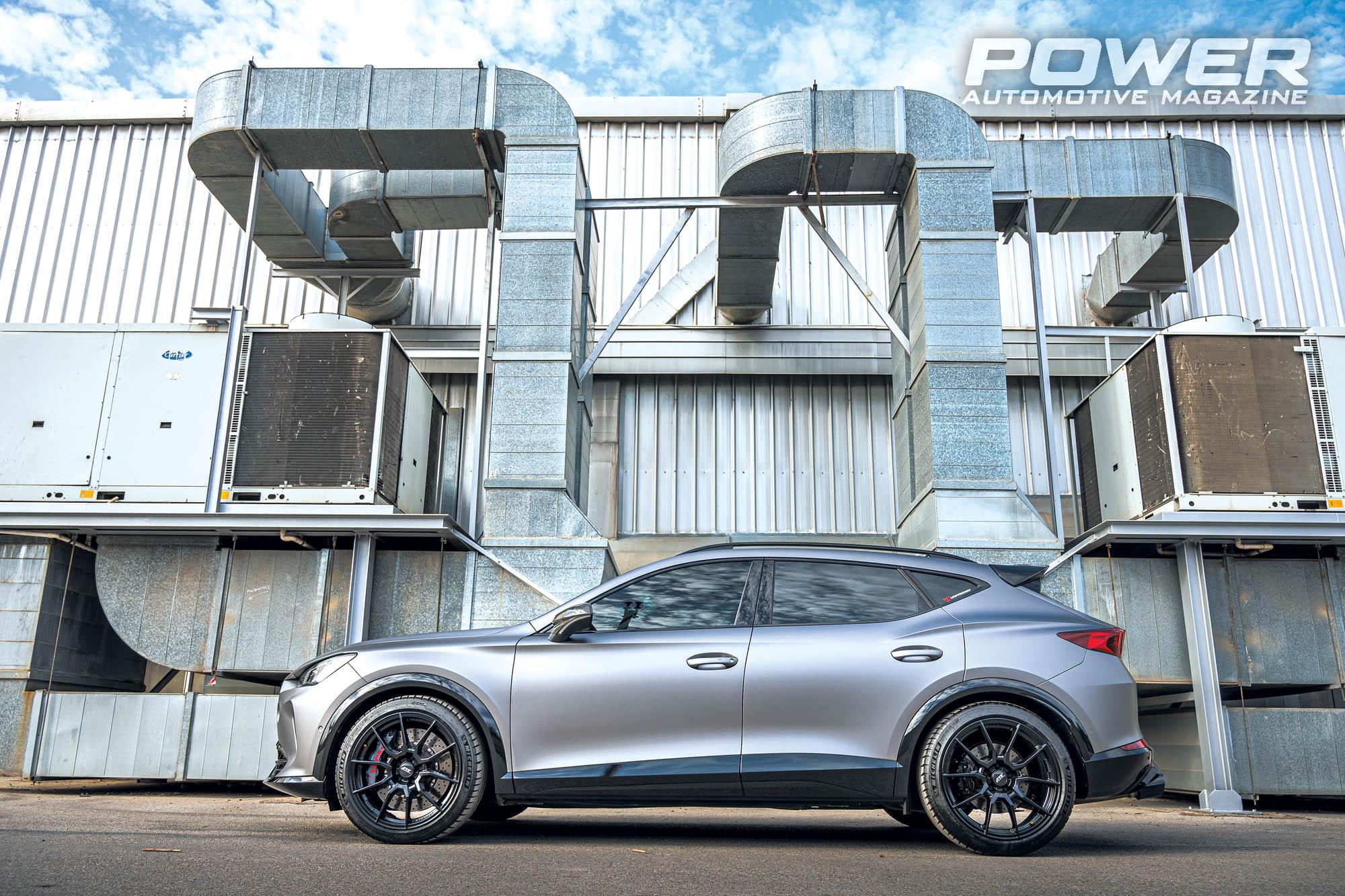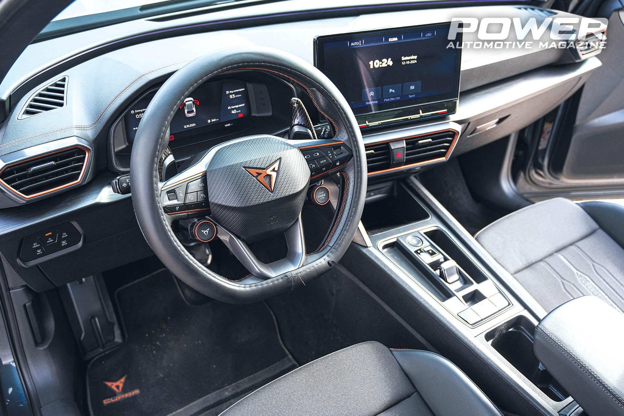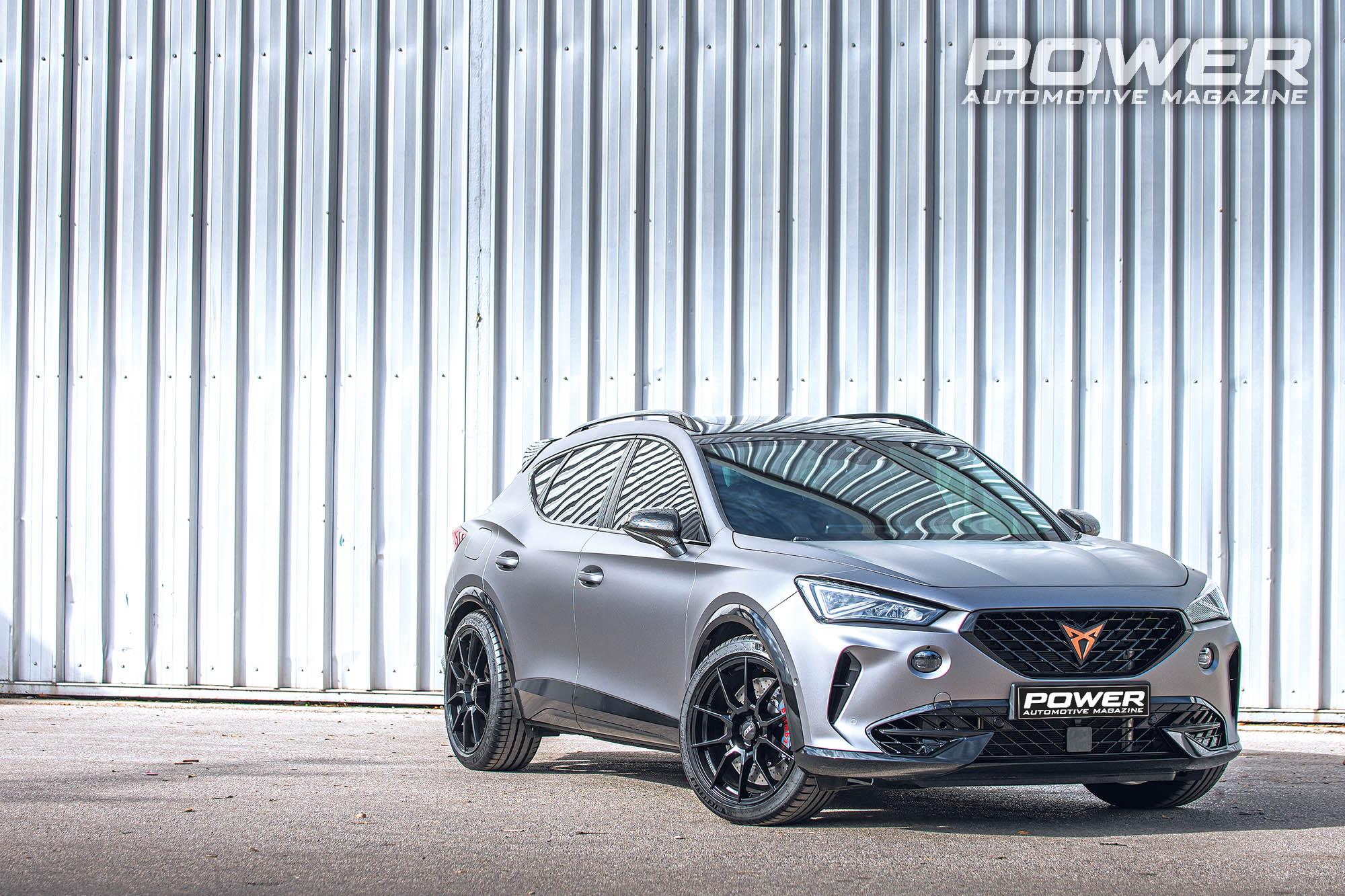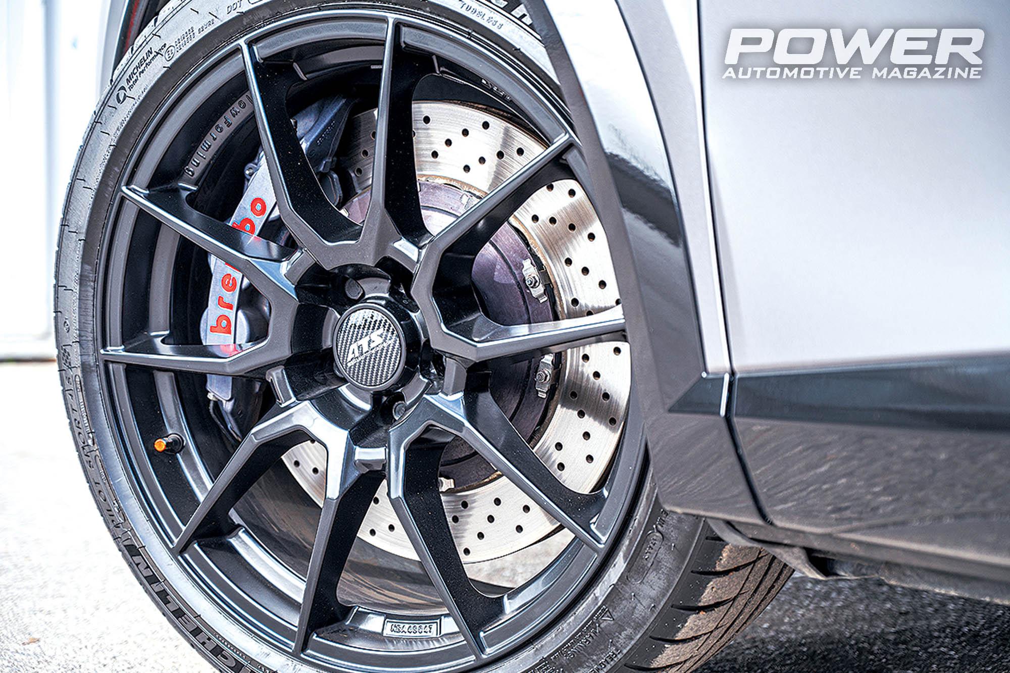 Όπως διάβασες στην αρχή, ο Γιώργος άρχισε τον “πρόλογο” για τις βελτιώσεις λέγοντας για φρένα, ανάρτηση κ.λπ. Δεν τα ξέχασε, μην ανησυχείς, στην πραγματικότητα έτσι ξεκίνησε πρώτα. Πίσω απ’ τις όμορφες μαύρες 19άρες Racelight της ATS υπάρχει ένα κτηνώδες κιτ της Brembo που περιλαμβάνει εξαπίστονες GTS δαγκάνες με διαιρούμενους τρυπητούς δίσκους εμπρός, διαστάσεων 380x34mm της Brembo και τρυπητούς δίσκους στις εργοστασιακές διαστάσεις (310mm) πίσω, ενώ τα σωληνάκια αεροπορικού τύπου είναι της Goodridge. Στην ανάρτηση τα πράγματα είναι αρκετά πιο απλά, αφού το Formentor VZ φοράει από το εργοστάσιο μια εξαιρετική ηλεκτρονικά ρυθμιζόμενη ανάρτηση με 5 προφίλ οδήγησης. Το μόνο που άλλαξε εκεί είναι πως μπήκαν ελατήρια χαμηλώματος 35mm της H&R για να σκληρύνει ελάχιστα, να ρίξει κάπως το κέντρο βάρους αλλά και να δείχνει πιο όμορφο! Α, εφόσον είμαστε στο αισθητικό κομμάτι, πίσω υπάρχει μια αεροτομή της JE Design, ενώ το Cupra ντύθηκε με ανθρακί ματ μεμβράνη από την Vagiannakis Group.
