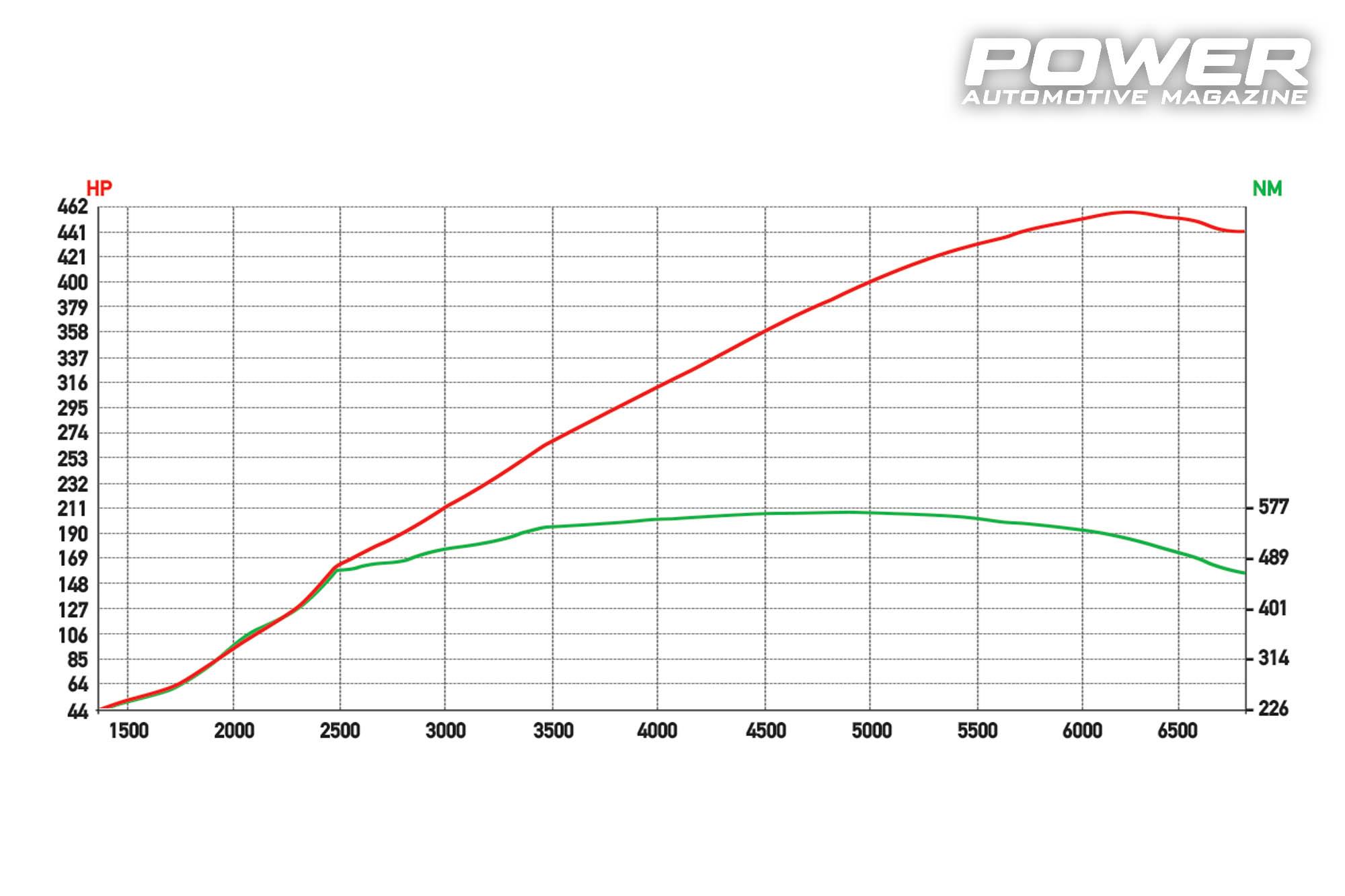 Τώρα είναι η σειρά του software και σε αυτό θα απευθυνθούμε στον Τάσο Μπίθα της GroupA Motorsport που έχει περάσει το πρόγραμμα Stage 2 της Unitronic για την ECU, το overboost πάει στα 2,1bar με 1,5bar σταθερό. Επειδή όμως ξέρουν τι περίπου θα αποδώσει το Formentor με αυτές τις βελτιώσεις, γνωρίζουν πως το 7άρι αυτόματο κιβώτιο θα ...τσινήσει! Οπότε τραβάνε και στην TCU έναν αναπρογραμματισμό ώστε ο περιοριστής ροπής να ανέβει στα 61kgm (52kgm εργοστασιακά). Α, δεν πρέπει να ξεχνάμε το διπλό launch control: Το “απαλό” στις 3.500rpm (ενεργοποιείται από βαθύ πάτημα του γκαζιού αλλά όχι τέρμα) και το “σκληρό” στις 4.000rpm (πατάς το γκάζι μέχρι το τέρμα). Τέλος! Το αποτέλεσμα; Στο δυναμόμετρο της Microchips Tuning, το Formentor έβγαλε 457,9Ps /6.172rpm με 58,2kgm / 4.966rpm, δηλαδή με Εισαγωγή Αέρα - Πρόγραμμα – Εξάτμιση – Intercooler, το Cupra κέρδισε αξιόπιστα 150+Ps και 17kgm!!! Το γράφημα είναι ένα παράδειγμα ομαλότητας. 216Ps/3.000rpm, 315Ps/4.000rpm, 400Ps/5.000rpm, ενώ η ροπή είναι σταθερότατη, αφού από τις 2.500rpm και μέχρι τον κόφτη στις 6.800rpm είναι ΣΥΝΕΧΩΣ πάνω από 46kgm!