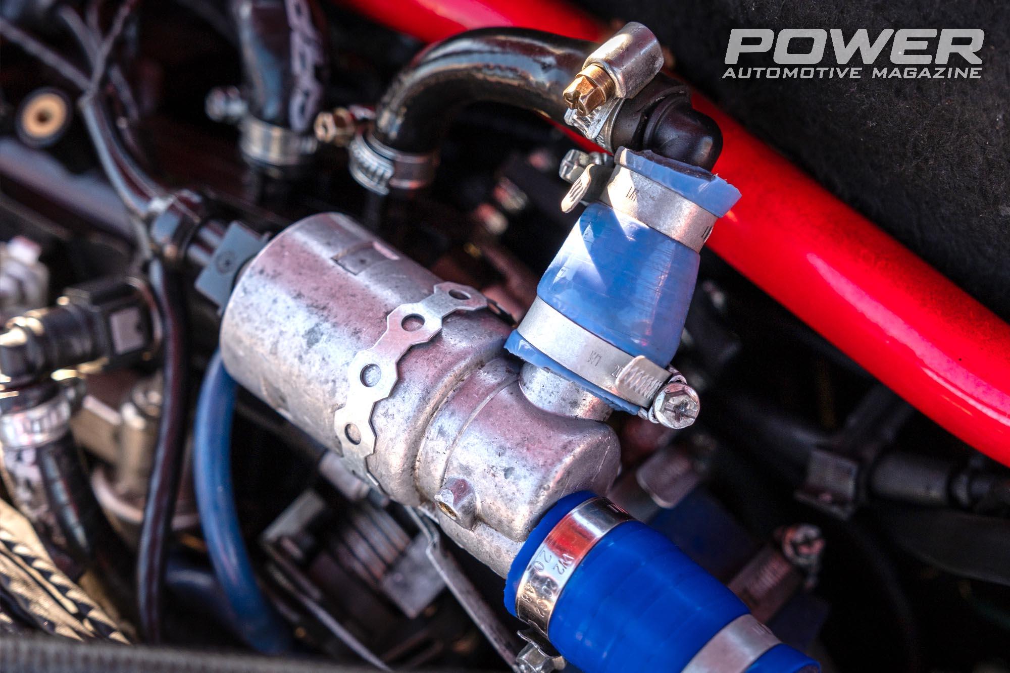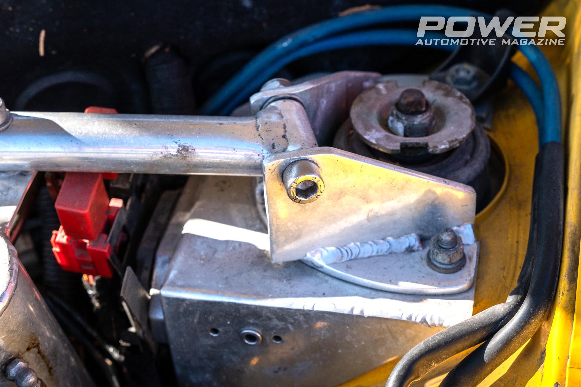 Τα «δεσίματα» δεν σταματούν εδώ, καθώς έχει και μπάρα θόλων αλλά και μία στις πίσω κολώνες της ZEP Racing που κανονικά ήταν για Toyota Starlet EP81, αλλά ταιριάζει. Έχει και μπάρα ψαλιδιών της OMP, silent blocks της Powerflex, ενισχυμένες βάσεις μηχανής της Strongflex και αμορτισεράκι engine damper που κρατάει κόντρα στην κίνηση του μοτέρ μέσα στο μηχανοστάσιο το οποίο κανονικά είναι για Honda Civic, αλλά το έχουν προσαρμόσει με custom βάσεις.