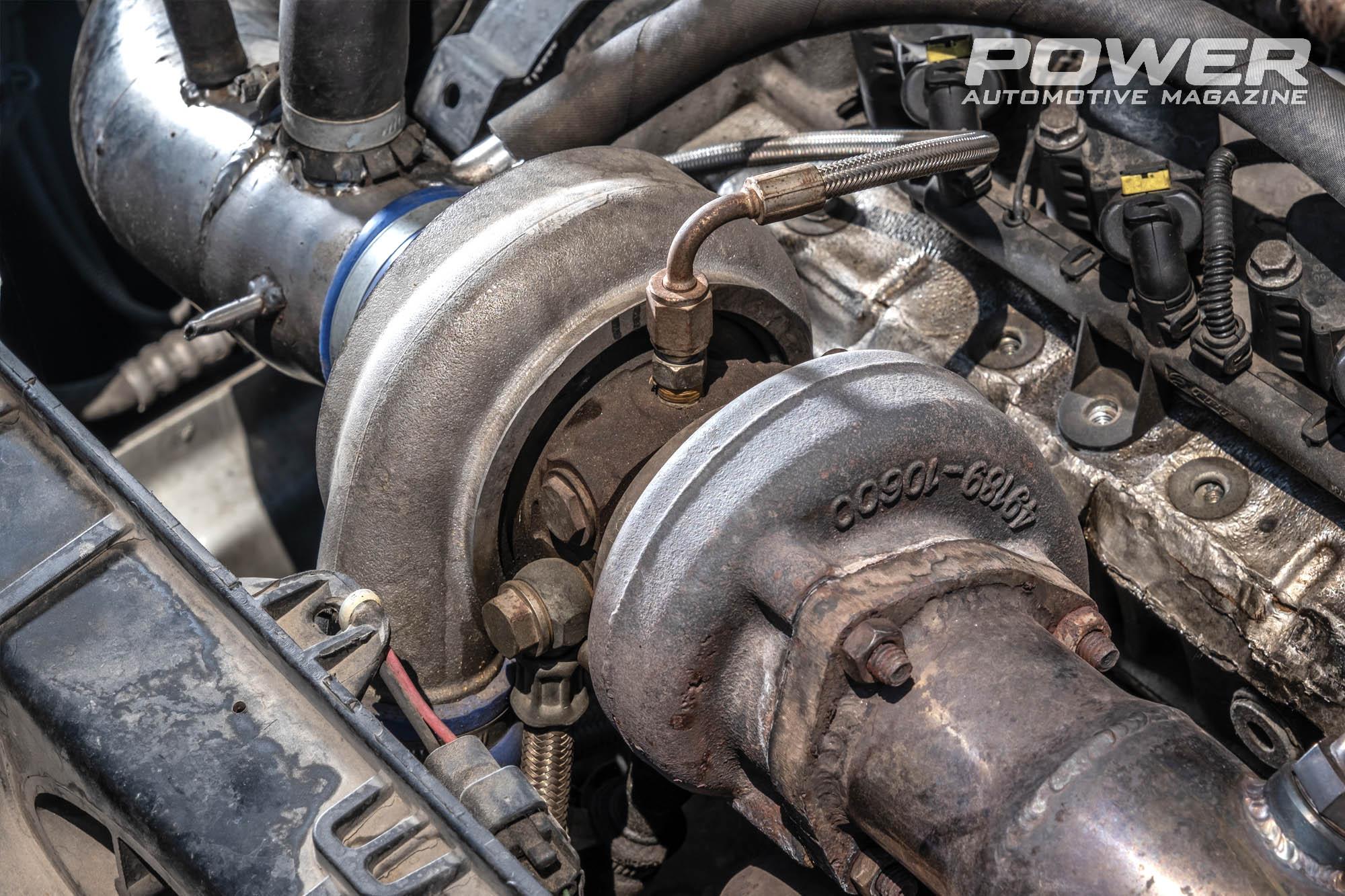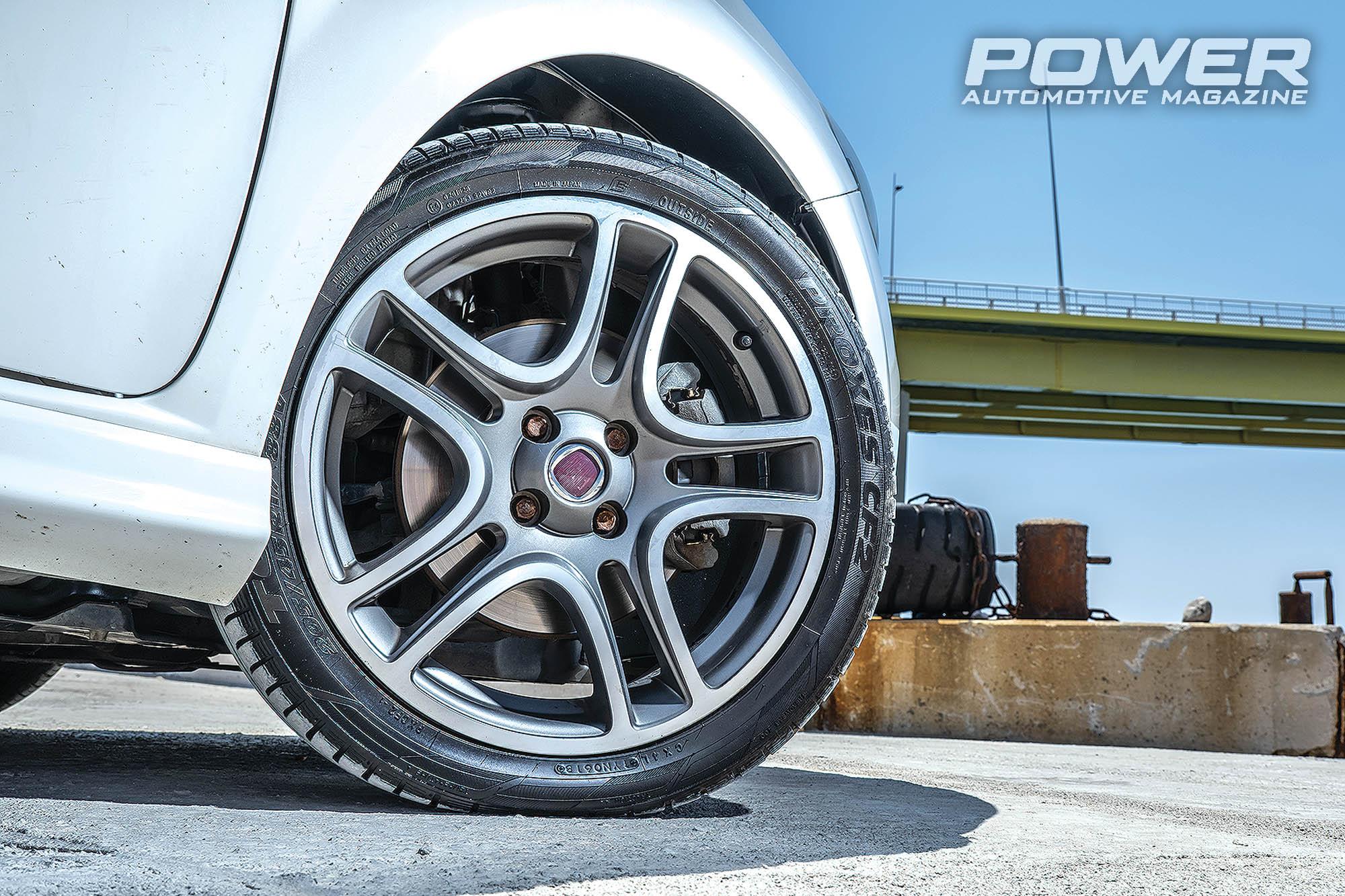 Οπότε έχουμε και λέμε, ο κινητήρας έχει παραμείνει εργοστασιακός, έχει γίνει ροϊκή εξέλιξη από τον Γιάννη Σεβνταλή της Superflow Center στην κεφαλή του κινητήρα, όπου άνοιξε τους αυλούς εισαγωγής και εξαγωγής κατά 1m. Αφού «άνοιξε» το καπάκι, αγόρασε νέες βαλβίδες από τη Nimonic, σκληρότερα retainers με ελατήρια από ατμοσφαιρικό Grande Punto 1.4 16v και εκκεντροφόρους της Colombo & Bariani με διάρκεια 274/244ο και lift 8,7/7,4mm σε εισαγωγή και εξαγωγή αντίστοιχα. Τέλος, κατέβασε τη συμπίεση από το 9,8:1 στο πιο safe 9,3:1, με aftermarket μεταλλική φλάντζα. Η Mitsubishi TD04-13T, που φορούσε μέχρι τότε, αντικαταστάθηκε από μία τουρμπίνα της Kinuwaga, πρόκειται για ένα υβρίδιο της TD04 με μεγαλύτερη φτερωτή στροβίλου, αφού πλέον φοράει από το μοντέλο TD04-20T.
