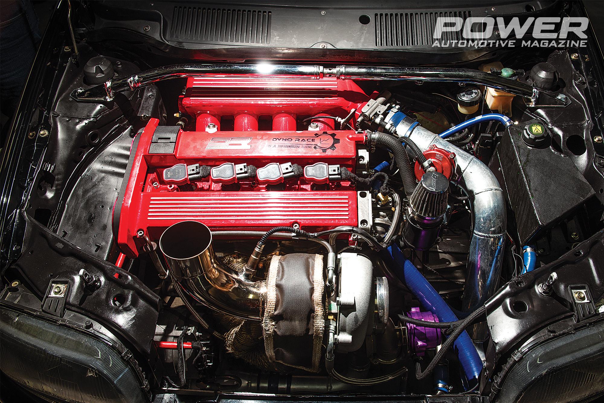 Η εισαγωγή είναι Custom από την Diamadis Racing, που έχει επιμεληθεί τη μηχανική βελτίωση του αυτοκινήτου, με πεταλούδα από κάποιο μεγάλο ατμοσφαιρικό μοτέρ Lancia διαμέτρου 75mm, ενώ την εξαγωγή φροντίζει ένα custom χταπόδι και μία εξάτμιση (λέμε τώρα... 20 πόντους σωλήνα είναι) 80mm της Diamadis Racing. Η Diamadis Racing έχει φτιάξει και τις σωληνώσεις με το intercooler στην εισαγωγή, καθώς και το αλουμινένιο δοχείο αναθυμιάσεων. Η σκάστρα είναι της TiAl, με διάμετρο 50mm, όπως και το external wastegate των 60mm.