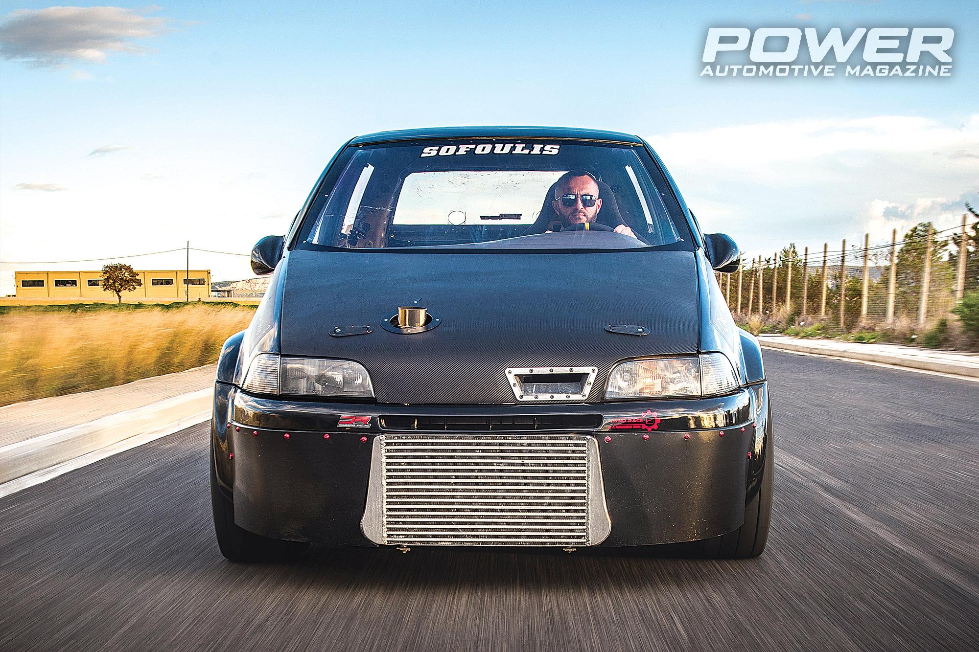Επίσης, όσο κακό είναι για την οδική συμπεριφορά το πολύ βάρος στον εμπρός άξονα, για προσθιοκίνητο κοντράδικο είναι καλό και εδώ πρέπει η κατανομή να είναι γύρω στο 80/20, αφού όλα τα μηχανικά μέρη είναι εμπρός και βαρύτερα από τα εργοστασιακά, ενώ πίσω είναι τσόφλι, με κομμένο πάτωμα και αλλαγμένο πίσω άξονα που είναι ακόμα ελαφρύτερος από τον κανονικό. Είναι και σηκωμένο πίσω τέρμα... λίγο είπα 80/20, ακόμα χειρότερο θα είναι. Ευτυχώς δεν θα χρειαστεί να στρίψει κάπου, αφού στις διαδρομές που κάνει ανάμεσα από τις κόντρες, απλά μετακινείται μόνο του, σιγά σιγά και κρυφά σαν αρουραίος που είναι. Όλα πάνω του συνάδουν λοιπόν στο να ξεκινήσει σωστά, να περάσει τη δύναμη στο δρόμο και να κερδίσει. Οι χρόνοι που έχουμε είναι από το Draggy του Γιώργου, που το έχει μόνιμα πάνω στο παρμπρίζ για να ξέρει τι γίνεται και αφού, όπως είδαμε σε προηγούμενη δοκιμή, είναι κοντά με τα δικά μας όργανα της Racelogic, δεν το μετρήσαμε εμείς, αφού λόγω απαγόρευσης της κυκλοφορίας και πρακτικά Drag-Spec θα ήταν μεγάλο ρίσκο να βγούμε με αυτό τον δράκουλα στο δρόμο.