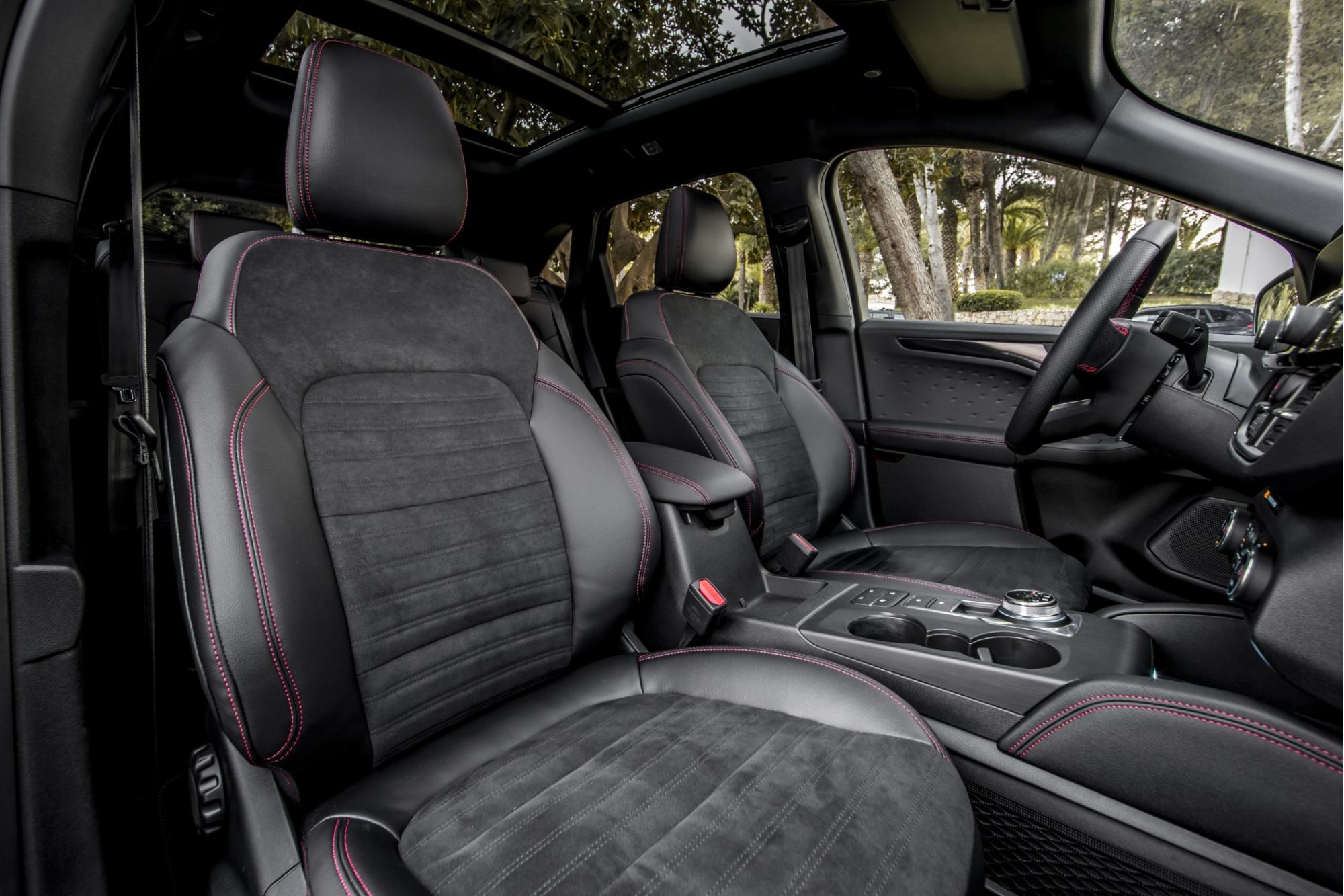 Η σπορτίφ διάθεση συνεχίζεται και στο εσωτερικό με τις ενθέσεις σε carbon look, επενδύσεις αλουμινίου και κόκκινες ραφές στα δερμάτινα καθίσματα. Τα υλικά που απαρτίζουν το εσωτερικό είναι μαλακά στην υφή, με πολύ καλή ποιότητα και με σωστή συναρμολόγηση. Ο δε εξοπλισμός είναι κάτι παραπάνω από πλούσιος και περιλαμβάνει οθόνη 12,3in στον ρόλο του ψηφιακού πίνακα οργάνων, καθώς και μια οθόνη αφής 8in στο κέντρο του ταμπλό, υπεύθυνη για την διαχείριση του infotainment SYNC3 της Ford, το οποίο υποστηρίζει λειτουργίες με gestures, σύνδεση μέσω Android Auto, Apple CarPlay και Bluetooth.