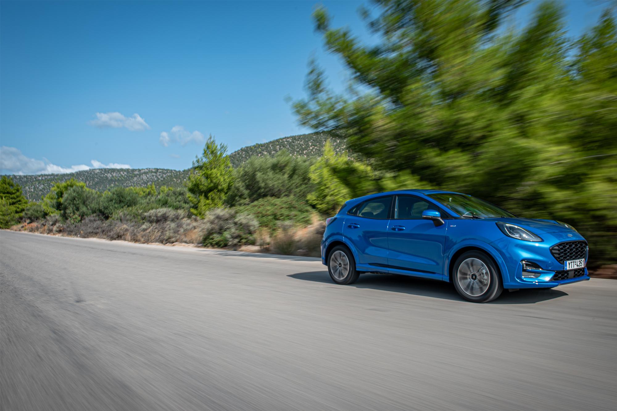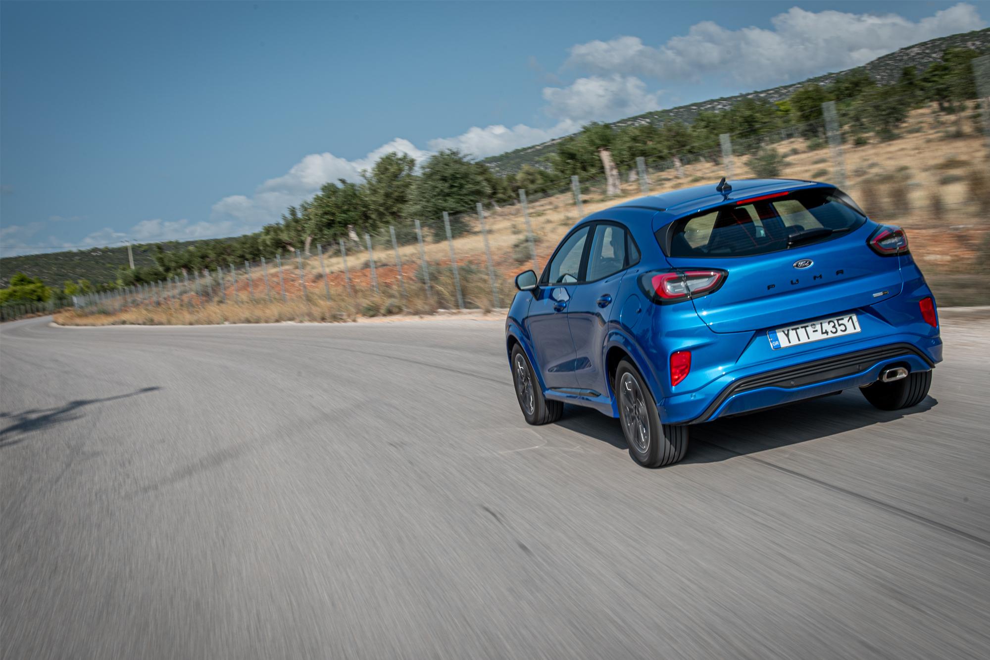 Το Ford Puma ST-Line αναφέρεται για όσους ζητάνε το «κάτι παραπάνω» όσον αφορά την οδήγηση, ακόμα κι αν το αμάξωμα απέχει 166mm από το έδαφος. Διαθέτει την καλύτερη οδική συμπεριφορά από όλα τα μικρά SUV, σε σημείο που πολλές φορές ξεχνάς ότι δεν οδηγείς hatch-back. Τα καθίσματα της έκδοσης ST-Line χάνουν την εξαιρετική λειτουργία μασάζ που διαθέτουν τα Puma Titanium, όμως στηρίζουν πιο σωστά το σώμα χάρη στα ενισχυμένα «πλαϊνά» τους. Η θέση οδήγησης είναι εξαιρετική, αφού διαθέτεις πολύ καλή ορατότητα προς όλες τις κατευθύνσεις, χωρίς να κάθεσαι υπερβολικά ψηλά. Η λειτουργία του χιλιάρη κινητήρα είναι ιδιαίτερα πολιτισμένη και δύσκολα κάποιος αντιλαμβάνεται την τρικύλινδρη αρχιτεκτονική του, αφού απουσιάζουν κάθε είδους κραδασμοί που συναντάμε σε αντίστοιχα σύνολα μικρού κυβισμού. Αυτό οφείλεται στις ειδικά σχεδιασμένες βάσεις του κινητήρα, αλλά και στο άριστο ζύγισμα του στροφάλου, ο οποίος χρησιμοποιεί έξι αντίβαρα και τέσσερα κουζινέτα. Το ηλεκτρικό σύστημα συνεργάζεται συνεχώς με τον κινητήρα για να παρέχει ροπή μέχρι 5,5kgm, συμπληρώνοντας την ισχύ και μειώνοντας την κατανάλωση, με τη μέση τιμή να κυμαίνεται μεταξύ 7-7,5lt/100km. Ο κινητήρας με την πλούσια ροπή συνεισφέρει στη διασκεδαστική συμπεριφορά του Puma. Ανεβάζει στροφές με όρεξη, έχει σπορτίφ ήχο και επαρκή ισχύ για να αναδείξει το εξαιρετικό πλαίσιο. Ο επιλογέας του κιβωτίου των έξι σχέσεων είναι απολαυστικός, με σαφές κούμπωμα, θυμίζοντας τα κορυφαία σπορ hatch-back, όπως το Fiesta ST. Το τιμόνι είναι γρήγορο και άμεσο, με μεστή πληροφόρηση και σου δίνει αυτοπεποίθηση να εκμεταλλευτείς κάθε χιλιοστό πρόσφυσης των ελαστικών του. Το Puma ST-Line είναι ευέλικτο, αλλάζει ταχύτατα κατεύθυνση και ακολουθεί «πειθήνια» την τροχιά του οδηγού. Η ανάρτηση είναι σημαντικά πιο σφιχτή και παρότι δεν διαθέτει την εντυπωσιακή κύλιση που προσφέρει το Titanium, μειώνει σε μεγάλο βαθμό τις κλίσεις του αμαξώματος στις στροφές. Ακόμα και έτσι οι επιβάτες δεν θα δυσανασχετήσουν ποτέ, με το Puma να διαθέτει μοναδική σταθερότητα για αυτοκίνητο της κατηγορίας B-SUV. Τα φρένα ικανοποιούν ακόμα και τον απαιτητικό οδηγό και δύσκολα θα καταφέρει κανείς να τα κουράσει. Όσο γρήγορα και να του ζητήσεις να στρίψει, θα ανταποκριθεί πιστά, με το άμεσο και ακριβές τιμόνι του να σε γεμίζουν αυτοπεποίθηση και το ESP να παραμονεύει για την υπερβολή, όπου θα σε επαναφέρει στην τάξη χωρίς να σου κόψει εντελώς το ρυθμό.