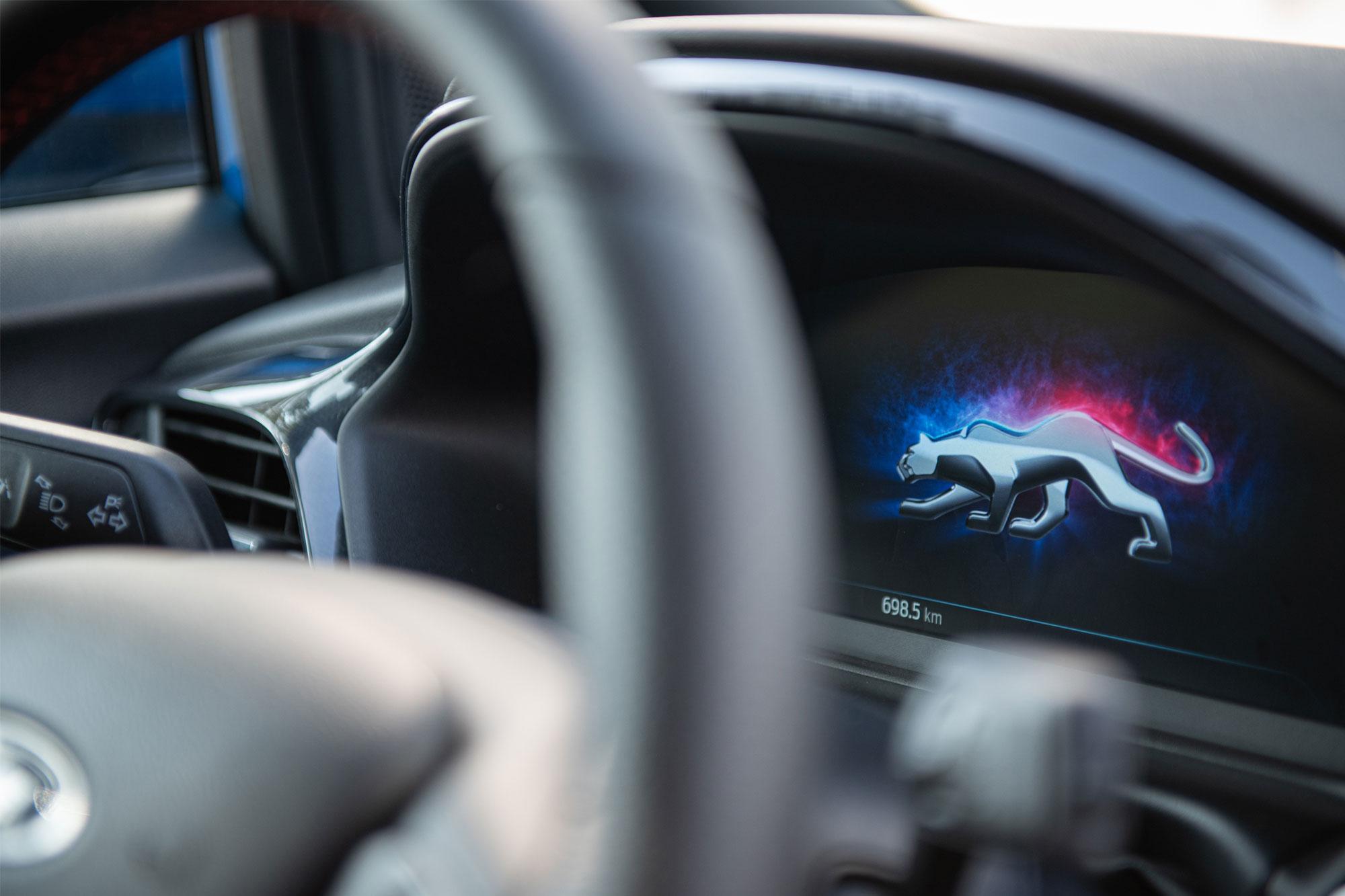Το εσωτερικό του Puma είναι αυτό που γνωρίζουμε φυσικά από το Fiesta και παρότι δεν είναι τόσο ευφάνταστο σχεδιαστικά όσο το αμάξωμα του πανέμορφου μικρού Crossover, παραμένει ωστόσο σύγχρονο, αρκετά ποιοτικό και εξαιρετικά εξοπλισμένο. Ο έλεγχος όλων των συστημάτων γίνεται από την μεγάλη οθόνη αφής των 8 ιντσών μέσω του εύχρηστου συστήματος SYNC 3 της Ford. Παράλληλα, ο ψηφιακός πίνακας οργάνων 12,3in είναι πανέμορφος, μοντέρνος, με πολύ ευανάγνωστες ενδείξεις και διαφορετικό layout ανάλογα με ποιο προφίλ οδήγησης έχει επιλέξει ο οδηγός. Τα καθίσματα τιμούν το λογότυπο ST-Line παρέχοντας επαρκή πλευρική στήριξη χωρίς να μειώνουν την άνεση, ενώ οι κόκκινες ραφές στο εσωτερικό προσφέρουν την απαραίτητη σπορ διάθεση.