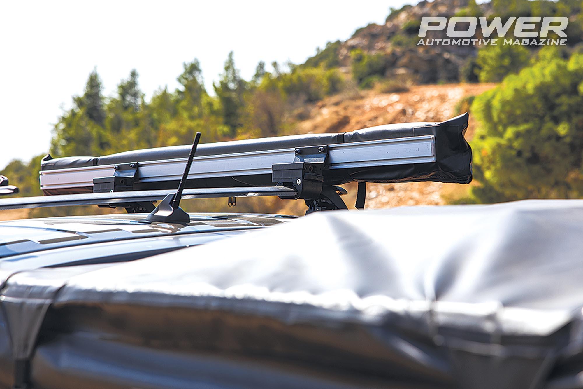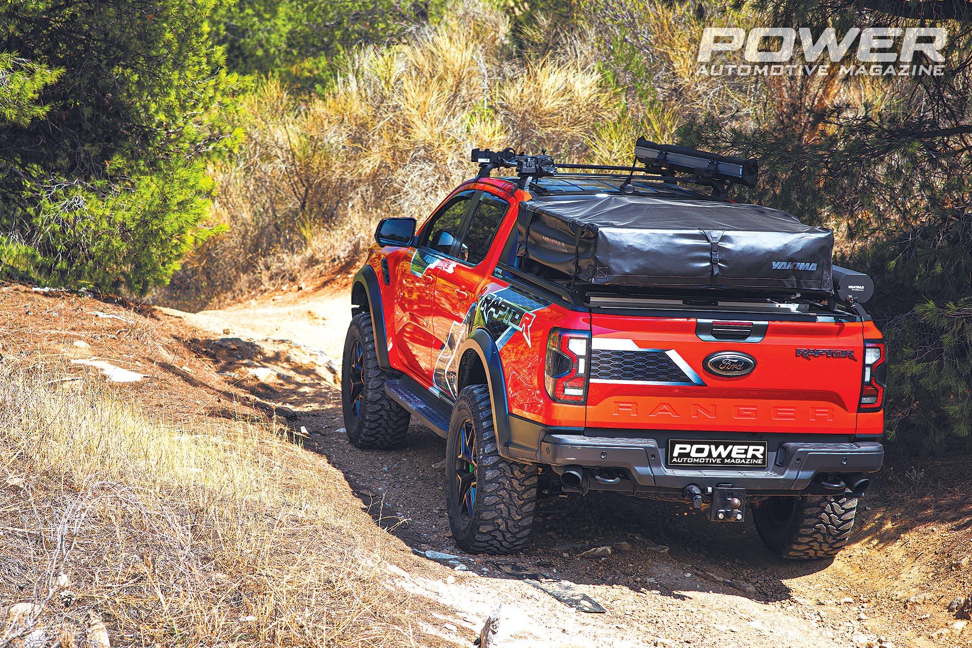 Εξωτερικά από την άλλη είναι φορτωμένο με πολλά καλούδια, με τον αεραγωγό στο καπό της Rhino να του δίνει μια πιο άγρια όψη και τον εργάτη με την βάση του από την Rival να συμπληρώνει την εικόνα. Στην οροφή έχει LED μπάρα της Strands, ενώ είναι εξοπλισμένο και για χρήση Overland σε περίπτωση που χρειαστεί να διανυκτερεύσει σε καμία ερημιά, με μπάρες και σκηνή οροφής της Yakima, δεξαμενή νερού και τέντα οροφής επίσης της Yakima. Το χρώμα του προστατεύεται από γρατσουνιές, πέτρες και κλαδιά με προστατευτική μεμβράνη της Llumar, από την οποία προέρχονται και οι φιμέ μεμβράνες στα παράθυρα. Πολλαπλών χρήσεων λοιπόν το Raptor του Ηλία, αφού πλέον κάνει για τα πάντα, για ταξίδι, για off roading, για γκάζι, για σωστικό συνεργείο, ακόμα και για camping.