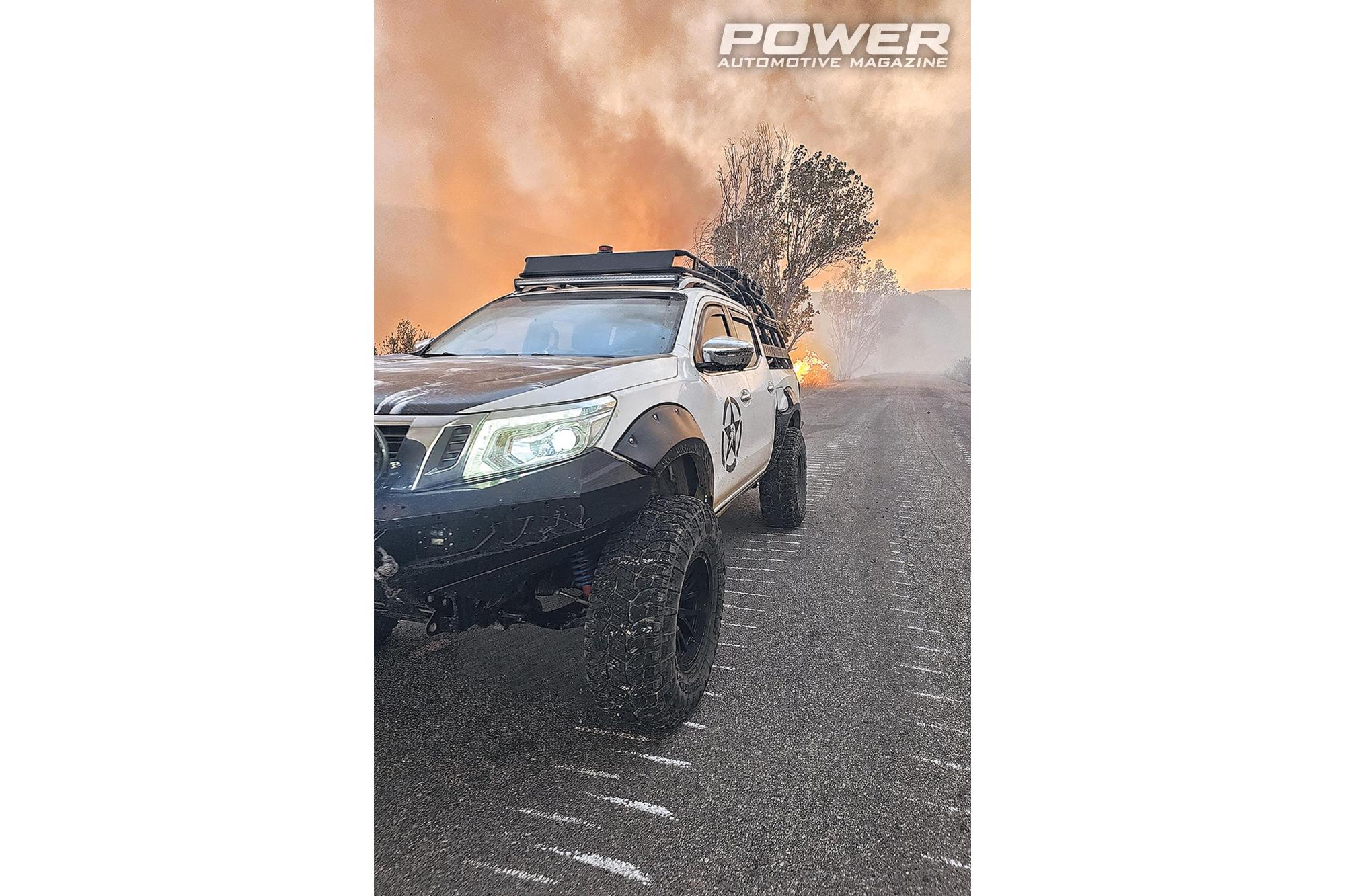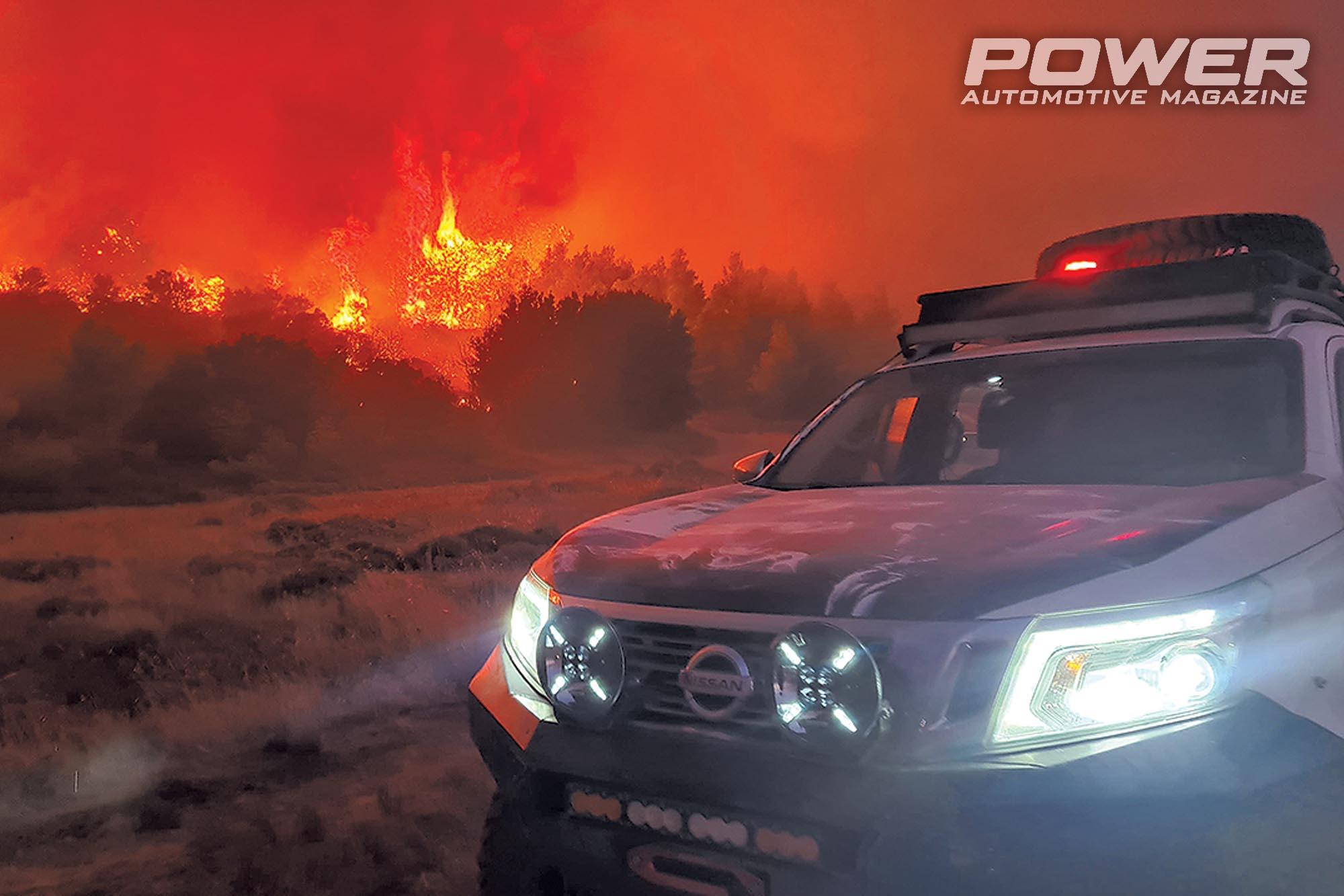 Δεν τα λυπούνται καθόλου, πραγματικά τα βλέπεις πού πηγαίνουν και τι κάνουν από έξω και λες “τώρα θα το τουμπάρει και θα ψάχνουμε γερανό”. Το Raptor ο Ηλίας το λιώνει στο γκάζι, στα χιόνια και τους χωματόδρομους, ενώ το άλλο, το δύσμοιρο, δεν πάει καν από τον δρόμο, το περνάει ο Αλέξανδρος από όπου να ‘ναι. Μέσα από κλαδιά, βάτα, βράχια, γενικά όπου υπάρχει φωτιά, υπάρχει και ένα λευκό Navara να ρίχνει νερό μαζί με τα πυροσβεστικά, για να μην πω πως τις περισσότερες φορές έχει φτάσει πρώτο και έχει πάει σε σημείο που δεν μπορούν να φτάσουν αυτά. Είναι σαν ένα πολιτικό Unimog, με δική του δεξαμενή και αντλία, που μπορεί να φτάσει στα πιο δύσβατα σημεία και να προλάβει ή να περιορίσει την φωτιά. Αν μπορούσατε να το δείτε από κοντά, τα σημάδια που έχει γύρω του από τα περάσματα μέσα στα δάση και από το θερμικό φορτίο, θα καταλαβαίνατε αμέσως τι έχει τραβήξει. Μέχρι και τρύπες από καύτρες που έπεσαν πάνω του έχει στις πλαστικές βαλίτσες της οροφής, στις οποίες μεταφέρει μάσκες οξυγόνου. Ακόμα και ο πίσω άξονας έχει στραβώσει από το βάρος του νερού και τους δύσβατους δρόμους και έχει αποκτήσει μια τυχαία γωνία camber, αλλά ευτυχώς όχι αρκετή για να βρίσκουν μέσα τα ημιαξόνια. Θα τον είχε αλλάξει αμέσως ο Αλέξανδρος, αν δεν είχε στα σκαριά μια τρελή ιδέα, να το μετατρέψει σε τριαξονικό 6x6 για να σηκώνει περισσότερο νερό και να μην κολλάει πουθενά.