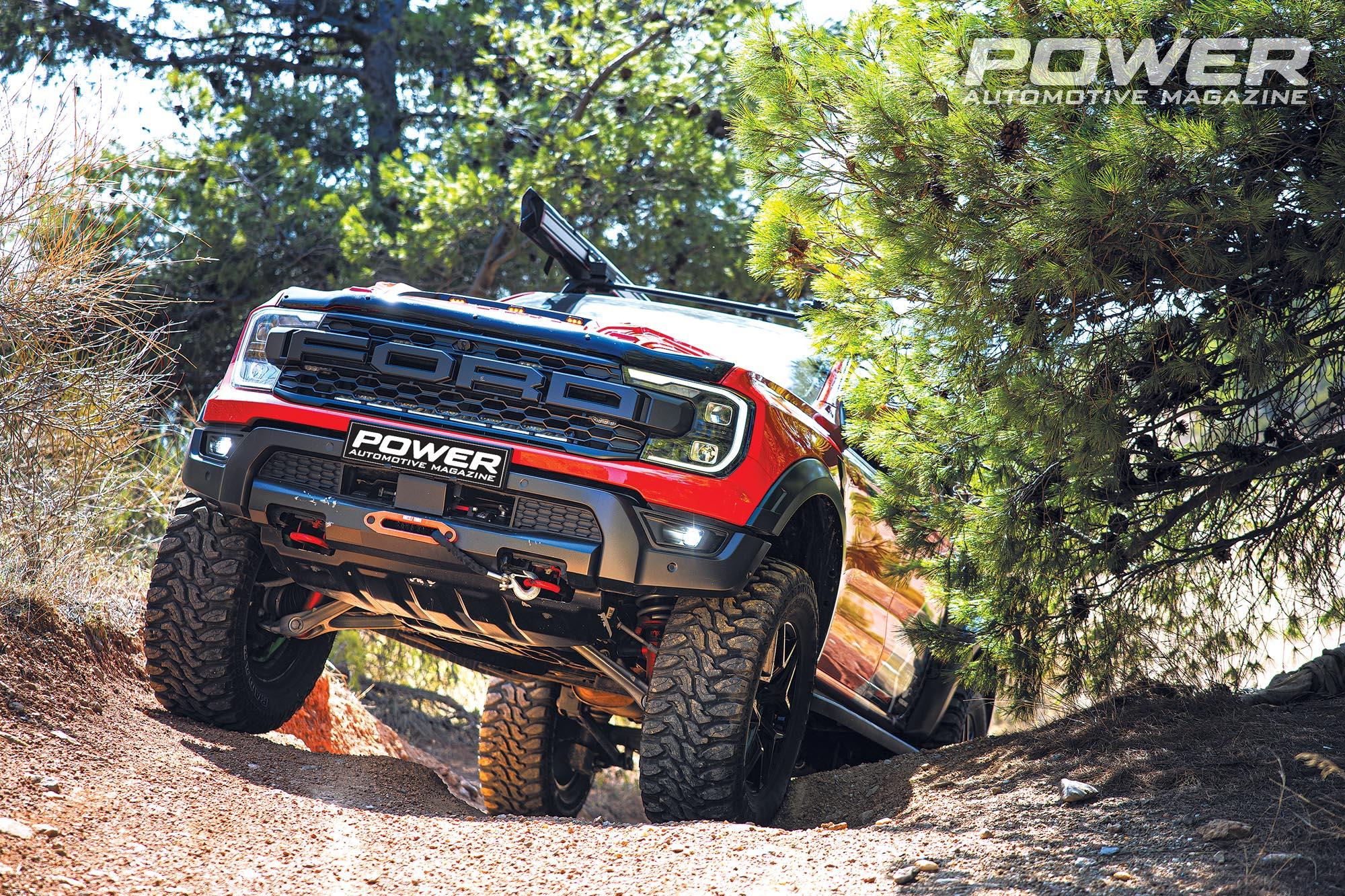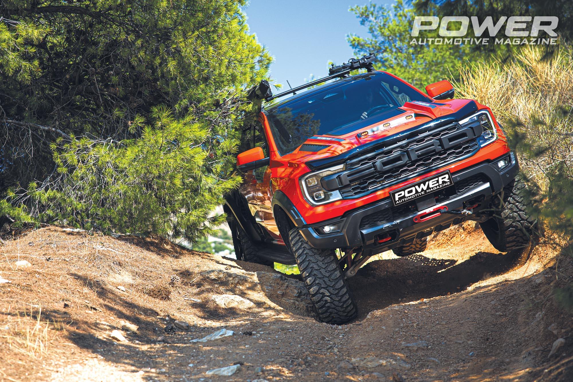 Για να χωρέσουν φυσικά χρειάστηκαν και οι ανάλογες ζάντες, με τις πανέμορφες Niche Vice διαστάσεων 9j x 20in με offset +25 να αφήνουν τον κατάλληλο χώρο. Τα «τρακτερωτά» λάστιχα Radar Renegade R7 M/T, με διάσταση 37/13,5/20, καλούνται να πληρώσουν την νύφη, αφού τέτοιο φρενάρισμα δεν θα το περιμένουν, αλλά το ABS είναι εκεί για να τα σώσει από το να σκορπίσουν τα “τακούνια” τους σε καμία Αττική οδό. «Έντο» θα κάνει πλέον, με τα ψηλότερα ελατήρια της Ford Pro και το Lift kit της Mamas Wheels να του δίνουν μεγαλύτερο ύψος, που σε συνδυασμό με τους μεγαλύτερους τροχούς κάνουν το εργοστασιακό Raptor δίπλα του να δείχνει σαν «απλό» Ranger. Στο εσωτερικό του οι αλλαγές περιορίζονται σε ένα carbon τιμόνι από τα αξεσουάρ της Ford Performance με carbon paddles.