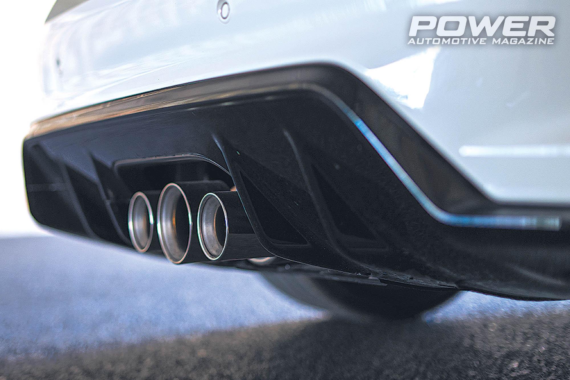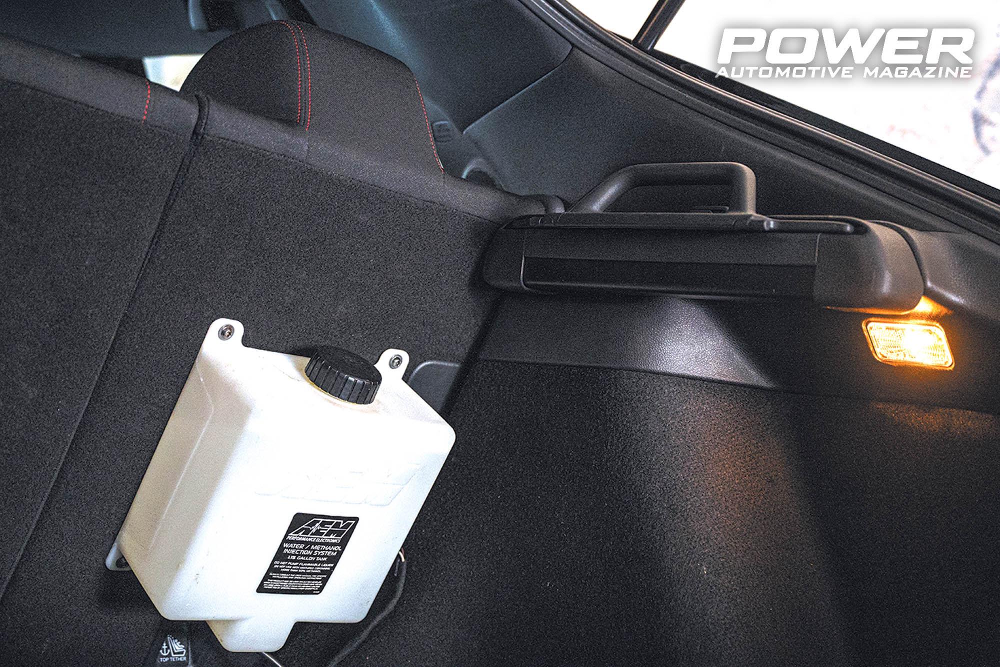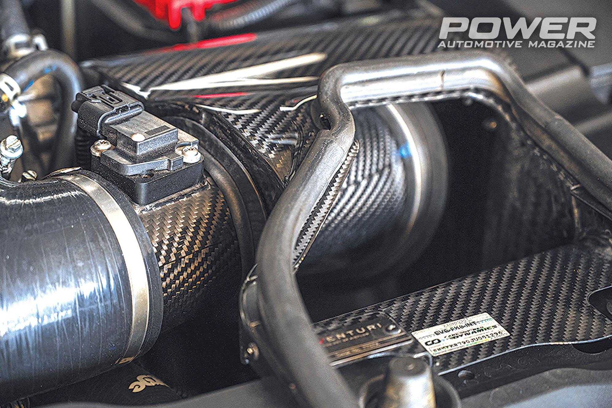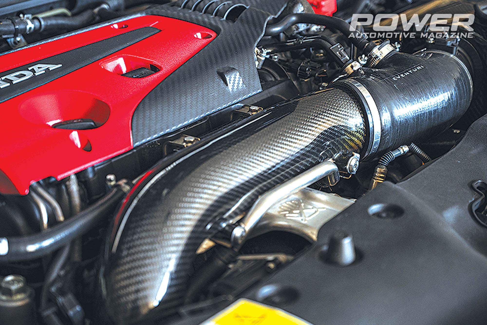 Η εξάτμισή του είναι η Q300 της Invidia, με διάμετρο 76mm, με το downpipe να προέρχεται από την MAP Performance που διαθέτει και καταλύτη 200cpsi. Από την μεριά της εισαγωγής, η αναπνοή του βελτιώθηκε με το Eventuri Turbo Tube V3 το οποίο έχει διάμετρο 88mm αντί για τα 63mm του εργοστασιακού σωλήνα και μαζί με την ανθρακονημάτινη εισαγωγή cold air intake της Eventuri δίνουν σχεδόν 35 άλογα στις μεσαίες στροφές και 23Ps στην μέγιστη τιμή σε εργοστασιακό setup, πόσο μάλλον σε αυτό που έχει ακόμα πιο αυξημένες απαιτήσεις σε αέρα. Το intercooler είναι της Wagner, διαστάσεων 670mm x 183.4mm x 125mm, με χωρητικότητα 15.4lt, 140% περισσότερη από αυτή του εργοστασιακού και με 91% μεγαλύτερη επιφάνεια κυψελών. Το ψυγείο νερού είναι επίσης aftermarket της Megan Racing, ενώ η ψύξη ολοκληρώνεται με το kit ψεκασμού νερού-μεθανόλης AEM V3, με nozzle 500cc που ψεκάζει αμέσως πριν την πεταλούδα στο High Volume Intake pipe, διατομής 80mm της PRL.