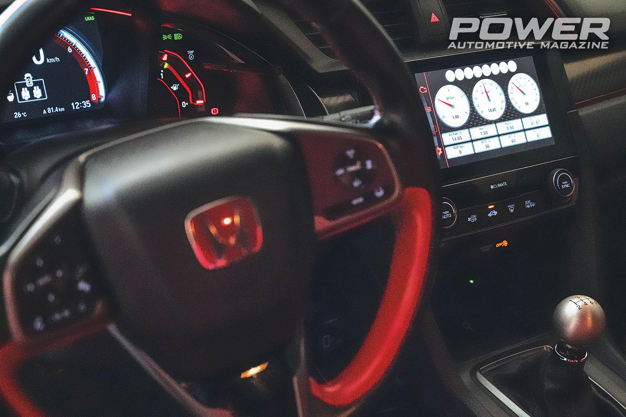 Ο Κώστας έχει κάνει αμέτρητες αλλαγές στο setup του FK8 και αυτός είναι ο λόγος που έχει ανέβει στην Αθήνα για ρυθμίσεις στο dyno της GearTech 11 φορές μέσα σε ένα χρόνο! Φοράει plug&play εγκέφαλο Hondata Flash Pro και αισθητήρα air-flow meter CTR 500 της ίδιας εταιρείας που διαβάζει 60% περισσότερο αέρα (500g/s έναντι 300g/s του OEM). Ο προγραμματισμός έγινε από τον Γιώργο Ζόμπολα, όμως στο Dynapack δεν μπορούσαν να σηκώσουν πίεση πάνω από 1,6bar. Τα ευρωπαϊκά FK8 Type R έχουν άλλον εγκέφαλο από τα Αμερικάνικα και έπρεπε να περάσουν 3 μήνες με αλλεπάλληλη επικοινωνία με την Hondata (και φυσικά αμέτρητα logs) για να στείλουν στην Ελλάδα beta χάρτη για να «επιτρέπει» ο εγκέφαλος περισσότερη πίεση από 1,6bar. Το τελικό αποτέλεσμα δικαίωσε απόλυτα τόσο τον Κωνσταντίνο όσο και τον Γιώργο αφού το FK8 έβγαλε στο δυναμόμετρο 558,2wHp@6.150rpm στα 2bar.