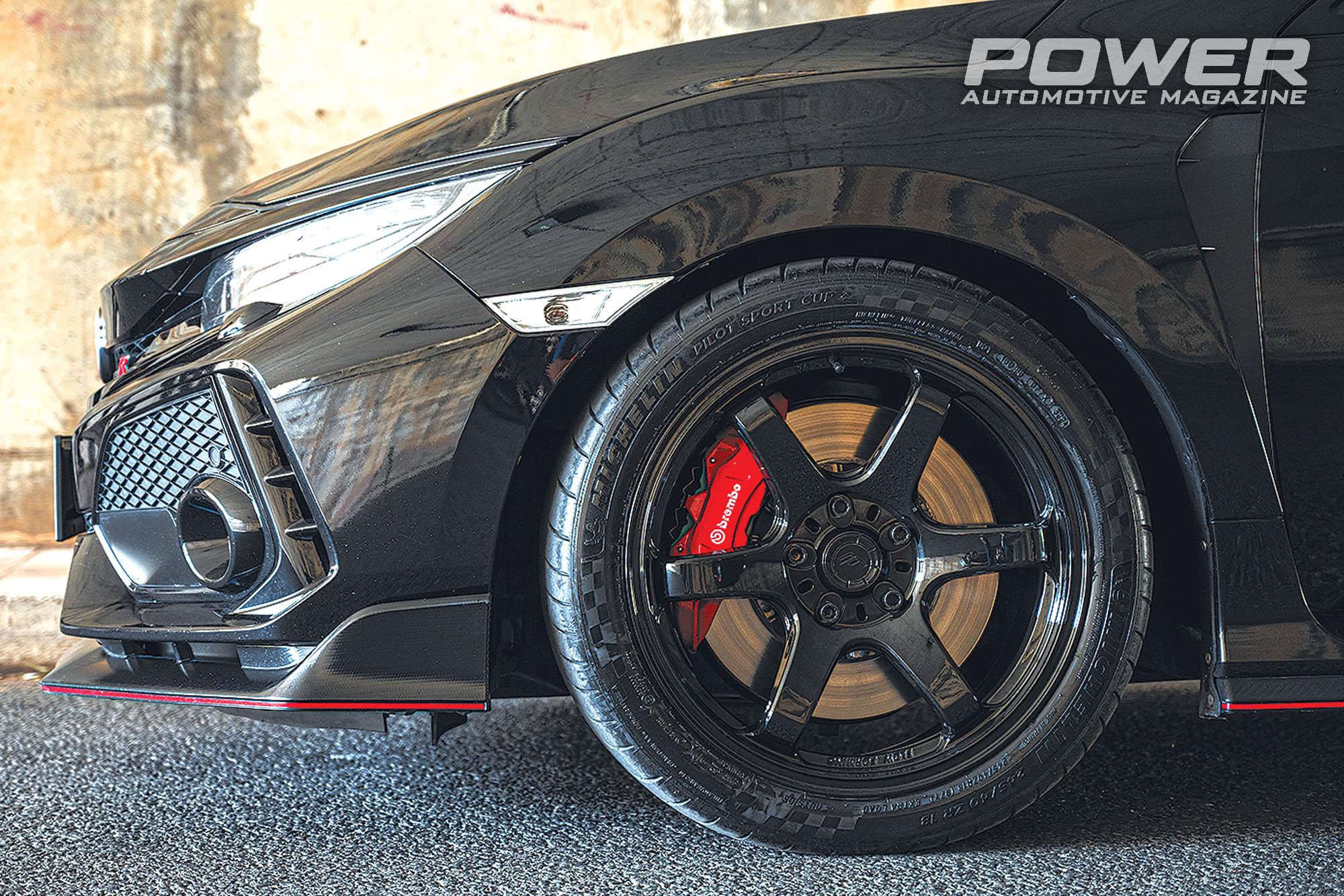 Όπως σωστά φαντάζεστε, το FK8 του Κωνσταντίνου είναι πλέον ειδικότερου σκοπού από πριν, αλλά όχι στον βαθμό που θα το περιμέναμε. Ναι μεν δεν παίζει πια να το στρίψεις κάπου με τέρμα γκάζι στην full πίεση, αλλά με προσεκτικό πάτημα, τον καλό προγραμματισμό από τον Γιώργο Ζόμπολα και το σταδιακό «χτίσιμο» της πίεσης, το αυτοκίνητο στρίβει εντυπωσιακά καλά. Τρομερή βελτίωση και σε στρίψιμο και σε άνεση είδε ο Κώστας από την αλλαγή των τροχών, αφού κατέβηκε 2 ίντσες από τις εργοστασιακές 20in σε 18άρες, με offset ET35 για να έρθουν πιο έξω και με τα Michelin Pilot Cup 2 να έχουν μπόλικο προφίλ για να ανταπεξέλθουν στους ελληνικούς δρόμους.