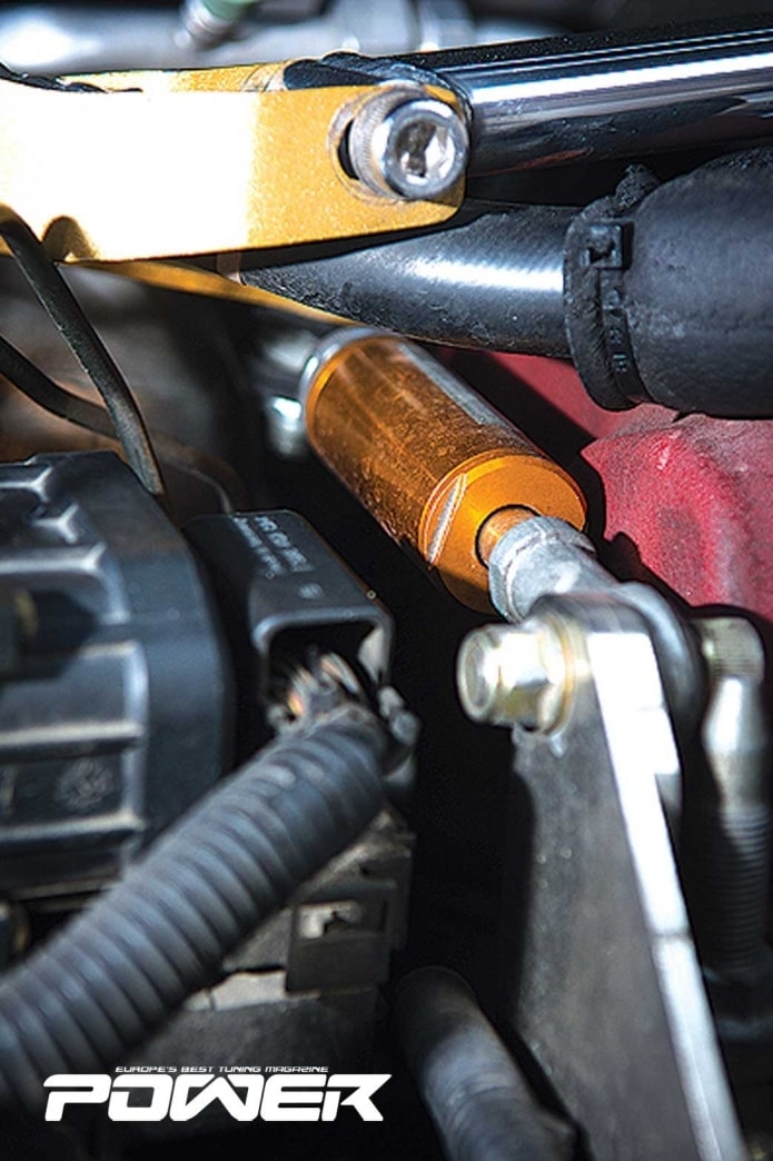 Θυμάστε που σας είπα ότι η εισαγωγή με τη μετώπη είναι Filler? Όταν την είδα, το πρώτο πράγμα που ρώτησα τον Δημήτρη ήταν, ρε συ, αυτό στο δρόμο δεν κροταλίζει? Όχι, μου είπε, αλλά δεν το πίστεψα, μιλάμε ότι το μοτέρ δεν θα έπρεπε να κουνάει χιλιοστό. Ε, δεν κουνούσε. Με μια βάση κινητήρα της Energy suspension, μια βάση σασμάν της Powerflex και το “κόντρα” αμορτισέρ της J’S Racing, ο Μητσάκος κυριολεκτικά «το έχτισε». Έβαλε και το βολάν από το ΕΡ3 Facelift που είναι τρυπητό και ζυγίζει 4,7kg αντί για τα 6,8kg του παλιού, και το δισκόπλατο το ξέχασε νορμάλ… Δημήτρη, θα αντέξει ή θα φάμε καμιά φόλα βραδιάτικα? Αντέχει, ρε, προχώρα. Να μην ξεχάσουμε να αναφέρουμε ότι οι εργασίες στο αυτοκίνητο της δοκιμής πραγματοποιήθηκαν στο 10sec Garage από τον Ιωάννη Δαλιανούδη.