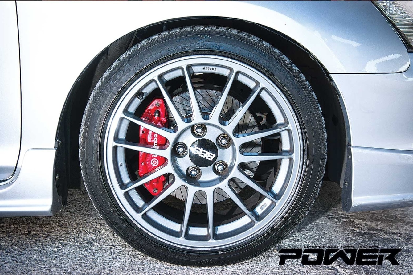 Εμφανισιακά, οι ζάντες είναι BBS 8Jx17in από Mitsubishi Evo IX και το carbon καπό είναι της Buddyclub και ζυγίζει 3kg λιγότερο από το εργοστασιακό.