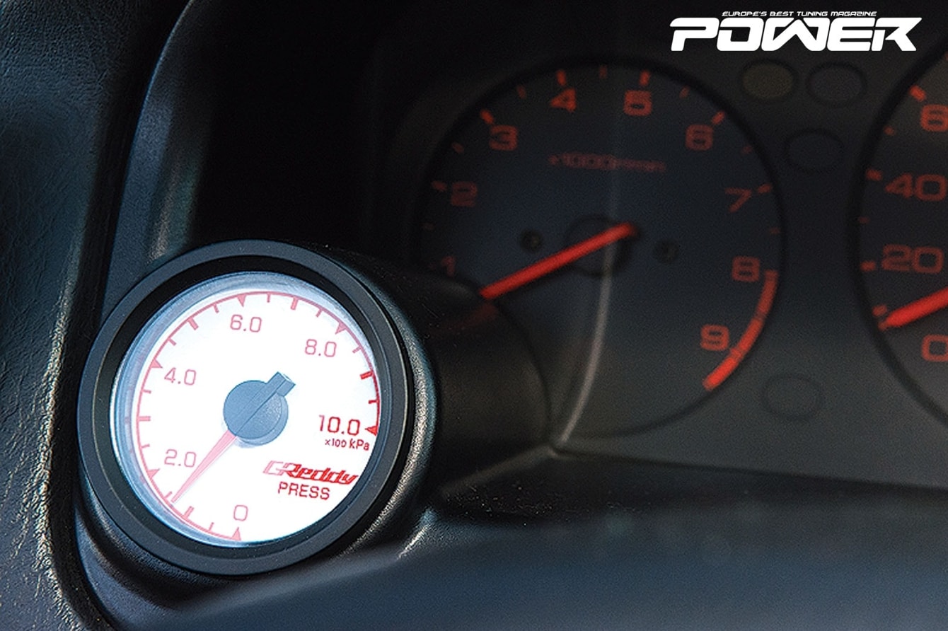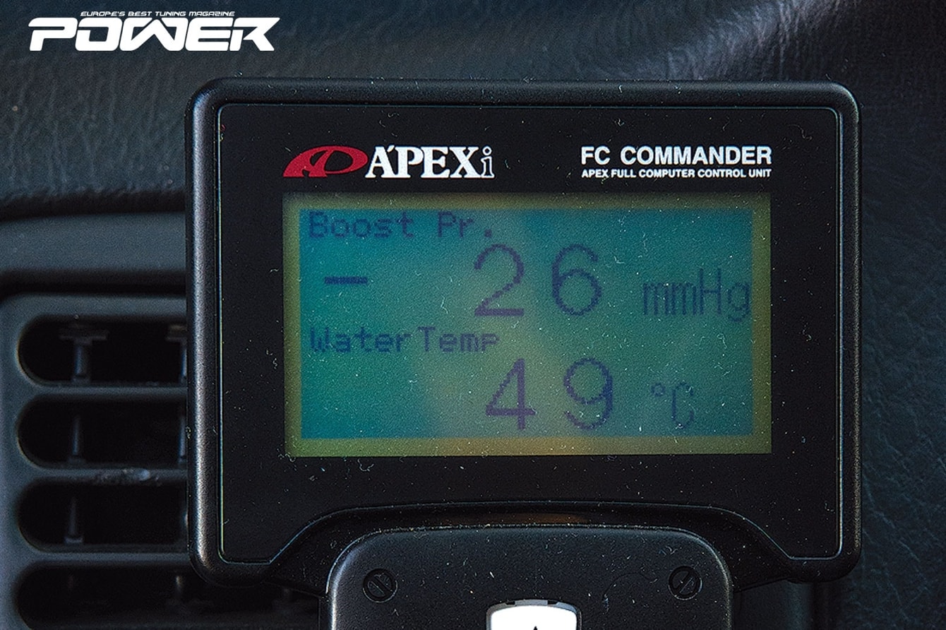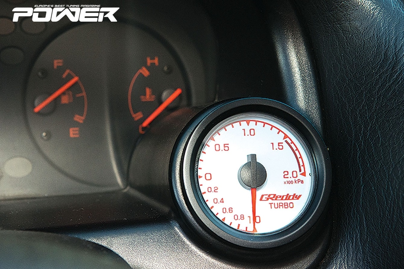 Στο εσωτερικό συναντάμε στο αριστερό μέρος της κονσόλας την μονάδα ελέγχου του PowerFC, αριστερά και δεξιά του πίνακα έχουν τοποθετηθεί δύο όργανα της GReddy, για την πίεση του λαδιού και για την πίεση του turbo, ενώ ακριβώς μπροστά από τον επιλογέα ταχυτήτων δύο όργανα της Shadow μας πληροφορούν για την θερμοκρασία λαδιού και την θερμοκρασία των καυσαερίων.