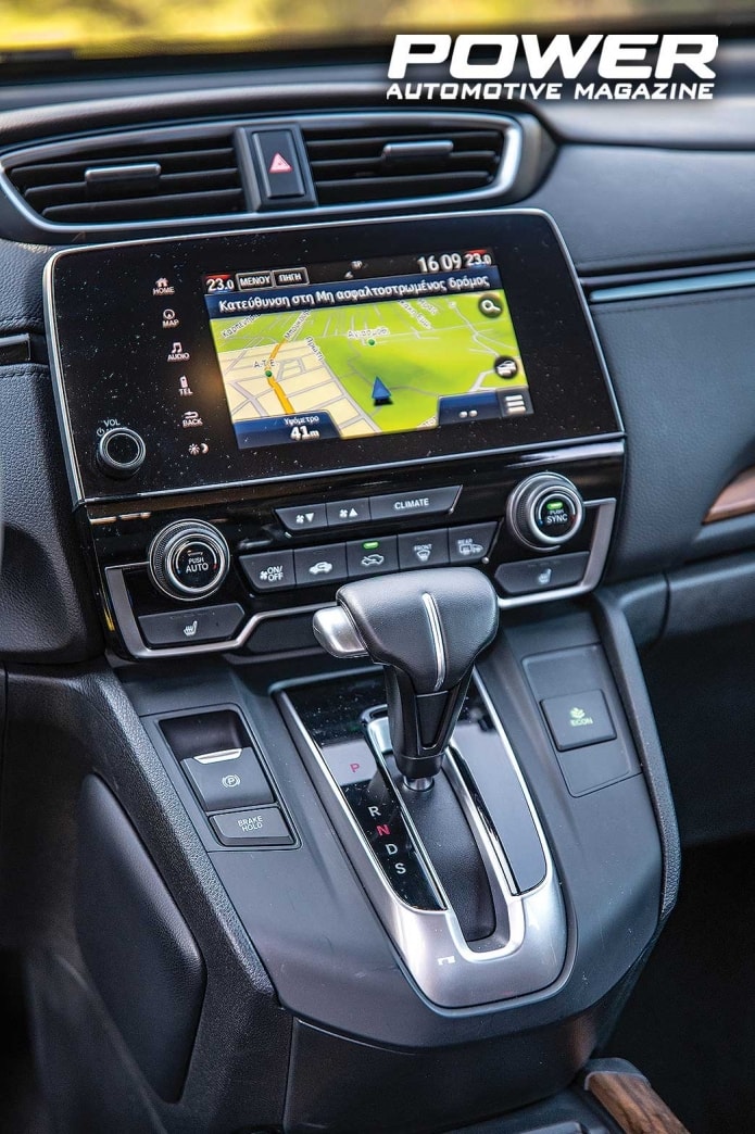 Το σύστημα τετρακίνησης, Real Time AWD with Intelligent Control, χρησιμοποιεί έναν πολύδισκο ηλεκτροϋδραυλικό συμπλέκτη ανάμεσα στο κιβώτιο και το πίσω διαφορικό, ώστε να μεταδίδει κίνηση πίσω μόνο όταν απαιτείται, σε ποσοστό που μπορεί να φτάσει το 50%, το μέγιστο δηλαδή που μπορεί να φτάσει ένα τέτοιο σύστημα. Η κρεμαγιέρα του έχει διπλό πηνίο για καλύτερη αίσθηση τιµονιού αλλά και μειωμένους κραδασμούς από το δρόμο στα χέρια του οδηγού, ενώ τα SFRD αµορτισέρ της Showa, µε σύστηµα µεταβλητής απόσβεσης, φροντίζουν για το υψηλό επίπεδο άνεσης που απολαμβάνουν οι επιβάτες. Όλα αυτά, σε συνδυασμό με το πολυτελές σαλόνι -ας έλειπαν οι dummy ξύλινες επενδύσεις, «φτηναίνουν» σε εικόνα ένα ακριβό μηχανολογικά αυτοκίνητο- κάνουν το CR-V ένα ποιοτικό σύντροφο τόσο για το ταξίδι όσο και για την άνετη κίνηση στους καρόδρομους της Αθήνας. Το κιβώτιο συνεχών μεταβαλλόμενων σχέσεων λειτουργεί άψογα κάτω από όλες τις συνθήκες και τα φορτία, μόνο που σε αυτούς (σαν κι εμένα) που δεν έχουν συνηθίσει σε τέτοιου είδους μετάδοση, θα πάρει λίγο καιρό να το συνηθίσουν και να μην τους φαίνεται ότι πατινάρει συνεχώς ο δίσκος που δεν υπάρχει ή ότι οδηγούν ένα αυτόματο κιβώτιο με torque converter που δεν κάνει όμως ποτέ lock up σε κάποια ταχύτητα. Μπορεί να μοιάζουν κάπως περίεργα αυτά που σας λέω, όταν όμως οδηγείς ένα αυτοκίνητο και ξέρεις πώς δουλεύει το κάθε τι, το CVT θα σου δημιουργήσει ένα μικρό άγχος στην αρχή. Κρατάει σταθερές τις στροφές, ενώ τα χιλιόμετρα ανεβαίνουν συνεχώς και το στροφόμετρο είναι κολλημένο σε ένα σημείο ανάλογα με το πόσο βαθιά πατάς το γκάζι. Στη θέση Sport, λειτουργεί με άλλο πρόγραμμα και τις κρατάει λίγο ψηλότερα αναλογικά, έχοντας και λίγο καλύτερη απόκριση. Συμπερασματικά, μπορώ να πω ότι αν και ακριβό, ειδικά στην έκδοση της δοκιμής που ξεκινάει από τα €38.550, είναι καλύτερο συνολικά από προτάσεις του «premium» ανταγωνισμού, γιατί το CR-V είναι premium εκεί που δεν φαίνεται. Τέλος, να τονίσω ότι κατασκευάζεται στην Ιαπωνία και όχι στην Αγγλία μαζί με το Civic, κάτι που ανεβάζει με τη σειρά του το κόστος, αλλά και την ποιότητα.