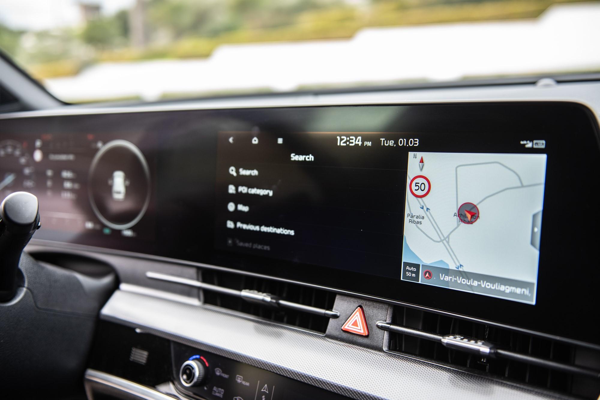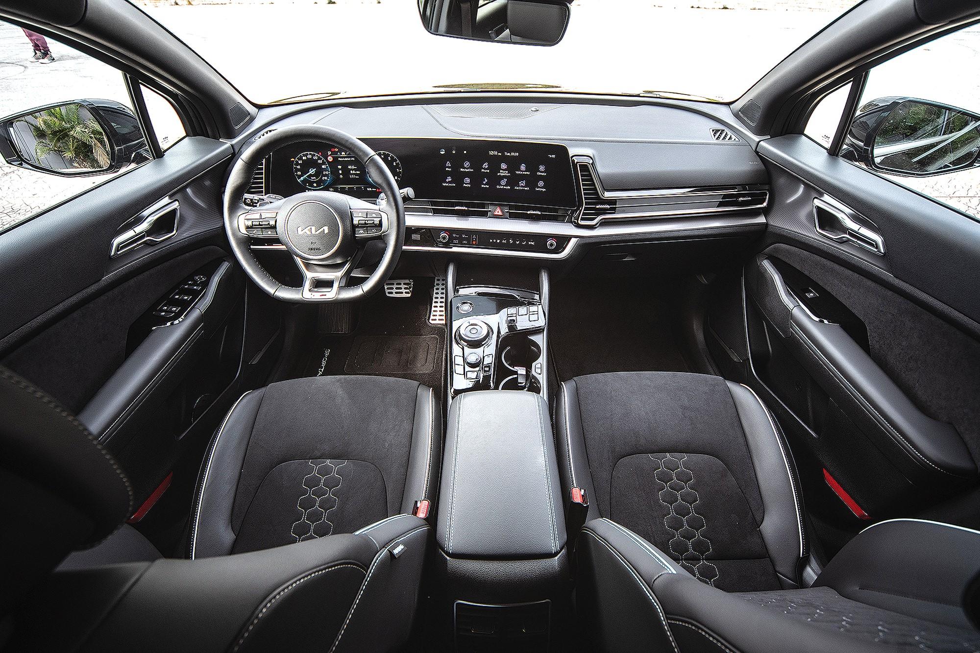Αντίστοιχα εντυπωσιακό με την εξωτερική εμφάνιση είναι και το εσωτερικό του Sportage. Οι δύο μεγάλες οθόνες των 12,3in υποδέχονται τον οδηγό, με τη μία στο ρόλο του πίνακα οργάνων και τη δεύτερη υπεύθυνη για τον έλεγχο του infotainment. Τα γραφικά στις οθόνες είναι πολύ όμορφα, ευανάγνωστα και ευκρινή, με φωτεινά χρώματα, ενώ το menu του infotainment, παρά τις πολλές επιλογές, είναι αρκετά εύκολο στο χειρισμό, με μεγάλα εικονίδια και γρήγορη απόκριση στο σύστημα αφής. Η hi-tech αίσθηση ενισχύεται με το σύστημα ασύρματης σύνδεσης smartphone μέσω της εφαρμογής Kia Connect, δίνοντας πρόσβαση σε βασικά στοιχεία του αυτοκινήτου και παρέχοντας τη δυνατότητα για over-the-air αναβαθμίσεις.