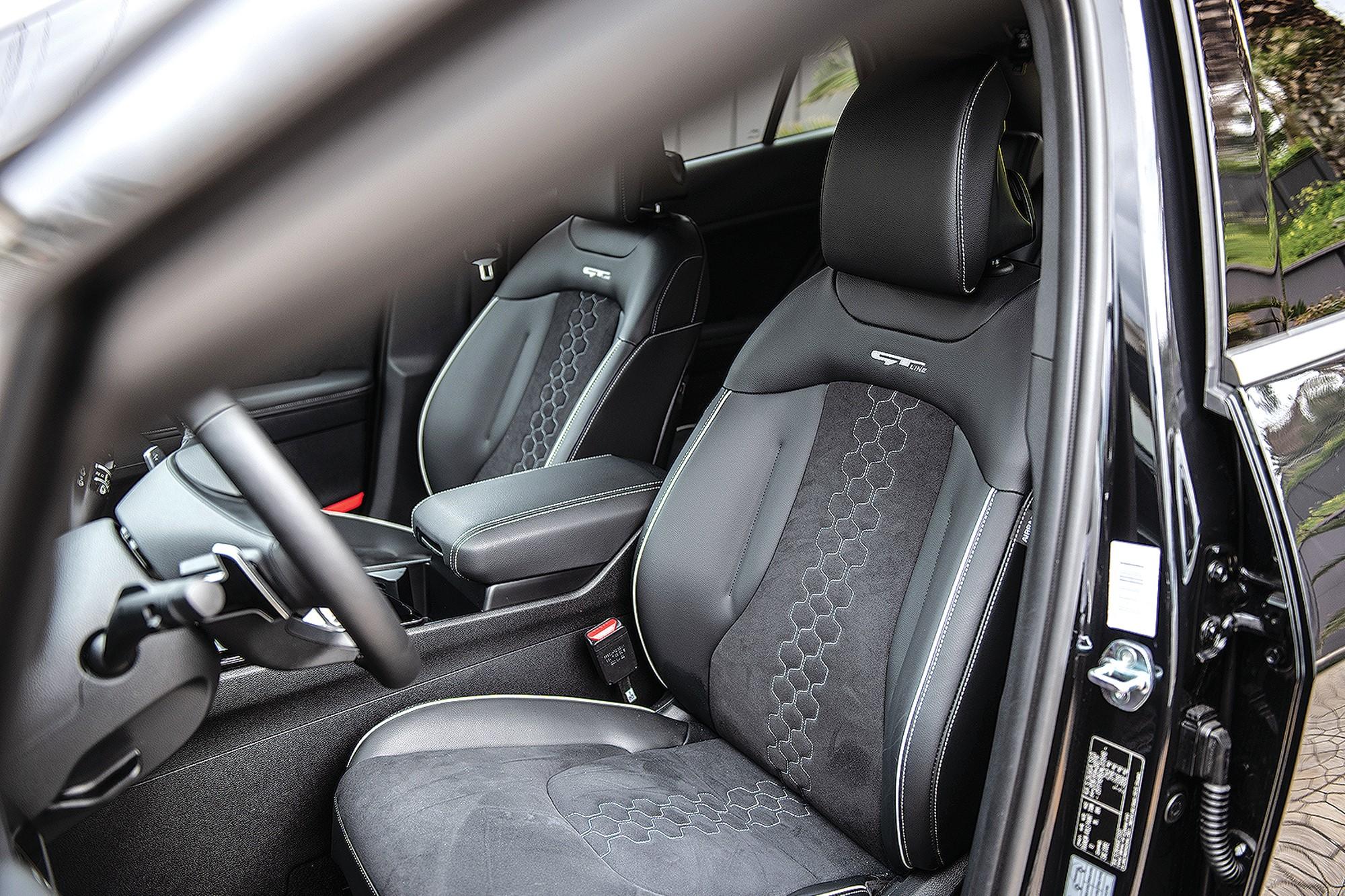 Η ποιότητα κατασκευής είναι σε υψηλό επίπεδο, με μαλακά στην υφή πλαστικά σε μεγάλο μέρος του ταμπλό και πιο σκληρά, αλλά καλής ποιότητας πλαστικά στα χαμηλότερα μέρη του ταμπλό. Η έκδοση GT-Line της δοκιμής διέθετε επενδύσεις καθισμάτων με συνδυασμό δέρματος και suede υφάσματος, με πράσινες ραφές, δίνοντας μία διαφορετική και premium αύρα. Στην κεντρική κονσόλα θα συναντήσουμε έναν περιστροφικό διακόπτη για το κιβώτιο ταχυτήτων και ακριβώς μπροστά μια μεγάλη θήκη για το κινητό, με δυνατότητα επαγωγικής φόρτισης. Τα μπροστινά καθίσματα είναι ιδιαίτερα άνετα, έχοντας σχετικά καλή πλευρική στήριξη, χωρίς να δικαιώνουν τις πιο σπορ απαιτήσεις της έκδοσης GT-Line, δεν κουράζουν όμως ακόμα και μετά από πολύωρη οδήγηση.