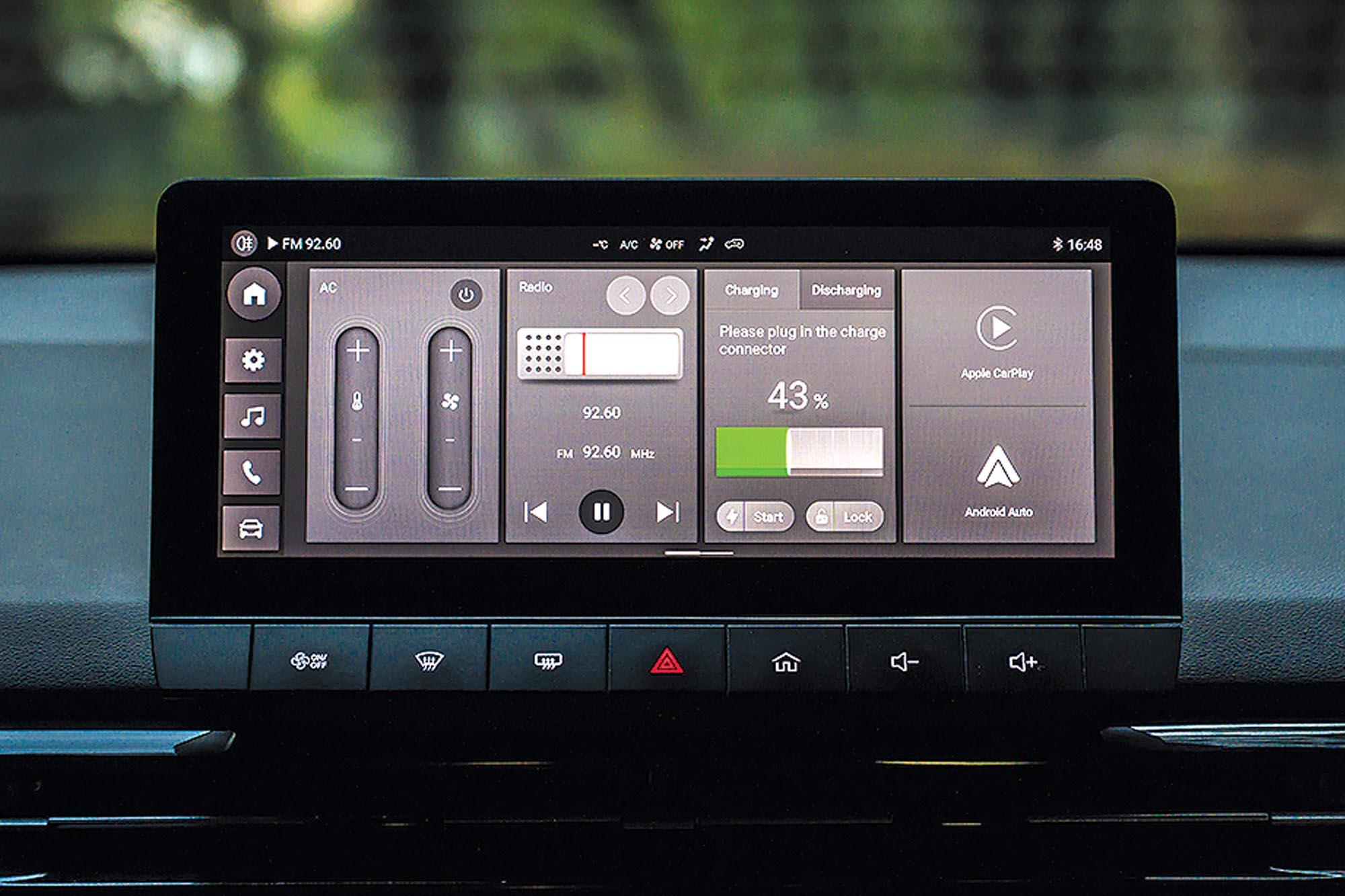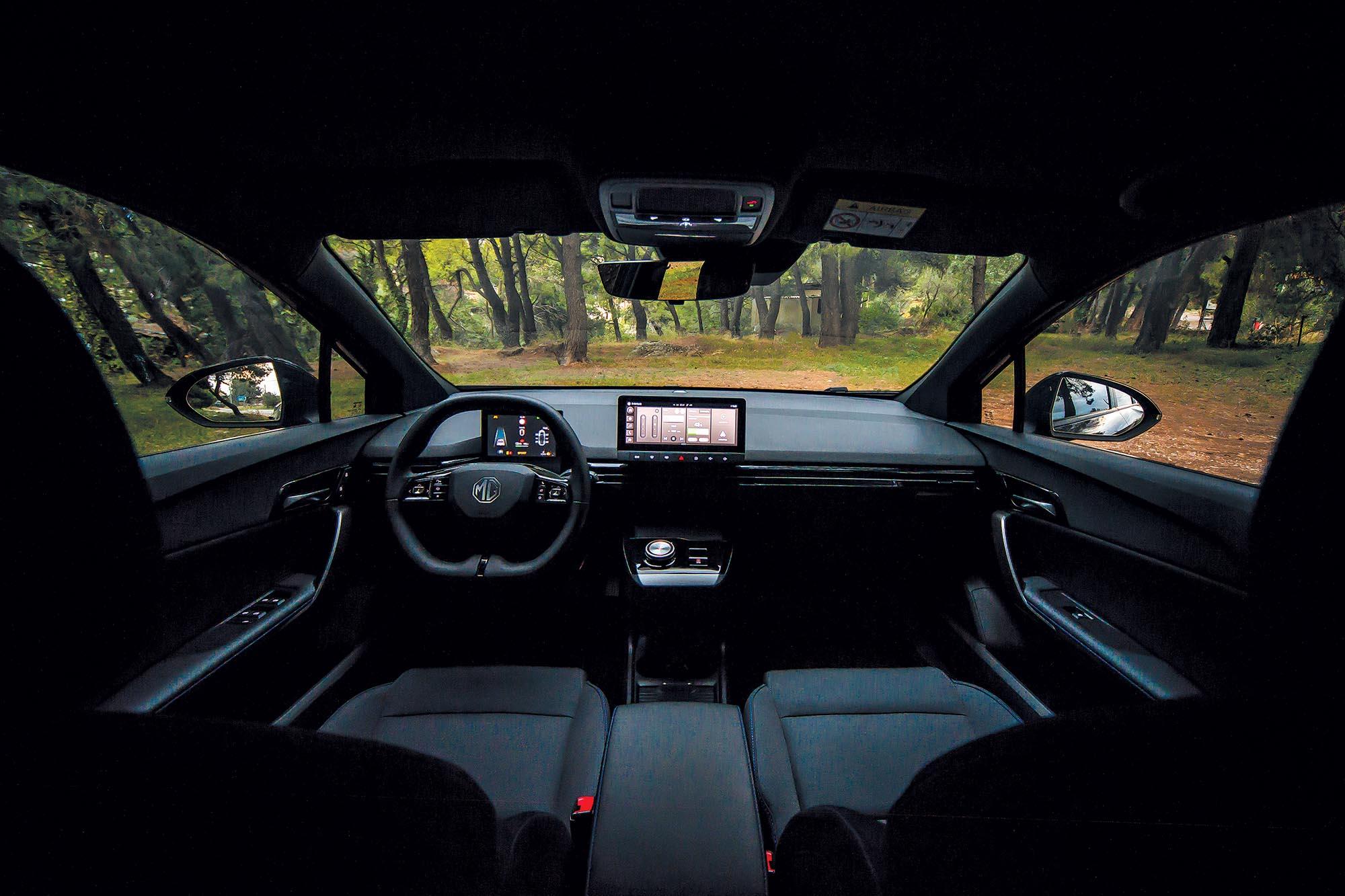 Το εσωτερικό σε εκπλήσσει ευχάριστα με την απλότητα και το επίπεδο της απτής του ποιότητας. Tα υλικά στα περισσότερα σημεία είναι πολύ προσεγμένα, με το φινίρισμα και την συναρμογή να κοντράρει στα ίσα τις ευρωπαϊκές προτάσεις της κατηγορίας. Ένα αφρώδες υλικό στο πάνω τμήμα των θυρών (εμπρός και πίσω), καλύτερα πλαστικά στα χαμηλά μέρη του ταμπλό και καλύτεροι διακόπτες παραθύρων και κεντρικής κονσόλας θα διαμόρφωναν μια ακόμα πιο premium συνολικά εικόνα, δεν ήταν αυτό όμως το ζητούμενο για το MG4. Άλλωστε χώρος για βελτιώσεις πάντοτε υπάρχει. Η εικόνα γενικά είναι σύγχρονη και όμορφη, με το κλασικό πλέον μοτίβο των δύο οθονών να ακολουθείται και εδώ. Ιδιαίτερη είναι και η διάταξη της κεντρικής κονσόλας, η «διχοτόμηση» της οποίας ωστόσο δεν είναι όσο πρακτική περιμένεις. Ο περιστροφικός επιλογέας από την άλλη είναι πολύ πρακτικός, όπως πρακτική -αν και δεν έχει πάντα την ίδια άμεση απόκριση- είναι η λογική της ευκολίας στη χρήση. Ο ψηφιακός πίνακας οργάνων των 7in είναι ευανάγνωστος και έχει όμορφα γραφικά, με το infotainment να έχει διαγώνιο 10,25in και να είναι κι αυτό πλήρες λειτουργιών και σχετικά εύκολο στη χρήση, αλλά είναι λίγο αργό σε απόκριση (συγκριτικά με άλλες προτάσεις του ανταγωνισμού) και δεν έχει προεγκατεστημένο σύστημα πλοήγησης.