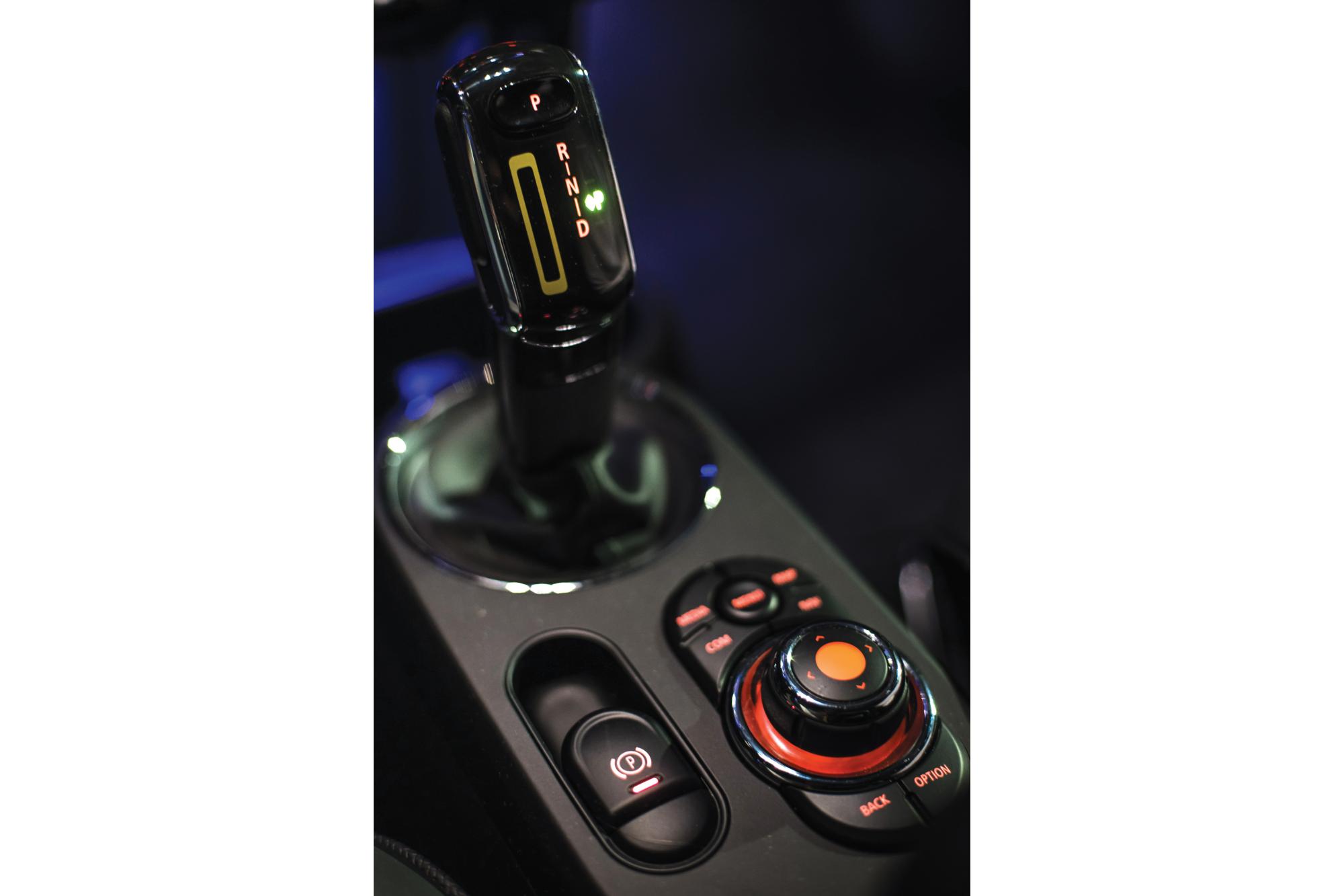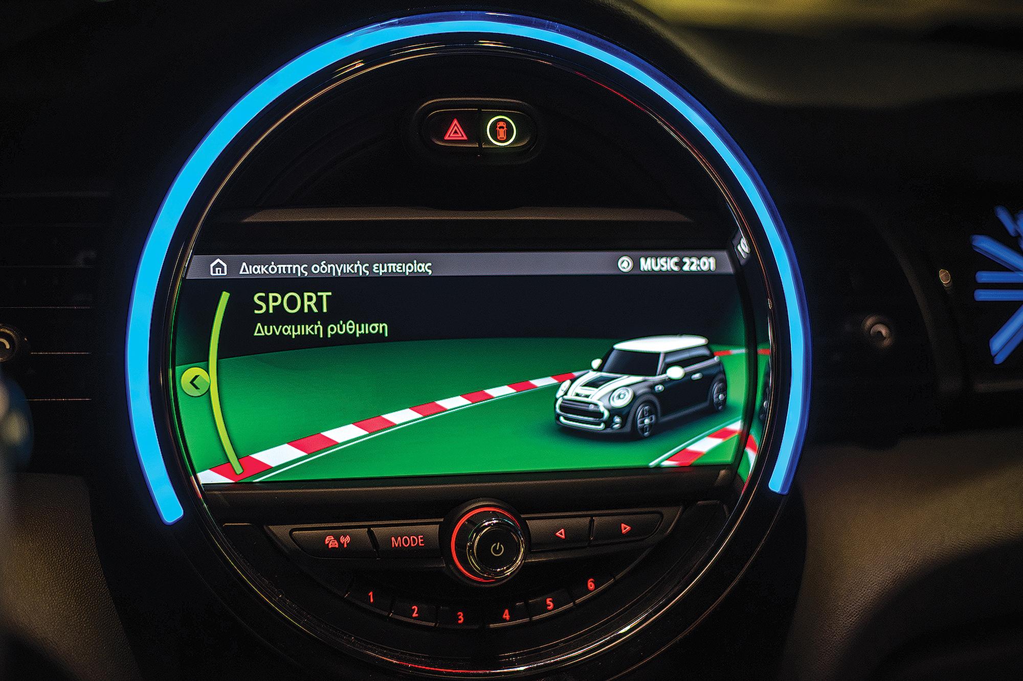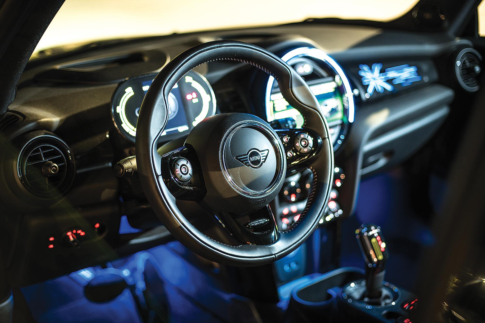 Στο εσωτερικό, η διαφορά βρίσκεται στον ψηφιακό πίνακα οργάνων πίσω από το τιμόνι που έχει σχήμα «στίβου», περιορισμένες δυνατότητες παραμετροποίησης, με το στροφόμετρο να έχει αντικατασταθεί από το όργανο που ενημερώνει για το ποσοστό ενέργειας της μπαταρίας και την ανάκτησή της. Η premium λογική σε υλικά και σχεδίαση, με διάφορες σπορ νότες, είναι και εδώ παρούσα, με τη μεγάλη οθόνη 8,8in να διατηρείται και να αναλαμβάνει την πλοήγηση και τη συνδεσιμότητα με κινητές συσκευές. Διαφορετικός είναι μόνο ο επιλογέας ταχυτήτων, που έχει διαφορετικό φινίρισμα σε σχέση με την υπόλοιπη MINI παρέα.
