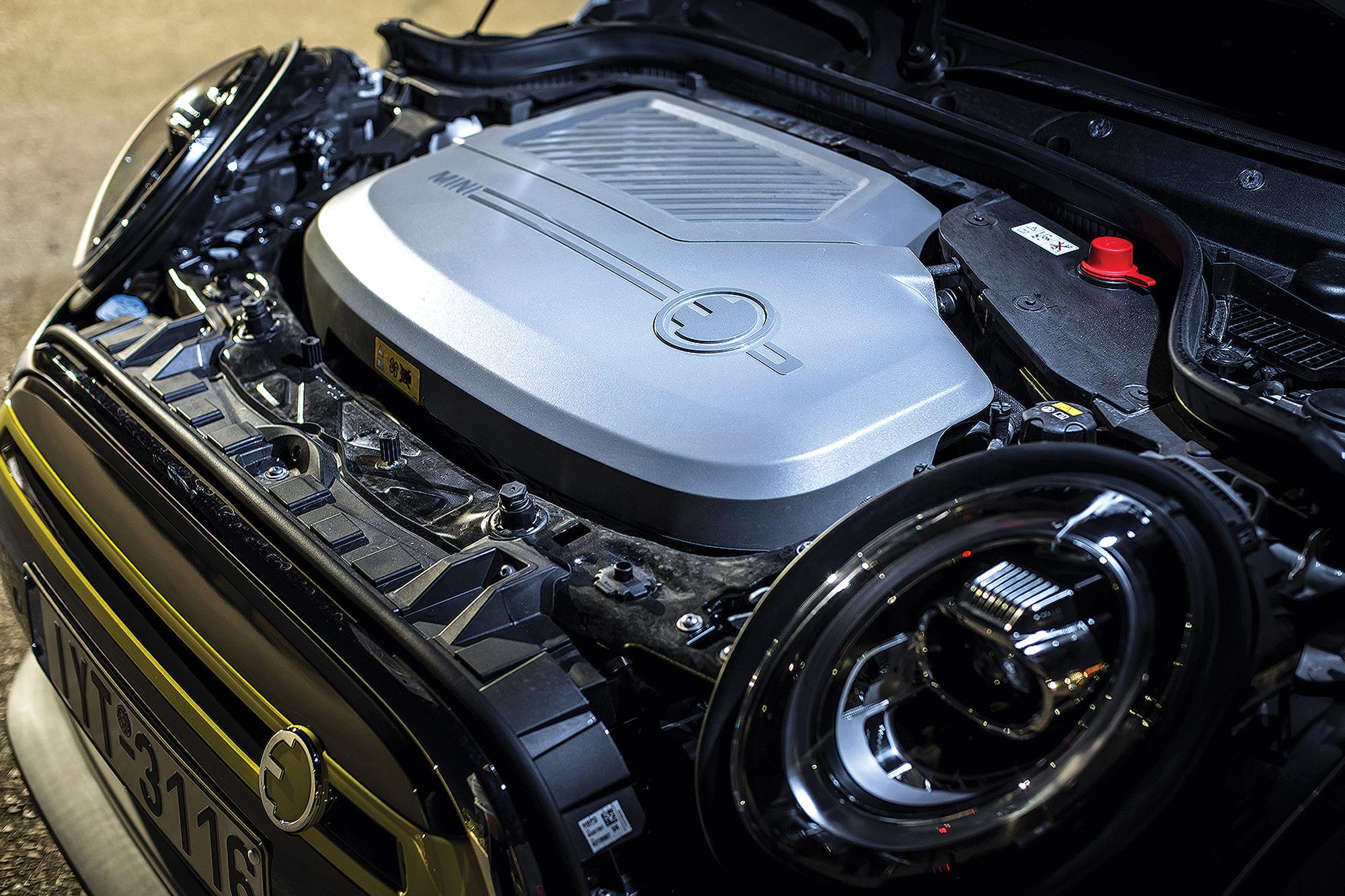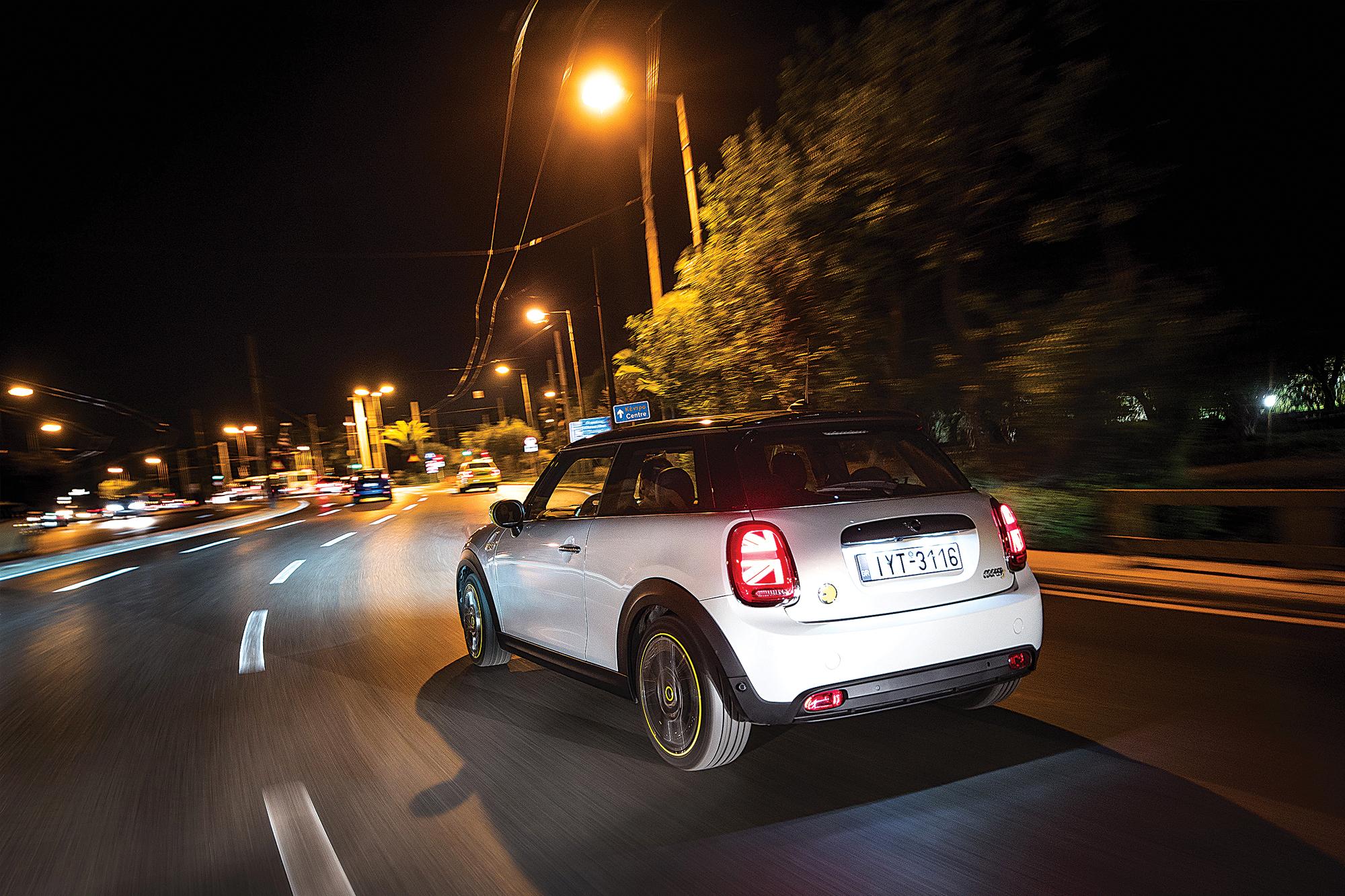 Ο ηλεκτροκινητήρας των 184Ps και 27,5kgm ροπής βρίσκεται στην ίδια θέση με τον κανονικό, όπως φυσικά και ο μειωτήρας στροφών, που παίζει τον ρόλο του αυτόματου κιβωτίου. Οι προδιαγραφές του λένε ότι κάνει το 0-100km/h σε 7,3sec (εμείς σημειώσαμε 7,51sec), με την τελική ταχύτητα να περιορίζεται ηλεκτρονικά στα 150km/h για χάρη της αυτονομίας, η οποία -σε ρυθμούς κίνησης μέσα στην πόλη- είναι γύρω στα 150-170km. Ο μόνος τρόπος να φτάσεις τα 200km κίνησης είναι με προσεκτική οδήγηση και αποκλειστικά στο πρόγραμμα Green+, που εξοικονομεί ενέργεια περιορίζοντας την απόκριση στο γκάζι και κλείνοντας τον κλιματισμό. Σε οποιοδήποτε άλλο πρόγραμμα οδήγησης, θα ανακαλύψεις αμέσως, το πόσο διασκεδαστικό είναι αυτό το αυτοκίνητο με το γκάζι στο πάτωμα. Είναι ένα Cooper S που έχει 27,5kgm παντού. Από το «ρελαντί» (που δεν έχει) μέχρι τα 120km/h, πηγαίνει το ίδιο σφαίρα και επειδή δεν ακούγεται, αν ξεχαστείς και παρασυρθείς από τη γραμμική του επιτάχυνση, θα βρεθείς πολλές φορές με αυτήν την ταχύτητα σε σημεία που δεν πρέπει. Επίσης θα βρεθείς και με τη μπαταρία να έχει αδειάσει, αν δεν παρακολουθήσεις την κατανάλωση ενέργειας, αλλά ευτυχώς γεμίζει αρκετά γρήγορα. Στο σπίτι, με μονοφασικό Wallbox 7,4kW, θέλει μόλις 3,2 ώρες για να φτάσει στο 80% και 4,2 ώρες για να γεμίσει πλήρως, ενώ με ταχυφορτιστή DC (μέχρι 50kW), θέλει μόλις 35 λεπτά για το 80% και 1,4 ώρες για πλήρη φόρτιση.