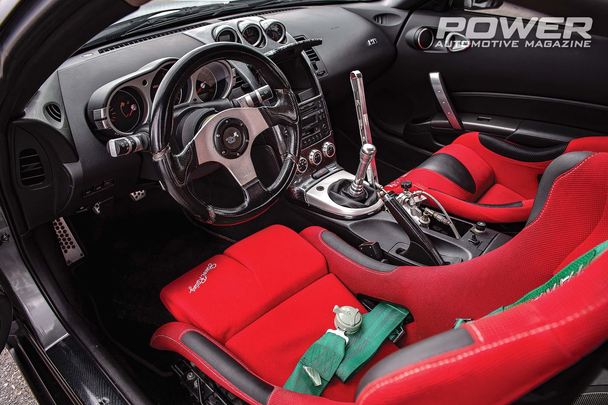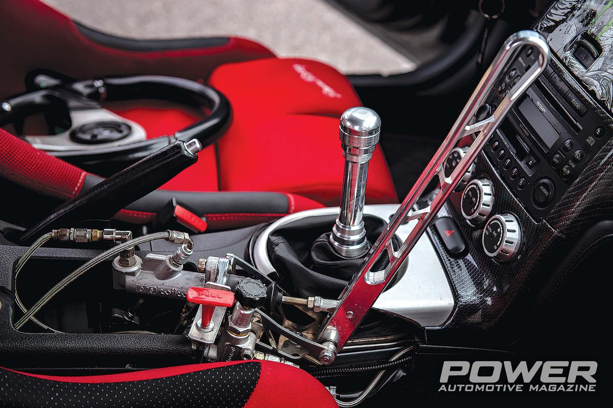 Επειδή πάντα η διαφορά κρύβεται στη λεπτομέρεια, όλα τα υπόλοιπα στο μηχανοστάσιο, σημαντικά και μη, είναι και αυτά κορυφαίας ποιότητας, όπως το ψυγείο νερού της Mishimoto με τάπα της HKS, ψυγείο λαδιού της Aeroflow και όλα τα αναλώσιμα επίσης της HKS. Ο εγκέφαλος που έχει αναλάβει τη διαχείριση όλων αυτών είναι της σειράς Platinum από την Haltech και μπορεί να αξιοποιήσει τους εργοστασιακούς αισθητήρες της Nissan, δίνοντάς σου όμως την δυνατότητα να δημιουργήσεις εντελώς δικούς σου χάρτες και διαθέτοντας κόφτες πίεσης, στροφών, ρυθμιζόμενο Launch Control, boost control ανά ταχύτητα και πολλές ακόμα λειτουργίες. Για να περάσει όλη αυτή η δύναμη, αλλά κυρίως η ροπή στους πίσω τροχούς χρειάστηκε ένα δίδισκο σετ συμπλέκτη της Xtreme Clutch και ένα φανταστικό μπλοκέ δύο δρόμων της KAAZ, το οποίο δεν «κουρδίζει» στους ελιγμούς, αλλά όταν πατήσεις γκάζι, κλειδώνει ακαριαία και δεν χάνει ούτε μισή στροφή, λες και είναι ραμμένο. Για το κιβώτιο, που παραδόξως έχει παραμείνει το εργοστασιακό (ο Αντώνης και ο Αχιλλέας περιμένουν πότε θα συγχωρεθεί για να παραγγείλουν ένα Samsonas, αλλά το μαμά δεν τους κάνει τη χάρη..), έχει φτιάξει η SnD ένα πολύ ωραίο custom Short-shift με επίσης φτιαχτό επιλογέα.