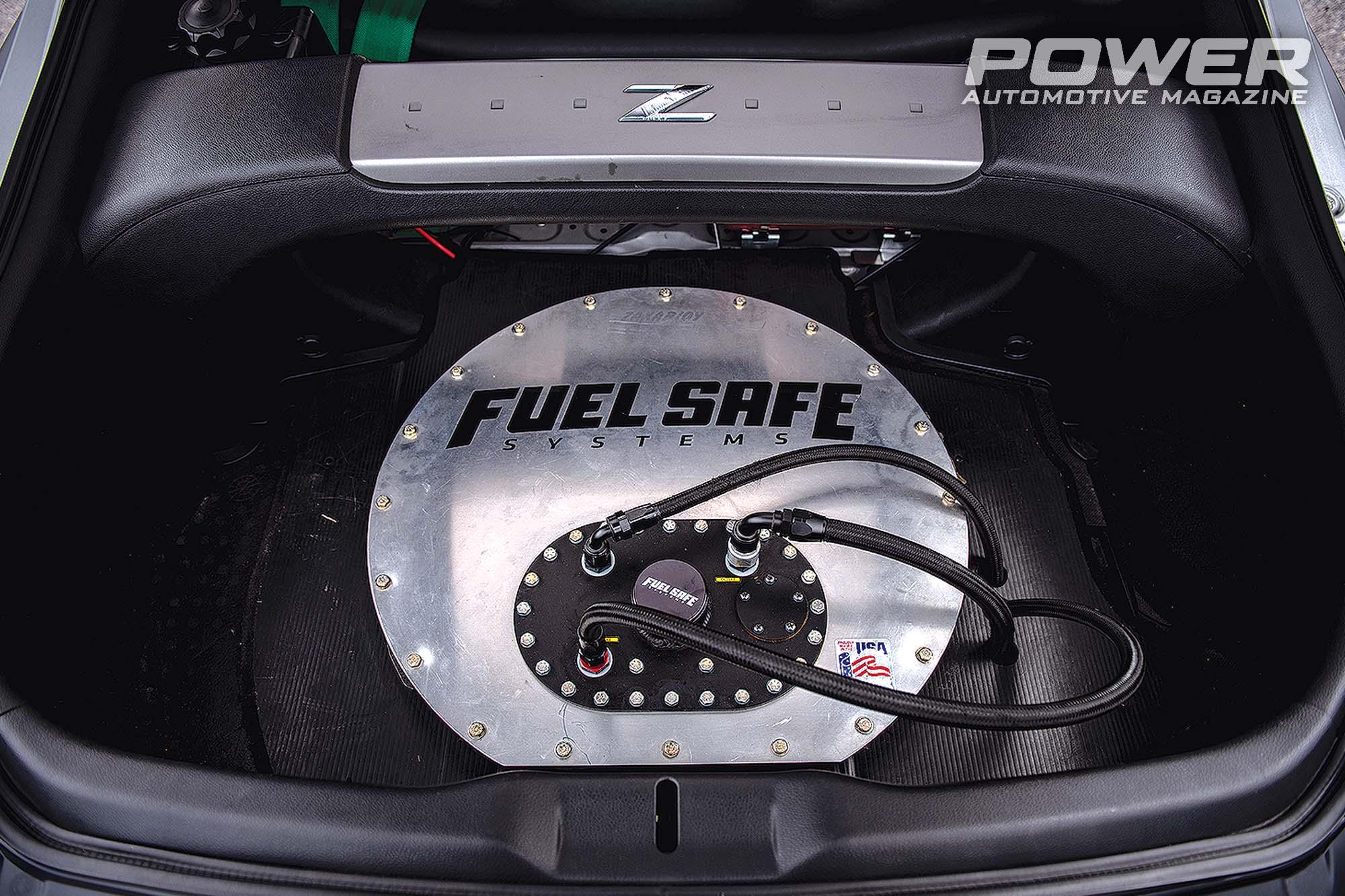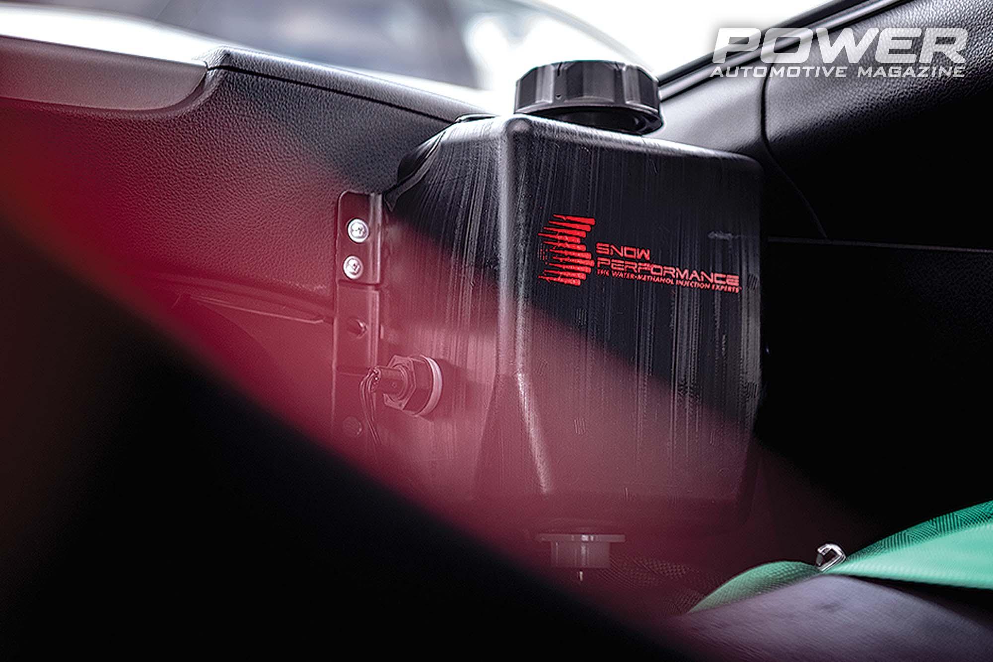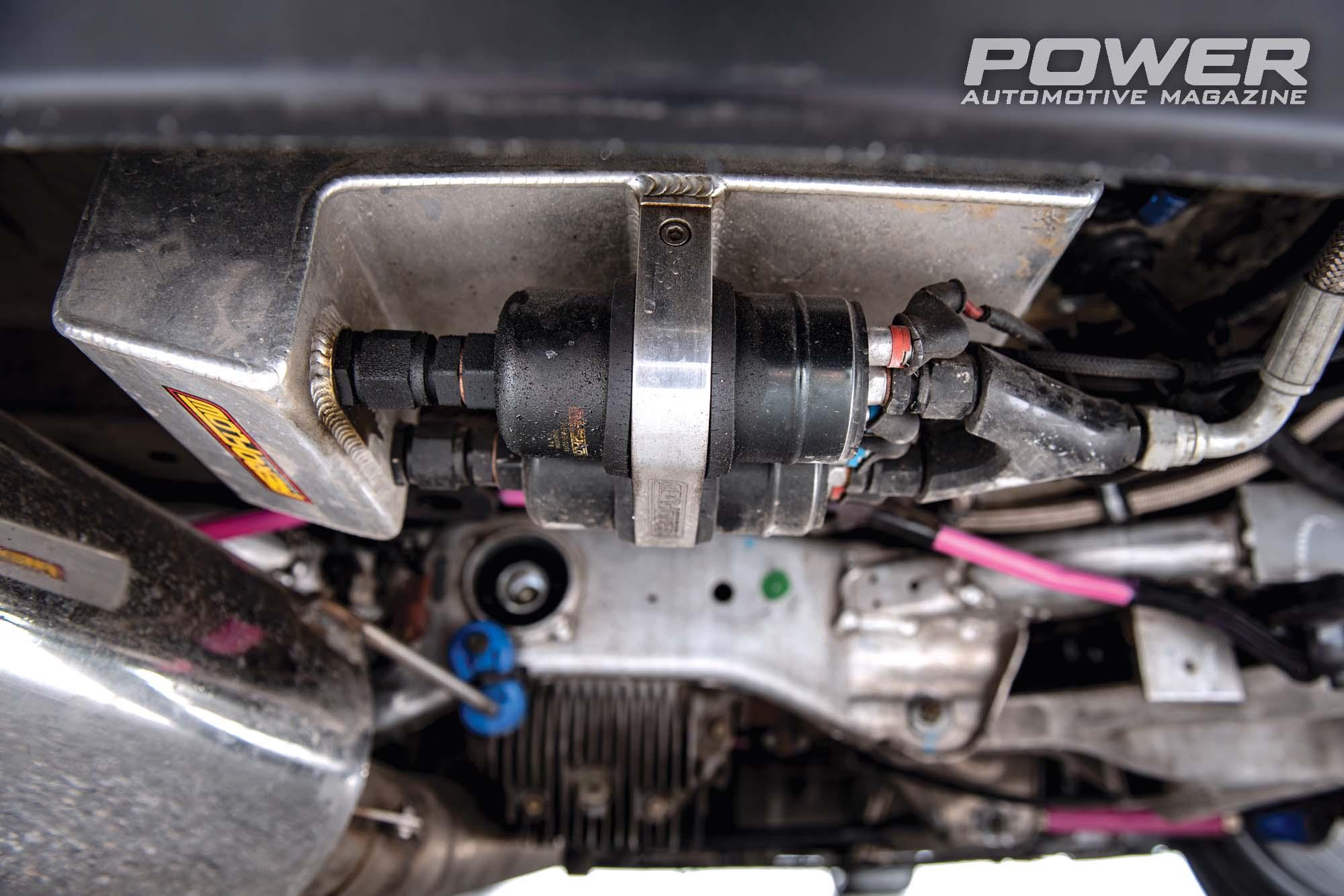 Για την τροφοδοσία του φροντίζουν ούτε μία ούτε δύο, αλλά τρεις αντλίες βενζίνης της Aeroflow, με παροχή 340lt/h, σε κύκλωμα σχεδιασμένο από την SnD Tuning, με custom σωληνώσεις παροχής/επιστροφής και αλουμινένιες μπεκιέρες με έξι χιλιάρια μπεκ της Injector Dynamics. Ο ρυθμιστής πίεσης είναι της Aeroflow, όπως και το surge tank που φροντίζει να μην στεγνώσει το μοτέρ ποτέ από καύσιμο. Το ρεζερβουάρ είναι αγωνιστικό της Fuel safe Motorsport.