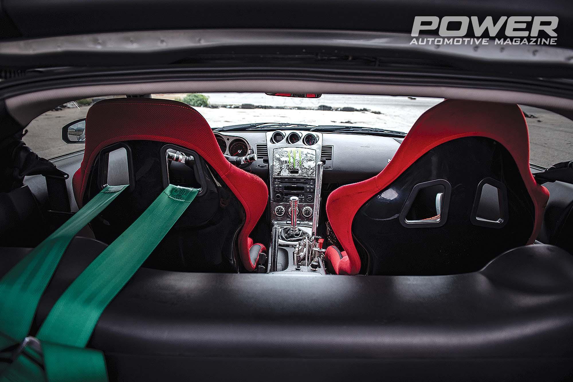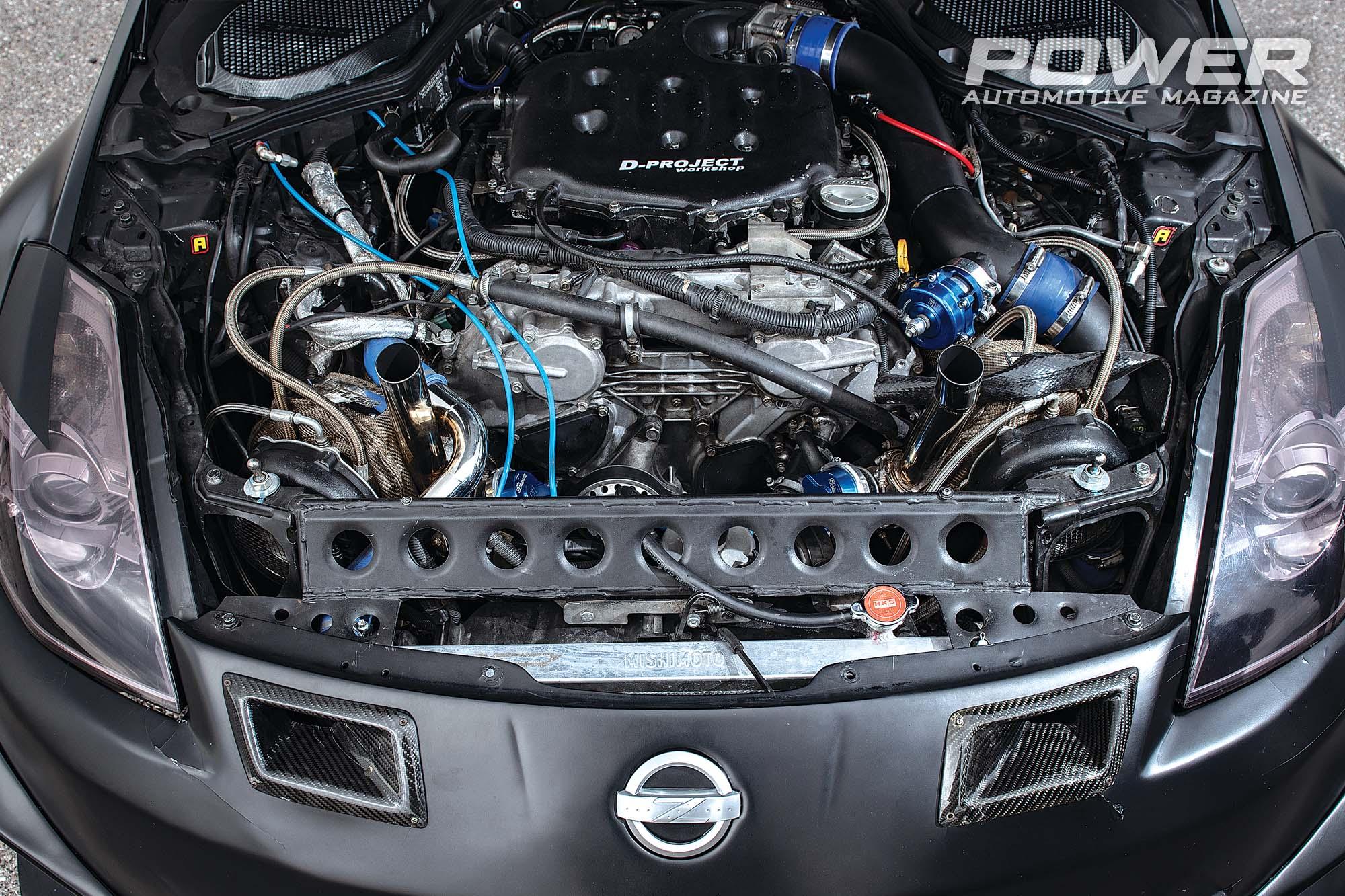 Όταν έχεις σκοπό να δημιουργήσεις ένα αυτοκίνητο που θα του κάνεις πολύ σκληρή χρήση και δεν θέλεις να έχεις συνεχώς ζημιές και προβλήματα ξέρεις ότι κάποια πράγματα πρέπει να τα πληρώσεις από την αρχή αδρά. Εδώ που τα λέμε... τι είναι καλύτερο, να σου κοστίσει ένα μοτέρ από την αρχή τα διπλά ή να σπάσεις άλλο ένα μέχρι να βάλεις μυαλό; Μάλλον το πρώτο. Έτσι το VQ35DE της Nissan κατέβηκε και λύθηκε εντελώς, για να θωρακιστεί και να χτιστεί από την αρχή σωστά. Τα τοιχώματα των κυλίνδρων έχουν ενισχυθεί με ατσάλινα χιτώνια της Darton, με ελαφρώς oversize (κατά 0,5mm) custom order σφυρήλατα έμβολα της Wossner (96mm) και ανάλογες heavy duty μπιέλες I-beam της ZRP.