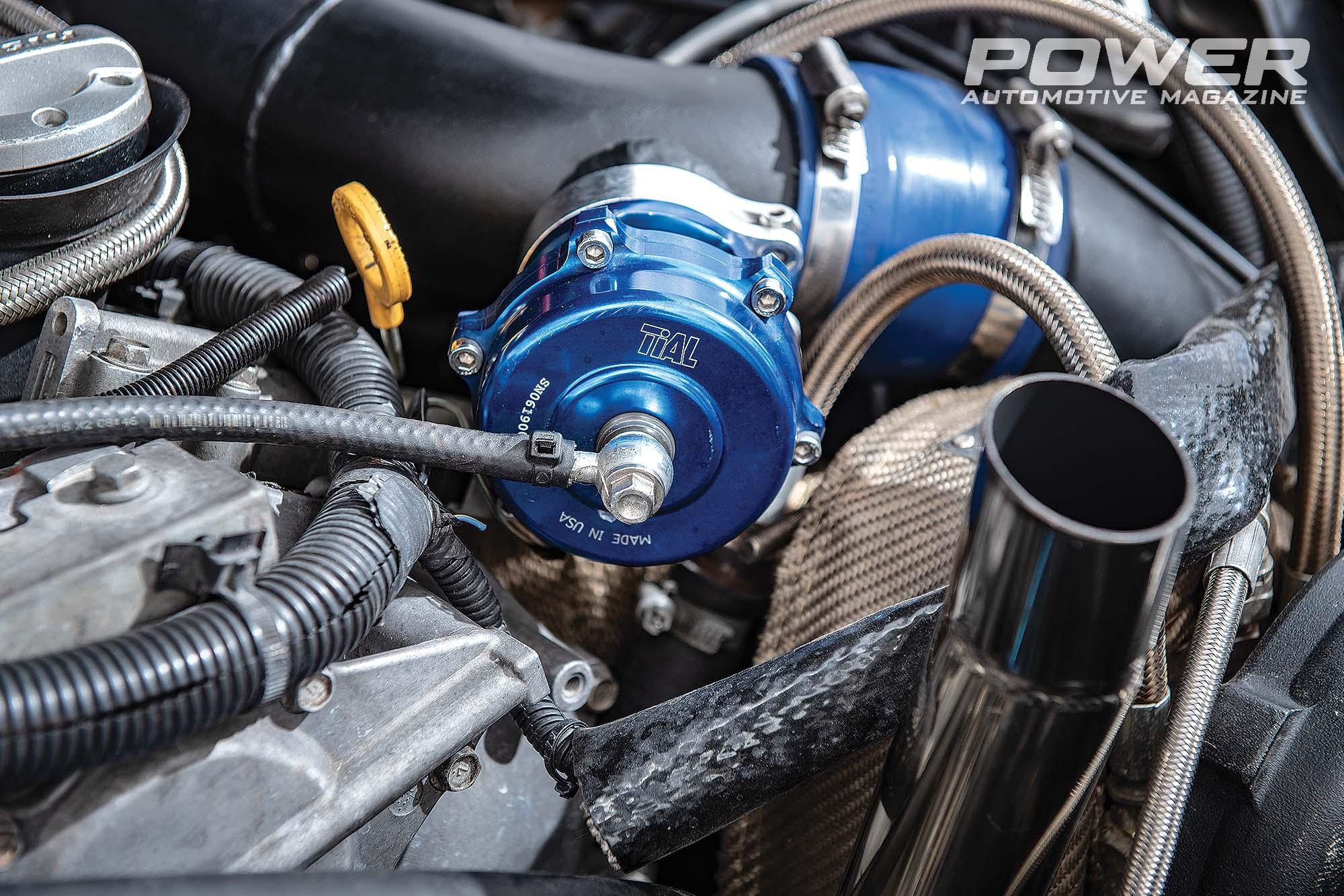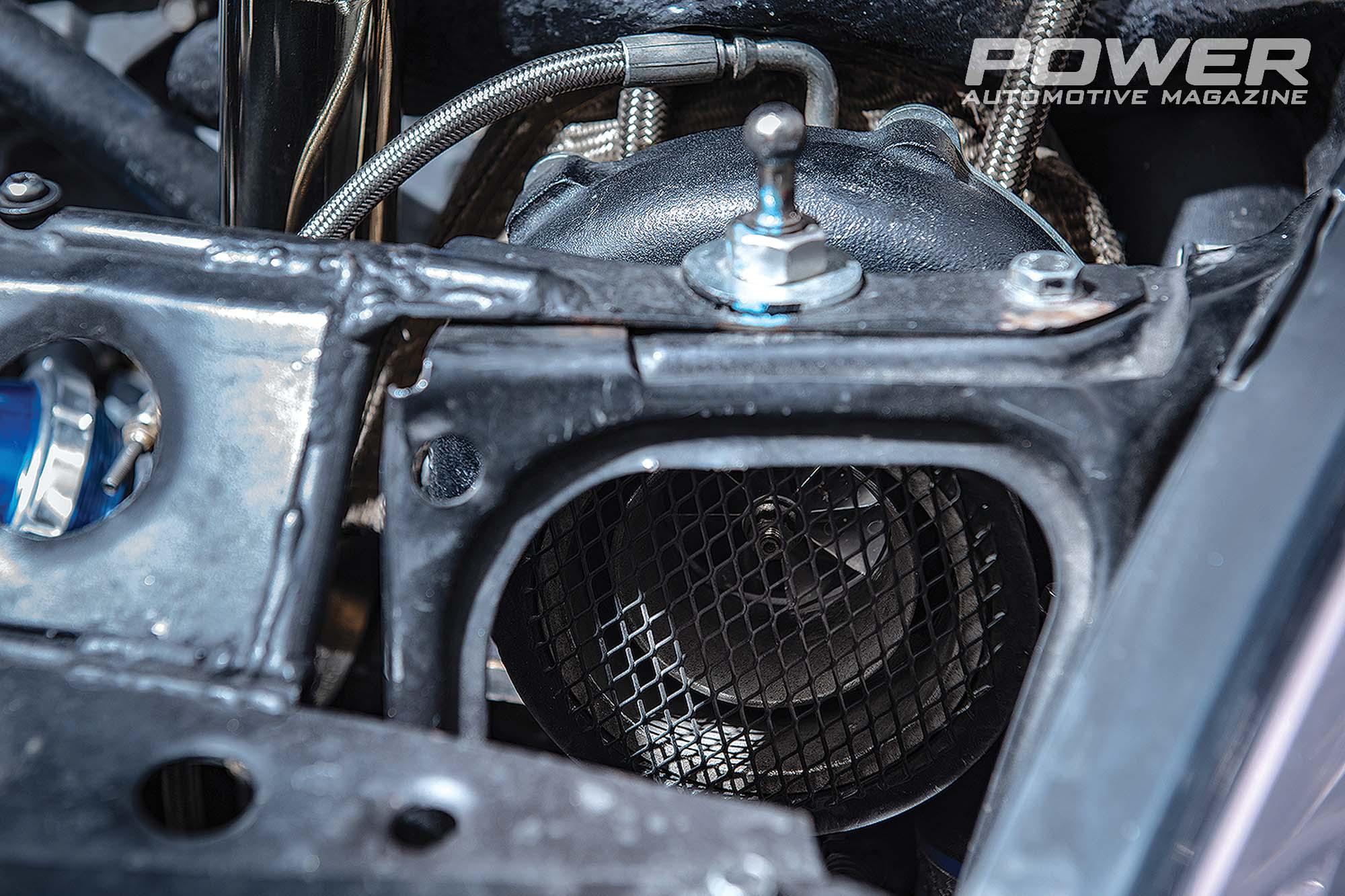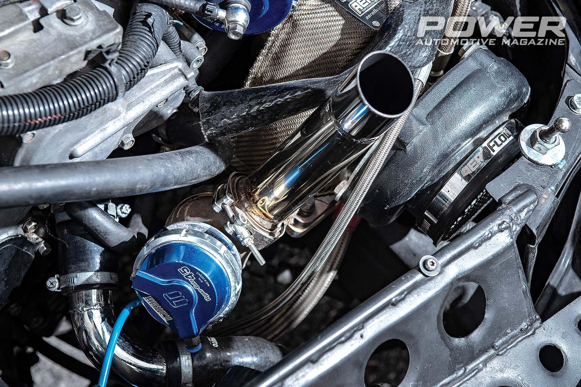 Τώρα λοιπόν που η D-Project Workshop του Αχιλλέα Λαδά έκλεισε το μοτέρ σαν χρηματοκιβώτιο, μπορούμε από έξω να κάνουμε παιχνίδι... Δύο Aeroflow Boosted 5455 τουρμπίνες, με φτερωτές συμπιεστή 54mm (πρακτικά ίδιο μέγεθος με GTX3071R) σε χταπόδια της SnD Tuning του Νίκου Πούλια, με δύο μεγάλα wastegates της Tial 44mm να προβάλλουν από αντίστοιχες τρύπες στο καπό και δύο downpipes της PMC, διαμέτρου 70mm, να καταλήγουν σε μία μονή εξάτμιση 100mm με ένα τελικό, που παραδόξως καταφέρνει να κρατά τα προσχήματα, τουλάχιστον σε χαμηλό φορτίο, αλλά και να αφήνει την ωραία χροιά του V6 να ξεδιπλωθεί στο τέρμα γκάζι. Φυσικά δεν λείπουν οι τυμπανοκρουσίες από τον κόφτη στροφών, αλλά ο Αντώνης έχει αφαιρέσει από τον προγραμματισμό τα σκασίματα στο άφημα του γκαζιού γιατί δεν θέλει να προκαλεί, όπως μας είπε. Συγκεκριμένα, επειδή είναι ένας νομοταγής και φιλήσυχος οδηγός, κάθε φορά που έβλεπε περιπολικό, για να μην τραβήξει την προσοχή, άφηνε το γκάζι ασυναίσθητα, από συνήθεια, με αποτέλεσμα να πέφτουνε μπαλοθιές από την εξάτμιση και να συμβαίνει ακριβώς το αντίθετο.