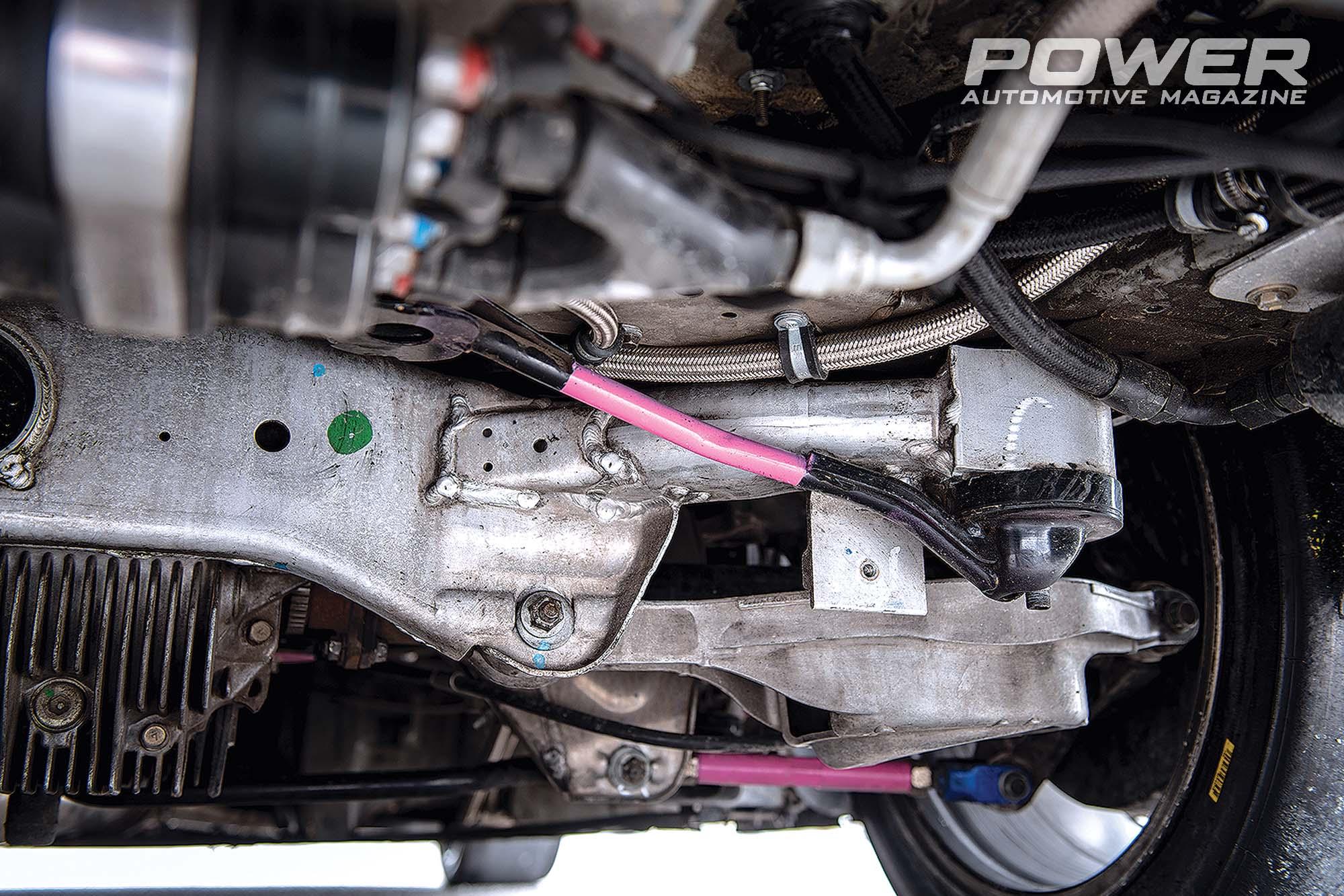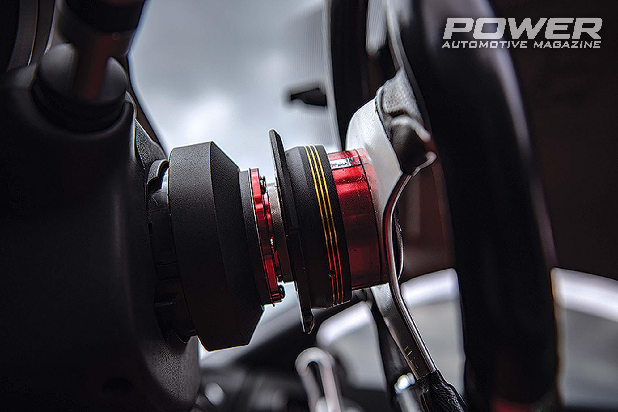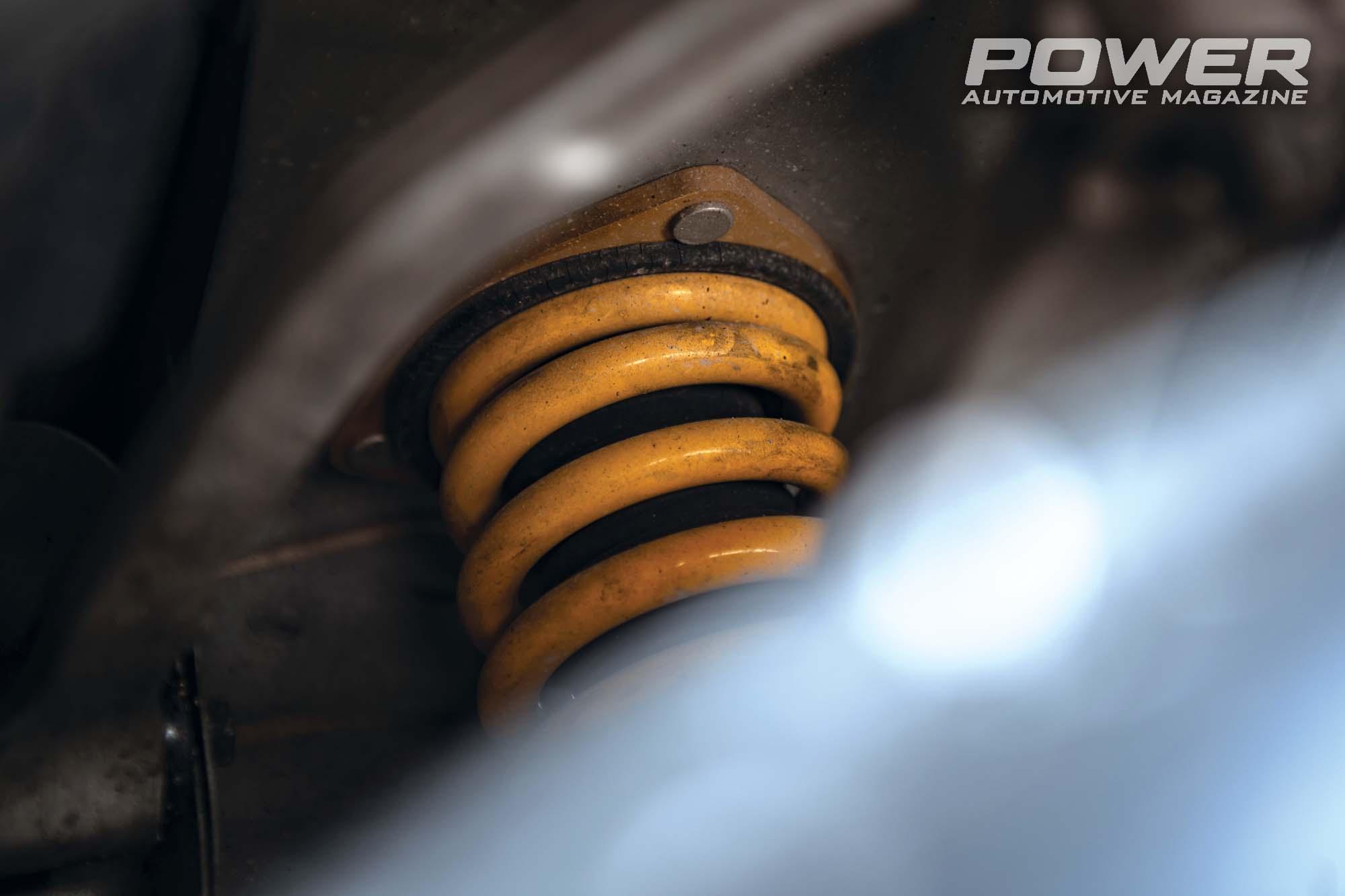 Σε ένα αυτοκίνητο που δεν προορίζεται μόνο για κόντρες και πρέπει να μπορεί να σταθεί σε πίστα και δρόμο, το δυνατό μοτέρ είναι η μισή δουλειά. Η άλλη μισή είναι να μπορεί να χρησιμοποιηθεί όλη αυτή η δύναμη, χωρίς να τα κόψει όλα στο πρώτο πάτημα και χωρίς να βλέπεις τον χάρο να σου κάνει οτοστόπ κάθε φορά που έρχεται η στροφή. Έτσι και το στήσιμό του είναι εξίσου προσεγμένο με τον κινητήρα και τα περιφερειακά, με λύσεις που καλύπτουν όλες τις χρήσεις στο έπακρο. Για παράδειγμα, στο μπροστινό του σύστημα έχει σωληνωτά ψαλίδια με ball-joints, τα οποία του δίνουν μεν μια μεγαλύτερη γωνία camber, χωρίς όμως να βγάζουν τους τροχούς τόσο έξω όπως στα drift cars, που δείχνουν άθλια και δεν κάνουν για τίποτε άλλο παρά να στρίβουν σαν κάβουρες! Η κρεμαγιέρα του είναι ηλεκτρική με custom kit από την D-Project Workshop για μεγαλύτερη γωνία στριψίματος και τα silent blocks έχουν αντικατασταθεί με σκληρότερα της Whiteline, τόσο εμπρός όσο και στην πίσω γέφυρα. Στη βάση του διαφορικού όμως χρησιμοποιήθηκε ένα ενισχυμένο kit της SPL, γιατί με σχεδόν 85kgm δεν θέλουμε να κάνει τη γέφυρα, τα ημιαξόνια και το πάτωμα «κοκορετσάδα».