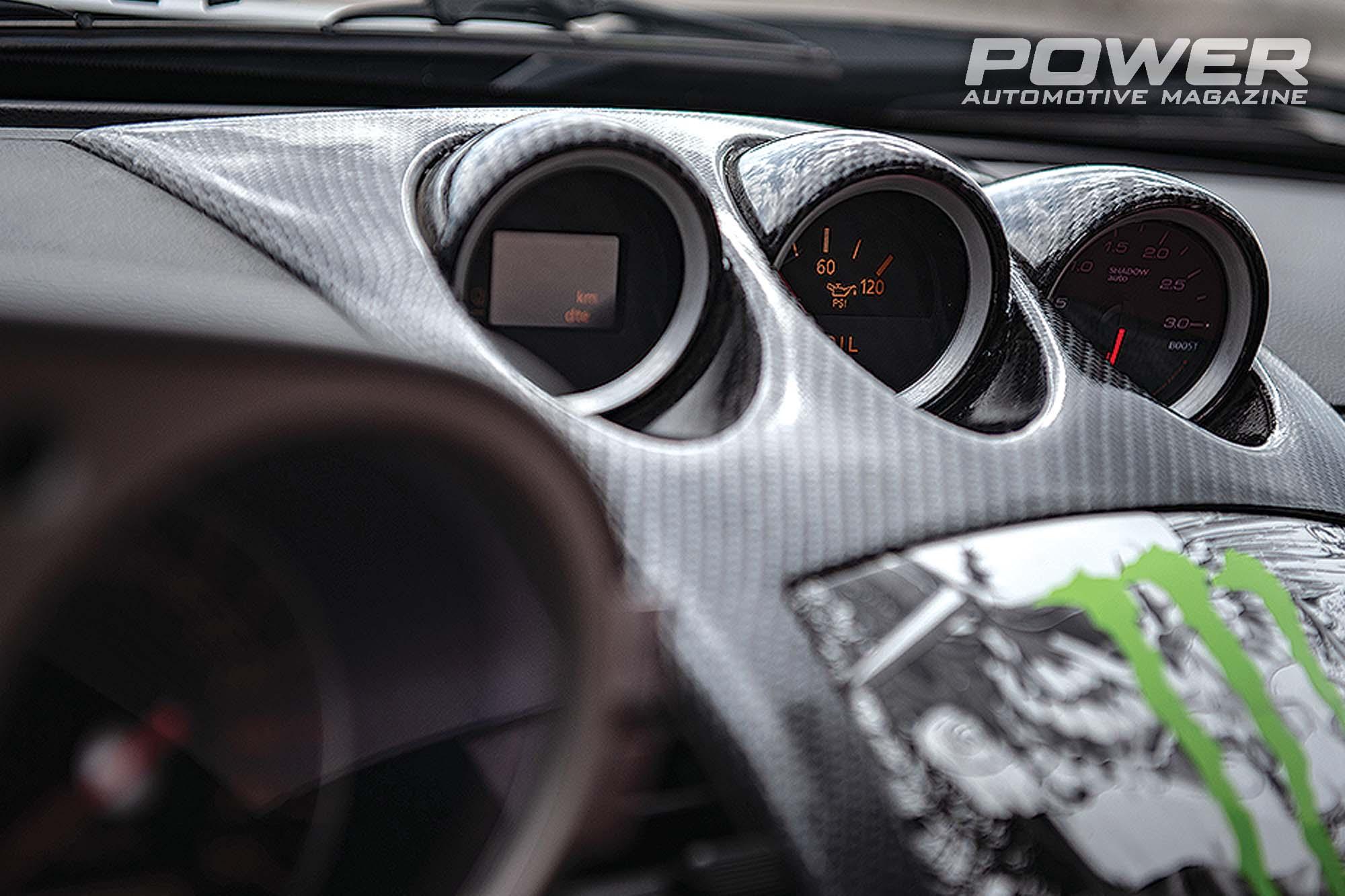 Αφού λοιπόν το έχουμε τερματίσει με την ενεργητική ασφάλεια και το κράτημα, ειδικά με τα full-slick λάστιχα της Pirelli είναι φοβερό και κάνει για πλάκα καταπληκτικούς χρόνους, τώρα πρέπει να φροντίσουμε και για την περίπτωση που τελικά κάτι πάει στραβά. Ακόμα και σύστημα πυρόσβεσης της Takata έχει βάλει ο Αντώνης, μαζί με τις ζώνες τεσσάρων σημείων και τα καθίσματα της Cobra. Γενικά, το εσωτερικό του είναι ένα μείγμα αγωνιστικού, πολιτικού, με δόσεις κοντράδικου και με το υδραυλικό χειρόφρενο να προσθέτει μια νότα drift. Είναι ένα αυτοκίνητο παιχνίδι, το οποίο κάνει για πολλά σπορ. Έχει όργανα ελέγχου της Shadow, boost controller της Aeroflow, αποσπώμενο τιμόνι με quick release κώνο της NRG και όλα αυτά μέσα σε ένα αρκετά διακριτικό περιτύλιγμα, το οποίο είναι βαμμένο σε αυτό το πολύ ωραίο μαύρο ματ χρώμα, με τον εμπρός προφυλακτήρα της Nismo και το carbon καπό με τις quick release ασφάλειες και τους αεραγωγούς της SnD.