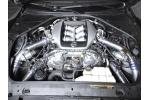 Τα εργοστασιακά turbo (IHI RHF55) έχουν φτερωτή εισαγωγής 6 πτερυγίων με διάμετρο inducer 43,34mm και 56mm exducer. Inducer να θυμίσουμε πως είναι η διάμετρος της φτερωτής στο πάνω μέρος της (είσοδος αέρα) κα exducer στο κάτω μέρος της, δηλαδή προς το κέντρο του turbo. Τα αντίστοιχα νούμερα για τις VF34 είναι 46,45mm και 60mm, επίσης με 6 πτερύγια. Οπότε καταλαβαίνουμε ότι τα turbo αυτά δεν είναι τεράστια, ούτε φυσικά πολύ μεγαλύτερα από τα εργοστασιακά. Άρα σίγουρα το αυτοκίνητο δεν θα χάσει τον πολιτισμένο χαρακτήρα του. Στην μεριά του στροβίλου (μαντέμι) των εργοστασιακών turbo, έχουμε φτερωτή 9 πτερυγίων με inducer 50mm και exducer 40,3mm. Οι VF34 έχουν 11 πτερύγια, με inducer 54mm και exducer 48mm. Το πώς και πόση πίεση θα κρατήσουν οι νέες VF34 ελέγχεται πλέον από τις wastegate της HKS. Τις εργασίες εξαγωγής των stock turbo και τοποθέτησης των νέων ανέλαβε ο Δημήτρης Κεραμίδας, γνωστός για τις δυνατές Toyota Supra. Ενδιαφέρουσα βελτίωση με μεγάλο κέρδος είναι στα GT-R η αλλαγή των σωληνώσεων που φροντίζουν να τροφοδοτούν με αέρα τα turbo (suction pipes). Αυτές είναι κατασκευής GTC. H GTC είναι μία Αγγλική εταιρία ειδικευμένη στα GT-R και ίσως την θυμάστε από το λευκό Nissan GT-R στο περίπτερο του POWER στο Athens Tuning Show 2008. Οι εργοστασιακές σωληνώσεις έχουν διάμετρο 45mm ενώ της GTC 60mm και είναι κατασκευασμένες από αλουμίνιο. Στην περίπτωση του GT-R μας, συνδυάζονται με φιλτροχοάνες Greddy AirInx και για να τις βγάλουμε φωτογραφία εκεί που βρίσκονται, κάναμε κάνα τέταρτο με τον Σιδηρά.