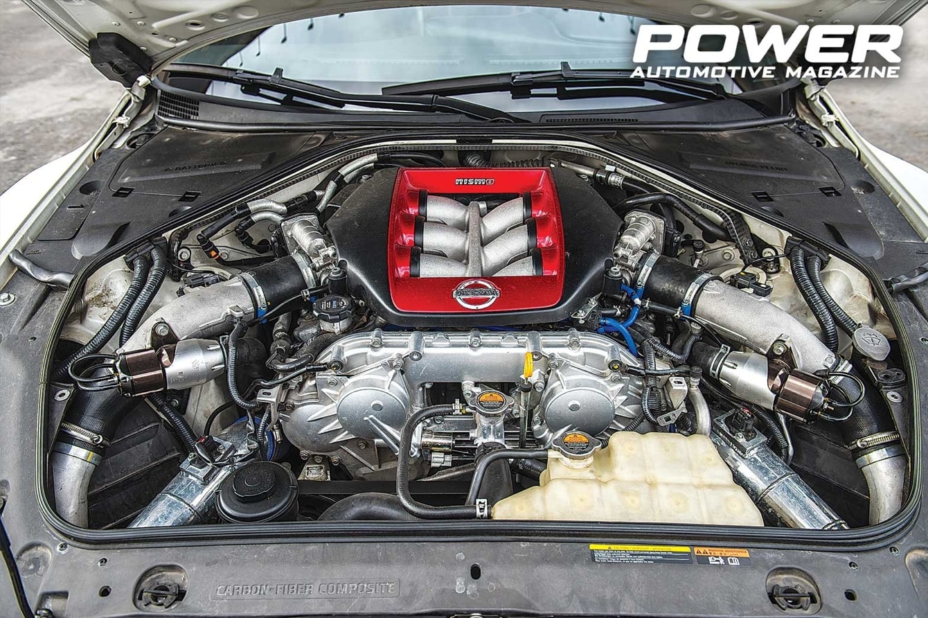 Με τη μετάδοση στη σωστή κατάσταση, σειρά είχε και ο κινητήρας. Τα εργοστασιακά turbo αλλάχθηκαν με τα αντίστοιχα της Nismo, από το μοντέλο του 2015, τα οποία έχουν μεγαλύτερη φτερωτή συμπιεστή. Στην εισαγωγή αλλάχθηκε το άνω τμήμα της με το αντίστοιχο τμήμα της Midas Tuning, το οποίο έχει 76mm διάμετρο. Επίσης, αλλάχθηκαν και οι κάτω εισαγωγές, που καταλήγουν στα turbo, με αυτές του ΜΥ11, οι οποίες έχουν κατά 15mm μεγαλύτερη διάμετρο σε σχέση με τις αντίστοιχες του ΜΥ09. Δύο φιλτροχοάνες της GReddy έχουν αναλάβει το φιλτράρισμα του εισερχόμενου αέρα. Την παροχή των μεγαλύτερων μπεκ καυσίμου της Injector Dynamics, που έχουν παροχή στα 1.000cc/min, έχουν αναλάβει δύο αντλίες βενζίνης της Walbro των 255lt/hr, ενώ ο ρυθμιστής πίεσης βενζίνης παρέμεινε ο εργοστασιακός. Δύο σκάστρες της Synapse εσωτερικού τύπου ανακουφίζουν το κύκλωμα. Τέλος, ο Δημήτρης έκανε πολύ προσεκτικό και ψαγμένο remapping στην εργοστασιακή ECU του κινητήρα, με αποτέλεσμα να καταφέρει να διατηρήσει αυτό το καταπληκτικό διάγραμμα ροπής, που αναλύσαμε παραπάνω.
