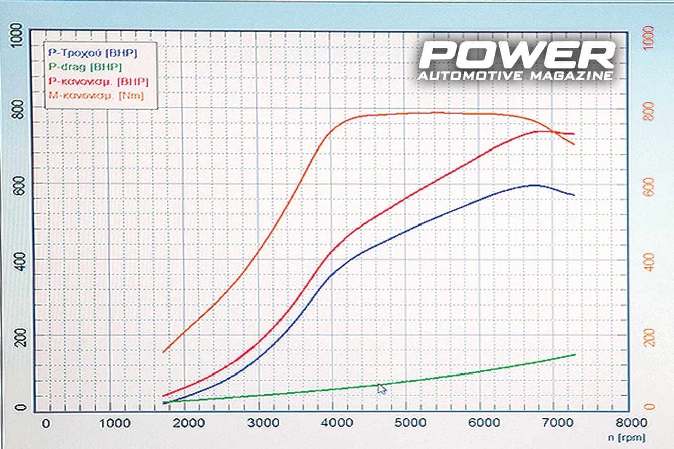 Ο Βαράγκης είναι ένας κορυφαίος Έλληνας επιπλοποιός, γνωστός για τα ακριβά και κομψά σχέδιά του. Μέσα σε όλα αυτά, σχεδιάζει και τραπέζια. Που κολλάνε τα παραπάνω? Μα, φυσικά, στη δυναμομέτρηση του GT-R. Ο Βαράγκης φτιάχνει τραπέζια και ο Δημήτρης φτιάχνει τραπέζια στα διαγράμματα ροπής! Για ένα εύρος 3.000rpm, ο κινητήρας αποδίδει σταθερά πάνω από 78kgm ροπής, από τη στιγμή που ξυπνάνε τα turbo μέχρι τον κόφτη! Συγκεκριμένα, ο κινητήρας κάνει peak στη ροπή στις 5.450rpm και αποδίδει 80,19kgm. Παράλληλα, η ισχύς του φτάνει στα 738,2Ps στις 6.900rpmκαι μην ξεχνάτε ότι όλα αυτά γίνονται με κλειστό μοτέρ! Αυτό φυσικά στο δρόμο μεταφράζεται σε έναν τρομερά γεμάτο κινητήρα, που ποτέ δεν του τελειώνει η δύναμη. Όσο πατάς το γκάζι, τόσο αυτός συνεχίζει ακούραστα και αξιόπιστα να σου δίνει δύναμη. Πολλή δύναμη. Ο σκοπός του Δημήτρη ήταν να φτιάξει ένα αυτοκίνητο διατηρώντας όσο το δυνατόν πιο αυτούσιο το χαρακτήρα του. Δεν ήθελε να φτιάξει ένα αυτοκίνητο-κανίβαλο, που θα έχανε τον καθημερινό του χαρακτήρα και θα γινόταν ένα πολύ ειδικό σύνολο για συγκεκριμένη χρήση. Και αυτό ήταν και το δυσκολότερο σημείο της βελτίωσης, στο να κρατηθεί ο φιλικός χαρακτήρας και η εργοστασιακή συμπεριφορά του αυτοκινήτου. Πράγμα που, φυσικά, το κατάφερε.