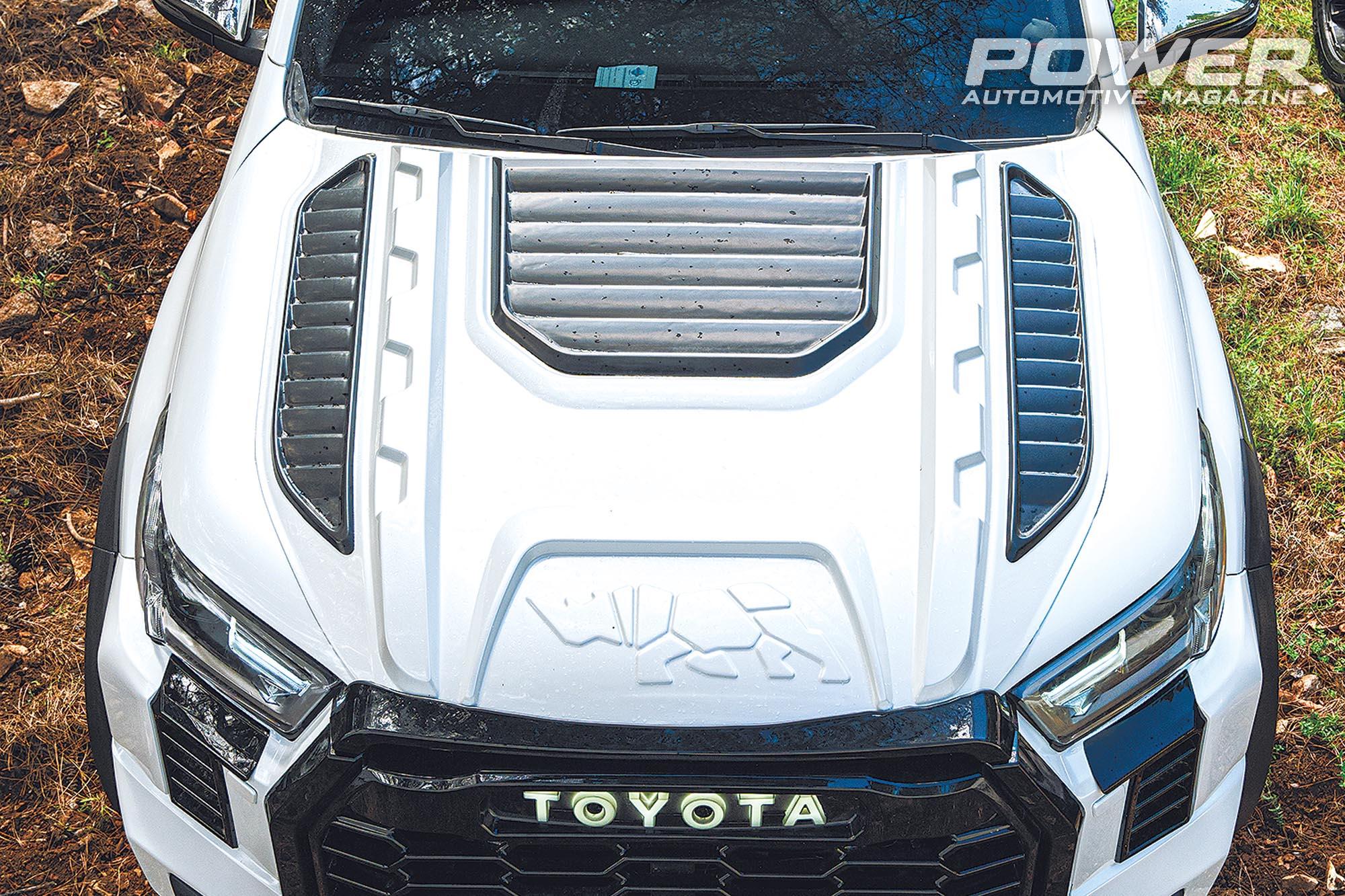 Το επίσης λευκό Toyota Hilux της Motor Sports Haus μπορεί να είναι λιγότερο επιβλητικό συνολικά από το Navara, αλλά αντισταθμίζει την διαφορά σε ύψος με την τρομερή και πολύ άγρια μάσκα του Toyota Tundra, που είναι ένα μεγαλύτερο μοντέλο, πολύ δημοφιλές στην Αμερική, στην χώρα που τα αγροτικά αυτοκίνητα ξεπερνούν σε πωλήσεις τα κανονικά επιβατικά. Είναι και αυτό πολύ ψηλό, με το body lift kit +50mm της Motor Sports Haus και το Lift kit στα ελατήρια, αλλά δεν έχει τους τεράστιους τροχούς του Nissan και αντίστοιχη coilover ανάρτηση. Έχει όμως και αυτό εντυπωσιακό καπό, με αεραγωγό της Rhino, ένα ατσάλινο Roll bar της Motor Sports Haus και τον πίσω custom μεταλλικό προφυλακτήρα της Motor Sports Haus. Τα φανάρια του είναι full LED εμπρός και πίσω και δένουν εντυπωσιακά με το bodykit που κατασκεύασε η Motor Sports Haus. Έχει ηλεκτρικό ρολό για να κλείνει την καρότσα και να προστατεύει από τις καιρικές συνθήκες τις αποσκευές και μπορεί να γίνει ένας ιδανικός σύντροφος για χειμερινές ή καλοκαιρινές διακοπές, αρκεί να έχεις υπομονή και να απαντάς συνέχεια στην ερώτηση, «καλά, ρε φίλε, πού το βρήκες το Tundra;». Οι ζάντες του έχουν ένα πιο συντηρητικό μέγεθος 9J x 18in με -12offset, ντυμένες με λάστιχα Radar Renegade AT Sport 265/65/18, που του δίνουν έναν πιο all around χαρακτήρα σε σχέση με το εντελώς «πολεμικό» χωμάτινο Nissan. Όπως και να έχει, είναι τρελό παρεάκι αυτά τα δύο, ειδικά όταν τα κυκλοφορείς μαζί, το ένα πίσω από το άλλο, νομίζει ο κόσμος πως κάπου εδώ γυρίζουνε ταινία, δεν μπορεί να συναντήθηκαν αυτά τα δύο τυχαία.