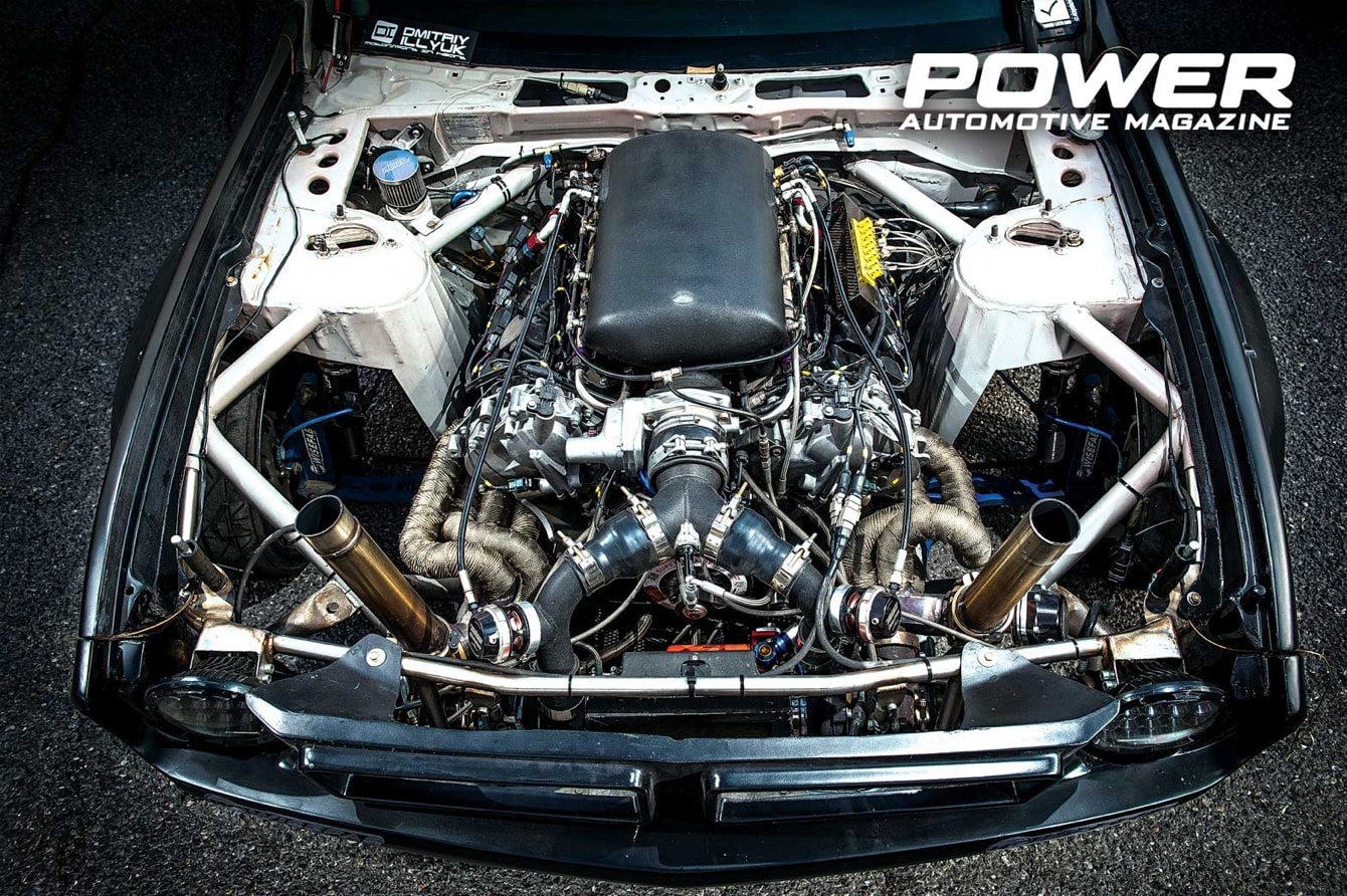 Αυτό το «ιερό τέρας» της Nissan διάλεξε, λοιπόν, ο Dmitriy Illyuk για να…τουρμπίσει! Ενισχύοντας τα κινούμενα μέρη του VK56DE πέραν του στροφάλου με customspec σφυρήλατες μπιέλες της Carillo, custom spec σφυρήλατα πιστόνια της Mahle, δένοντας όλο το μοτέρ με βίδες και μπουζόνια της ARP και προσθέτοντας ελατήρια βαλβίδων της Brian Crower στις κυλινδροκεφαλές, είσαι έτοιμος για τα «σαλιγκάρια». Στις custom πολλαπλές εξαγωγής με διάμετρο 80mm, που κοιτάζουν μπροστά, «πατάνε» δύο Garrett GTX3071R turbo, ικανές για 650Ps έκαστη. Στο «παιδικό» 1,1bar, ο δράκος έχει δείξει στο dyno 1.100Ps με…135kgm ροπής! Μην ψάχνετε για downpipes, καζανάκια και εξατμίσεις, ο δράκος βρυχάται από δύο straight pipes συνέχεια των turbo, που βγαίνουν δεξιά και αριστερά από τα φτερά, μπροστά από τους εμπρός τροχούς! Ανάμεσα στα turbo, θα βρεις το custom made φιλτροκούτι με το φίλτρο αέρα της Pipercross και δεξιά-αριστερά τα Powergate Turbosmart external των 60mm, που εξέχουν και πετάνε φλογίδια από το καπό! Ο εισερχόμενος αέρας οδηγείται στους θαλάμους καύσης από την custom, dual chamber πολλαπλή εισαγωγής, για να συναντήσει τις γενναίες ποσότητες καυσίμου, που έρχονται μέσω των οκτώ ID 2000 μπεκ αλλά και της μεθανόλης, που τροφοδοτεί το AIS 3000 directportwatermethanolinjectionkit της SnowPerformance. Η χρήση του ψεκασμού water-meth έκανε δυνατή τη μη-χρήση intercooler, με αποτέλεσμα αστραπιαίο spoolάρισμα στις μεσαίες rpm! Ο Illyuk παραμένει πιστός και στα σειριακά κιβώτια της Drenth, δοκιμασμένα επί σειρά ετών και events, παρόλα αυτά, ετούτο εδώ το MPG, αν και custom order με ενισχυμένα σωθικά, δείχνει να περνάει δύσκολες ώρες αντιμέτωπο με το βουνό ροπής των 135kgm του υπερτροφοδοτούμενου VK56DE. Στη σειρά για να περάσουν άσχημα, ακολουθούν ο R4C συμπλέκτης της OS Giken, το R320 διαφορικό, μέχρι και τα ημιαξόνια του Nissan GTR R35! Μην ξεχνάτε ότι το πράμα φοράει και 18άρες ζάντες με 10,5in φάρδος και 265/35/18 λάστιχο πίσω…Ναι, αυτά που ξεφτιλίζει για πλάκα, όπως εμείς δεν μπορούμε ούτε με 195/50/15!!!