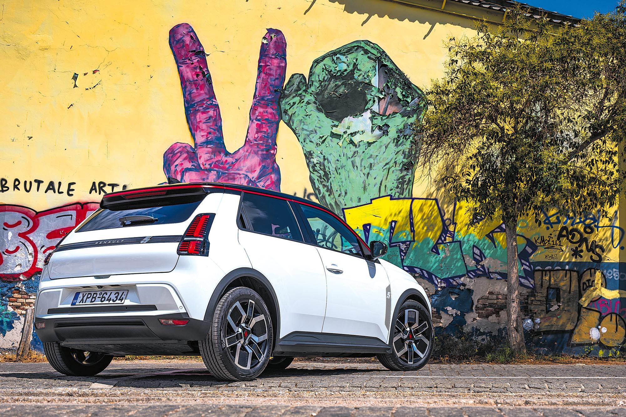Το νέο Renault 5 είναι ένα αυτοκίνητο που κυρίως επιθυμείς και όχι «απλά» επιλέγεις. Η Renault έχει αξιοποιήσει πλήρως το θησαυροφυλάκιο ευχάριστων αναμνήσεων του κλασικού 5. Ένα αυτοκίνητο που αποτέλεσε λαμπρό δείγμα ξεχωριστού σχεδιασμού προϊόντος που χάρισε σε εκατομμύρια ανθρώπους (πάνω από 5 εκατομμύρια πωλήσεις) ευχάριστες αναμνήσεις από τις απλούστερες εποχές και τους δρόμους της δεκαετίας του 1970 και του 1980. To νέο 5 δεν ακολουθεί πεισματικά ταυτόσημα το ιστορικό 5άρι. Έχει αντίστοιχα τετράγωνο σχήμα με έντονα κεκλιμένη πίσω πόρτα, χαμηλή γραμμή οροφής, ακριβώς όπως το πρωτότυπο μοντέλο της δεκαετίας του ‘70. Είναι επίσης γεμάτο με στιλάτες λεπτομέρειες που θυμίζουν το ιστορικό μοντέλο, το μικρό καπό, τα τετράγωνα φώτα LED ημέρας, οι λεπτομέρειες στα πίσω φώτα που έχουν σχεδιαστεί για να μοιάζουν με τους αεραγωγούς του 5 Maxi Turbo είναι πανέξυπνα retro-hints για ένα πολύ σύγχρονο και μοντέρνο σύνολο. Στο καπό υπάρχει και ένα panel με φωτιζόμενο το λογότυπο «5», ενώ εμφανίζει και το επίπεδο της μπαταρίας κατά τη φόρτιση. Δεν ξέρω αν μόνο στα μάτια μου μοιάζει πανέμορφο ή αν η νοσταλγία παίζει κύριο βαθμό στην ακαταμάχητη θελκτικότητά του. Είναι επίσης ιδιαίτερα compact σε διαστάσεις, με μήκος 3.922mm, πλάτος 1.774mm και μεταξόνιο 2.540mm για να ικανοποιεί πλήρως τις ανάγκες της καθημερινής μετακίνησης στην πόλη. Μπορεί βέβαια να είναι μικρότερο από το Clio, το 208 και το Corsa, ωστόσο η παρουσία του R5 είναι ξεκάθαρα πιο «έντονη» από εκείνη που αναλογεί σε ένα αυτοκίνητο που οριακά ξεπερνάει τα 3,9m. Το μόνο που με ενόχλησε κάπως και που σίγουρα θα ενοχλήσει και άλλους ψηλότερους οδηγούς είναι το μικρό και με έντονη κλίση παρμπρίζ που δεν αφήνει μεγάλο περιθώριο ανάμεσα από το πάνω μέρος του ταμπλό και του καθρέφτη, το οπτικό πεδίο με άλλα λόγια που βλέπεις το δρόμο. Κατά τα άλλα, το R5 είναι αρκετά πρακτικό για ένα supermini αυτοκίνητο. Μπορεί να μεταφέρει 2 ενήλικες μεσαίου μεγέθους στα πίσω καθίσματα ακόμα κι αν ο χώρος για τα γόνατα είναι λιγοστός και δεν υπάρχει χώρος για να βάλετε τα πόδια σας κάτω από τα μπροστινά καθίσματα. Το πίσω μέρος είναι λίγο σκοτεινό λόγω της στενής γραμμής των παραθύρων. Και επίσης εδώ είναι ένα από τα ελάχιστα σημεία που η Renault προσπάθησε να μειώσει το κόστος: υποβραχιόνιο, ποτηροθήκες, αεραγωγοί για τον κλιματισμό και οι υφασμάτινες επενδύσεις των θυρών απουσιάζουν στο πίσω μέρος. Ο χώρος αποσκευών έχει αξιοπρεπή χωρητικότητα στα 277lt, συμπεριλαμβανομένου ενός χρήσιμου χώρου αποθήκευσης καλωδίων κάτω από το δάπεδο.