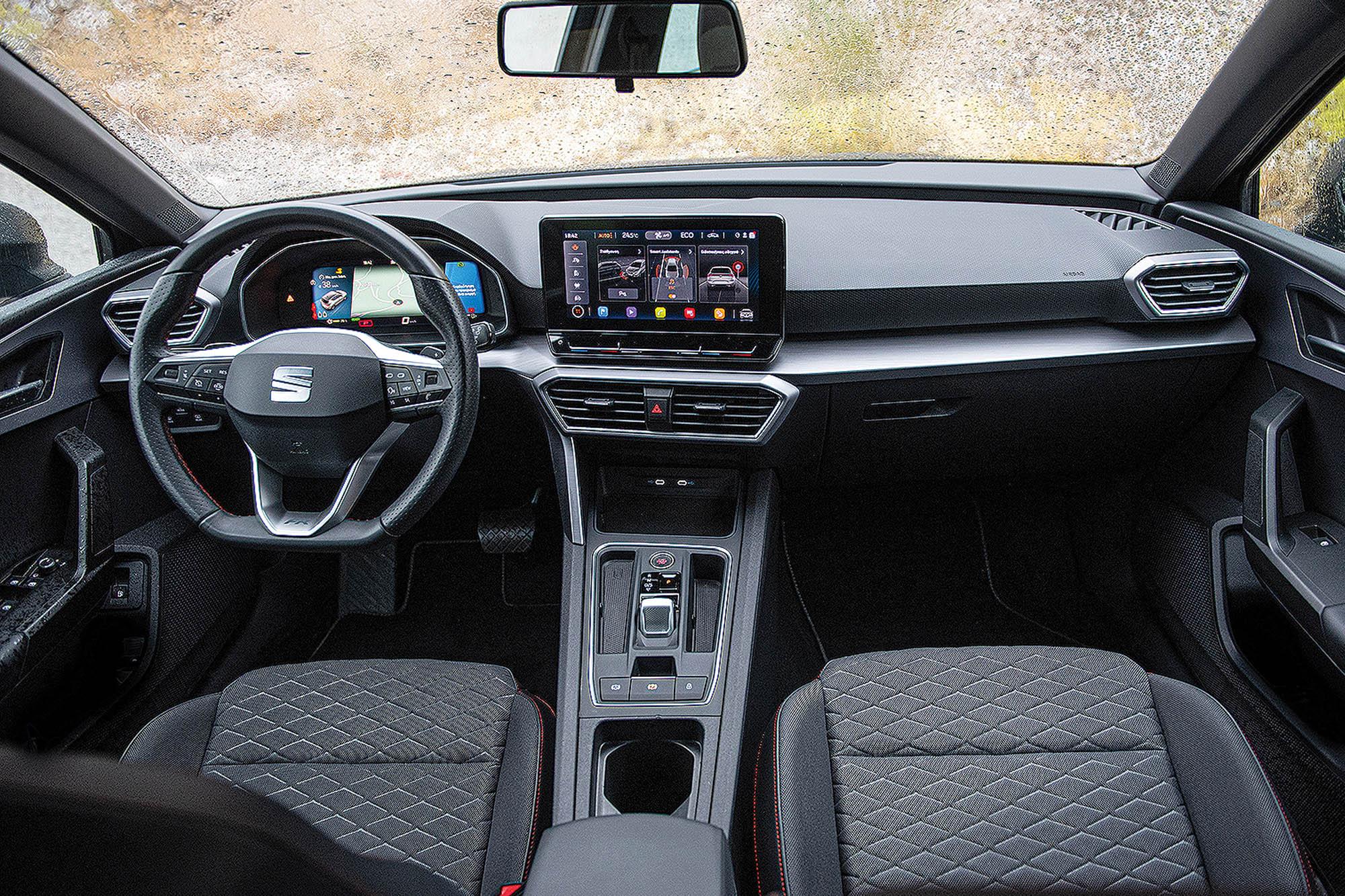 Στο Leon e-Hybrid, ο πίνακας οργάνων είναι ψηφιακός, ονομάζεται Seat Digital Cockpit και χρησιμοποιεί μια οθόνη 10,25in, η οποία διαθέτει ευκρινείς ενδείξεις και όμορφα γραφικά, ενώ έχει τη δυνατότητα εξατομίκευσης, με αρκετές επιλογές στο τι πληροφορίες θα προβάλλονται. Στην έκδοση FR συνδυάζεται με μία οθόνη αφής 10in, η οποία στις απλούστερες εκδόσεις είναι 8in, μέσω της οποίας γίνεται ο χειρισμός του infotainment, το οποίο όμως είναι αρκετά περίπλοκο και όχι τόσο χρηστικό. Μάλιστα η σχεδόν πλήρης απουσία φυσικών διακοπτών περιπλέκει λίγο παραπάνω τα πράγματα. Οι μοναδικοί φυσικοί διακόπτες που υπάρχουν είναι για το κλείδωμα των θυρών, για την ενεργοποίηση του Auto Hold, το χειρόφρενο, ο διακόπτης εκκίνησης του κινητήρα και ο επιλογέας σχέσεων του αυτόματου κιβωτίου. Ακόμα και ο διακόπτης εναλλαγής των οδηγικών προφίλ απουσιάζει και για να αλλάξεις ανάμεσα στα Eco, Normal, Comfort, Sport και Individual πρέπει να μπεις από το μενού της οθόνης, ενώ το μη φωτιζόμενο πάνελ αφής για την αυξομείωση της έντασης του ήχου και της εσωτερικής θερμοκρασίας θέλει λίγη εξοικείωση.