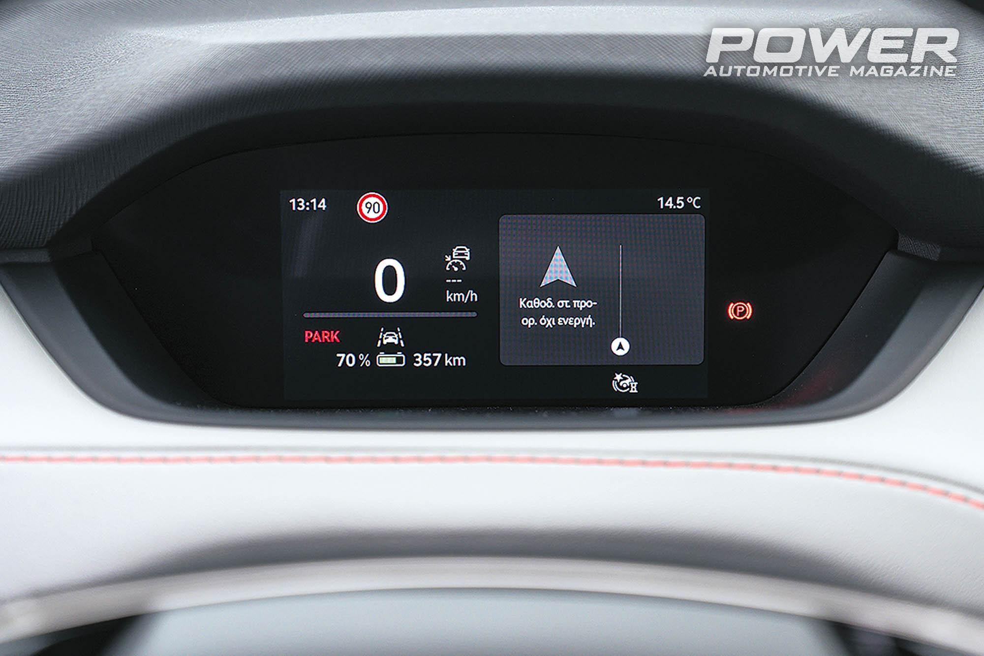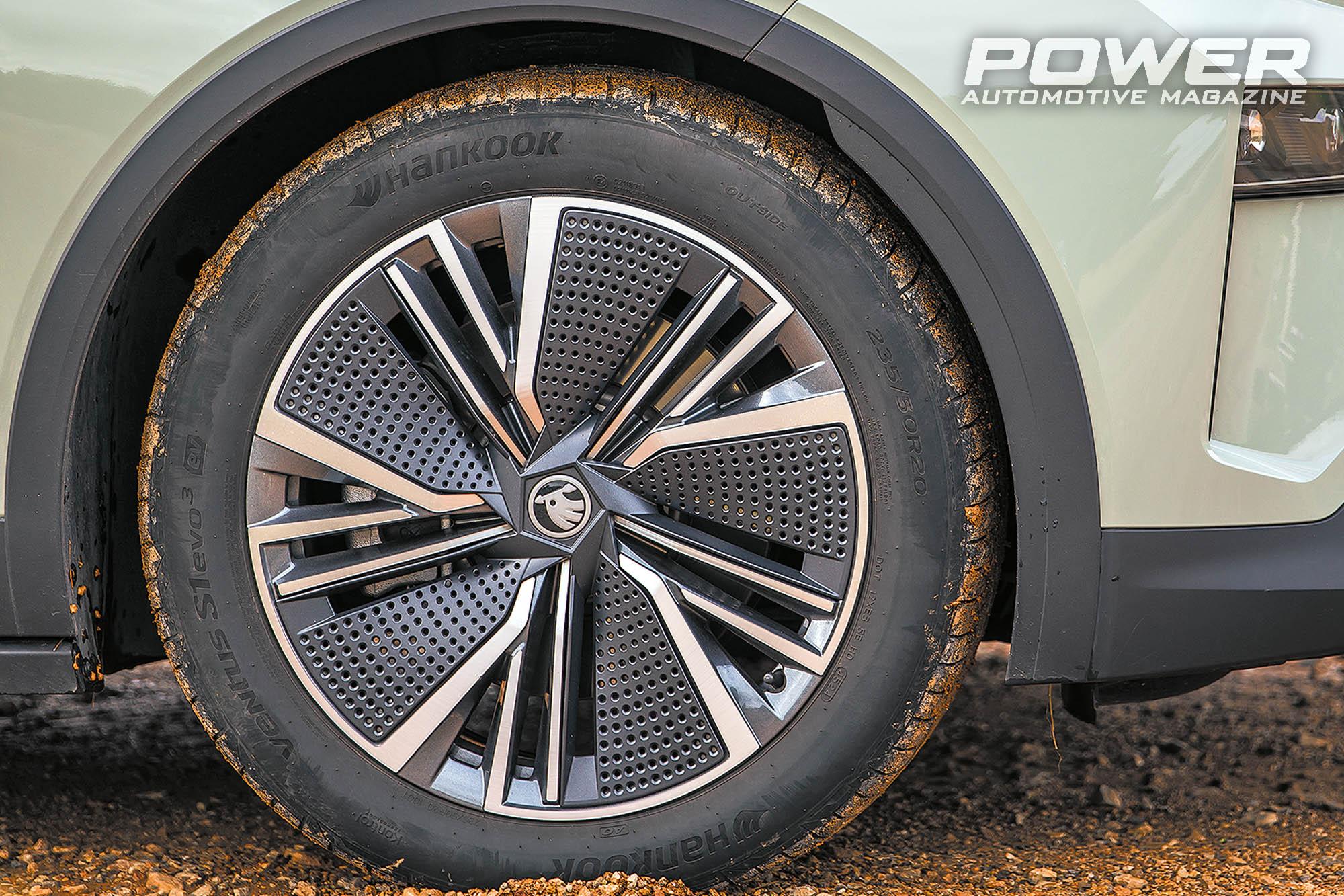 Εδώ όμως πρέπει να τονίσουμε κάτι: Βάζοντας ηλεκτρομοτέρ και κίνηση πίσω, η Skoda έχει πετύχει στατική κατανομή βάρους 48,1% εμπρός - 51,9% πίσω. Για να μην χάνει πρόσφυση και να μην γλιστρά εύκολα η «ουρά» λόγω βάρους, έβαλαν φαρδιά ελαστικά 255/45 (235/50 εμπρός) σε 20άρες ζάντες και ένα έξυπνο traction control με «ολίγον τι» από ηλεκτρομπλοκέ! Το έχουν ρυθμίσει έτσι (ιδίως στο Sport mode) ώστε να μην κόβει ακαριαία τη δύναμη, το αφήνει να νιώσεις ένα απαλό, σύντομο σπινιάρισμα (και ελάχιστο γλίστρημα του πίσω μέρους) και γρήγορα βρίσκει πρόσφυση. Σου περνά έξυπνα την αίσθηση του δυνατού πισωκίνητου οχήματος χωρίς ποτέ να σε τρομάζει. Πού βοηθά αυτό; Στο να σου δίνει την αίσθηση πως δεν είναι ένα αποστειρωμένο μοντέρνο EV, αλλά έχει κάτι old-school μέσα του που μπορεί να σε κάνει να χαμογελάσεις.