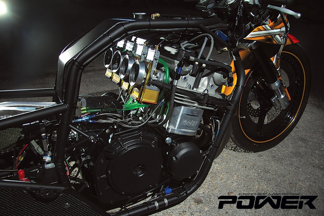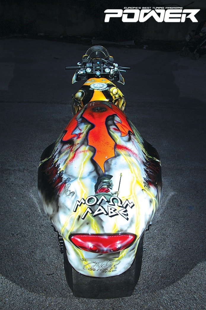Το data logger V300sd της Racepak μεταδίδει όλα τα απαραίτητα στοιχεία για την λειτουργία του κινητήρα στην ομάδα μετά από κάθε πέρασμα, προκειμένου να τον ρυθμίσουν στην εντέλεια. Αν και η μοτοσυκλέτα είναι καρμπυρατεράτη, υπάρχει και ECU η οποία αναλαμβάνει την ανάφλεξη και την διαχείριση του nitro. Αυτή είναι της Schnitz Racing και βρίσκεται ακόμα σε πειραματικό στάδιο με αρκετά bugs. Το εντυπωσιακό είναι πως η ελληνική ομάδα κατάφερε και βρήκε αρκετά από αυτά τα bugs και τα ξεπέρασε! Η ελληνική μας ομάδα συνεργάστηκε εκτενώς όλη τη χρονιά με τη Schnitz παρέχοντας πληροφορίες, μιας και τα PXM που τρέχουν με Schnitz Firestorm στον πλανήτη είναι ελάχιστα. Η απανωτές επιτυχίες αποδεικνύουν ότι η Racetech by Tzanidakis Dragteam ξέρει τι κάνει και σίγουρα βοήθησε στην εξέλιξη του συστήματος που αυτή τη στιγμή έχει καθιερωθεί ως το καλύτερο και πιο προηγμένο nitro controller. Ο κινητήρας είναι πραγματικό διαμάντι και έχει τρομερή δύναμη, μιας και αποδίδει 320Psατμοσφαιρικά, ενώ τρώει και μία σφαλιάρα των +300Psόταν ψεκαστεί nitro. Για την ώρα πάντως έχει ψεκάσει μέχρι +150Ps, οι χρόνοι που θα δείτε παρακάτω έχουν γίνει με περίπου 450Ps. Με φουλ nitro, έχεις 620Ps στον τροχό και είσαι ξαπλωμένος πάνω στον κινητήρα που στροφάρει στις 12.000rpm. Το πιο τρομακτικό που μπορώ να σκεφτώ είναι η ελεύθερη πτώση. Χωρίς αλεξίπτωτο.