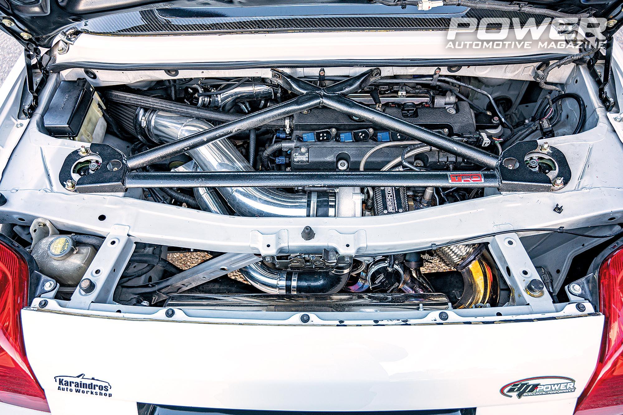 Το λοιπόν, που λέτε παιδιά, οποιοδήποτε αυτοκίνητο είναι κεντρομήχανο και ζυγίζει ένα τόνο είναι εξ’ ορισμού καλό. Είναι καλό για βελτίωση, για πίστα, για αναβάσεις για time attack κτλ, επειδή «κρατάει» πολύ και έχει πολύ υψηλό όριο πρόσφυσης. Δεν κάνει για drift και εντυπωσιακά «παντιλίκια», γιατί το παράθυρο μεταξύ του «κρατάω» και του «ξεκολλάω» είναι πολύ μικρό και σε μπόλικα G, οπότε αν δεν είσαι κανένας Verstappen, μείνε στο «κρατάω» και πάρε κανένα RX-8 ή E46 M3 για drift, που συγχωρούν σχεδόν όλα τα οδηγικά λάθη και αρέσκονται στην οδήγηση υπό γωνίες. Το MR2 είναι απόλυτο και όσο του ανεβάζεις το όριο πρόσφυσης με ανάρτηση, λάστιχα και αεροτομές, τόσο πιο απόλυτο αλλά και τόσο πιο γρήγορο γίνεται. Το συγκεκριμένο, είναι βελτιωμένο από την PB Motorsport που ανέλαβε την μετατροπή σε Κ20, καθώς και τα απαραίτητα ηλεκτρολογικά που αναλογούν, χρησιμοποιώντας ένα Innovative mount kit για Honda K20 που έχει όλες τις απαραίτητες βάσεις και ενισχύσεις για την τοποθέτηση. Μάλιστα, ο συγκεκριμένος Κ20Α ήταν και JDM, δηλαδή προέρχεται από ιαπωνικών προδιαγραφών αυτοκίνητο και έχει σχέση συμπίεσης 11,5:1 αντί για 11:1 που είχαν τα ευρωπαϊκά Κ20Α. Ο εγκέφαλος που χρησιμοποιεί είναι ο Series 2 της AEM που τον προγραμμάτισε ο Άγγελος Παπαηλίας στην AP+ Power, ενώ το turbo kit με την Garrett GTX3076R Gen2, με λόγο A/R 0.63 και τα παρελκόμενά της το σχεδίασε ο Γιώργος Καραΐνδρος στην Karaindros Auto Workshop, ο οποίος περιποιήθηκε και την κεφαλή με βαλβίδες και ελατήρια της σειράς Competition Plus της Ferrea που είναι πιο ανθεκτικές στις υψηλές θερμοκρασίες, για την χρήση turbo. Σε εμάς πάντως δεν το έφερε κάποιος από του προαναφερθέντες, αλλά αυτός που έχει αναλάβει την ευθυγράμμιση, το στήσιμο και την προετοιμασία του για την χρήση πίστας, ο φίλος μας ο Βασίλης Στεφανάτος από την SAP Performance.