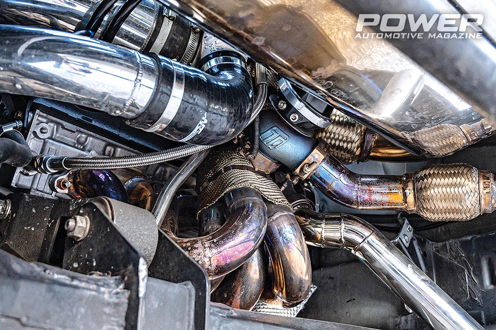 Ένα turbo kit δεν έρχεται «από μόνο του», αλλά το συνοδεύουν πολλά ακόμα ανταλλακτικά που φροντίζουν να μην πάρουμε στην μασχάλη ακόμα και έναν Κ20 που αποδεδειγμένα είναι «κτήνος» σε αντοχή. Φυσικά πρώτο και καλύτερο θα χρειαστεί ένα intercooler, το οποίο στην συγκεκριμένη περίπτωση που το μοτέρ είναι πίσω δεν βολεύει και έχει γίνει chargecooler, το οποίο είναι custom κατασκευασμένο από την PPM Exhaust με χωρητικότητα για 800Ps και το υπόλοιπο κύκλωμα του αέρα με σωληνώσεις, σκάστρα της Turbosmart και εισαγωγή της Aeroflow. Από την αντίπερα όχθη για την τοποθέτηση της τουρμπίνας κατασκευάστηκε ένα χταπόδι με δύο external από την PPM, όπως και η υπόλοιπη εξάτμιση των 76mm, η οποία είναι με «κλαπέτο» το οποίο, όταν είναι κλειστό, δεν ακούγεται τίποτα, σε βαθμό που κατά την φωτογράφιση έψαχνα στον καθρέφτη ηλεκτρικού αυτοκινήτου με ανοιχτά παράθυρα να δω αν είναι το MR2 ακόμα πίσω μου ή έμεινε σε κανένα φανάρι. Αφού λοιπόν ολοκληρώθηκαν όλες αυτές οι απαραίτητες εργασίες για την τοποθέτηση, έμεινε η τροφοδοσία σε καύσιμο, που πλέον είναι δουλειά μιας ομάδας που αποτελείται από μπεκ της Injector Dynamics 1.050cc/min, μιας τρόμπας βενζίνης της Aeromotive 340lt/h και ενός ρυθμιστή πίεσης επίσης της Aeromotive.