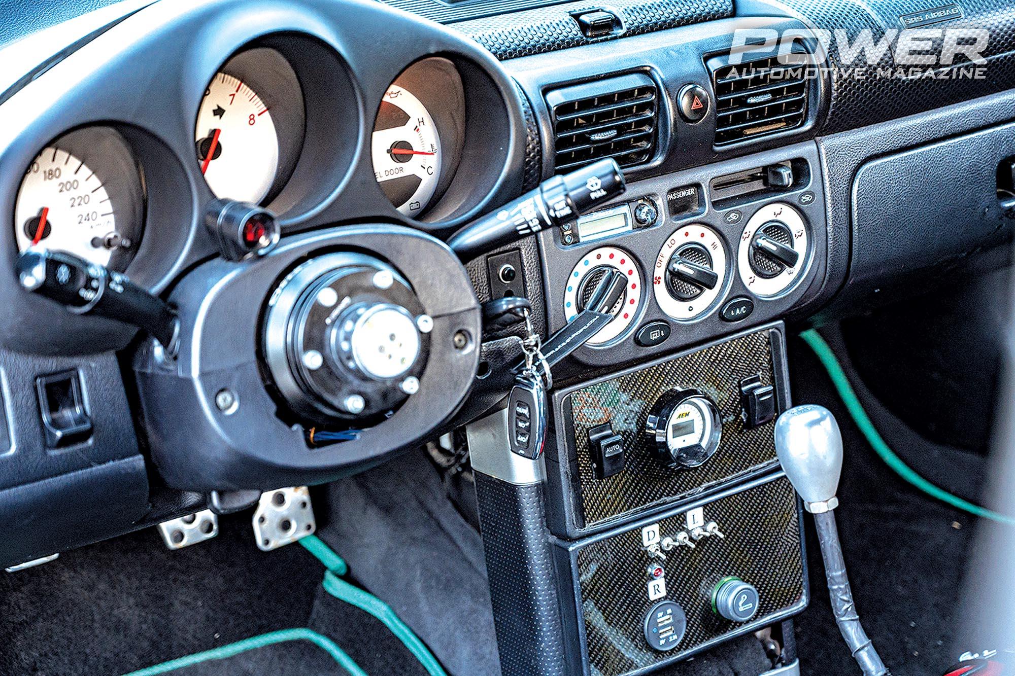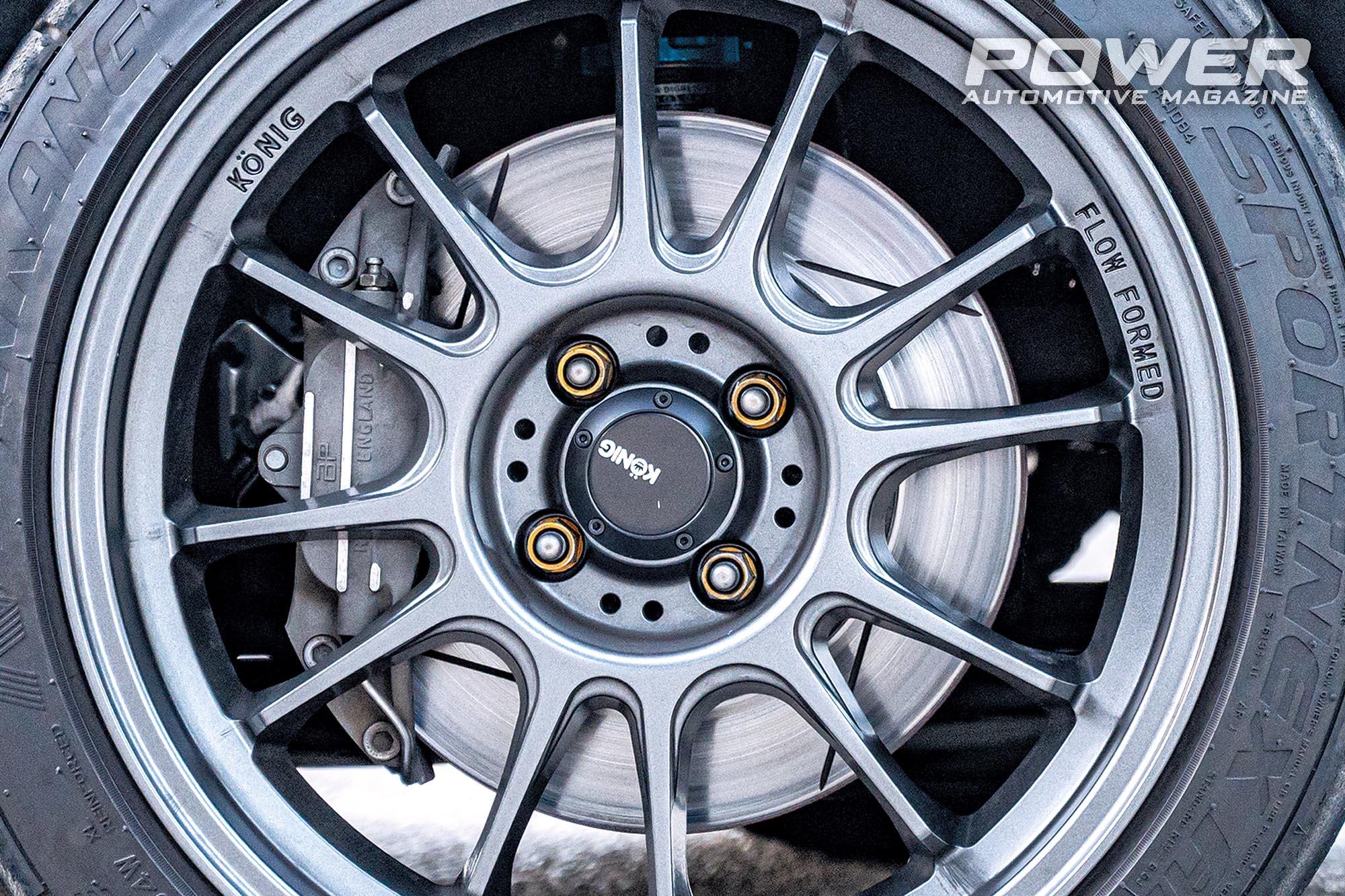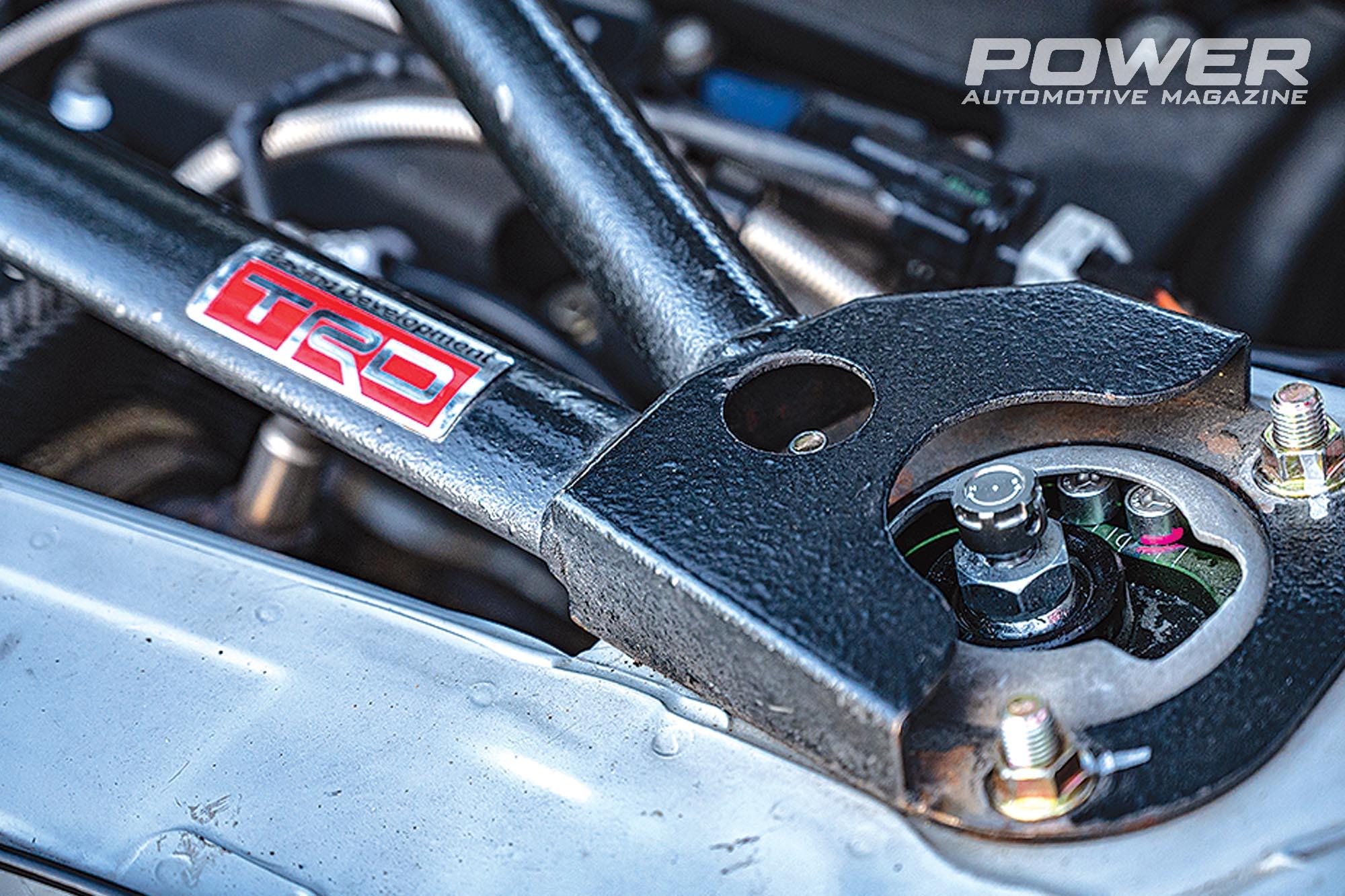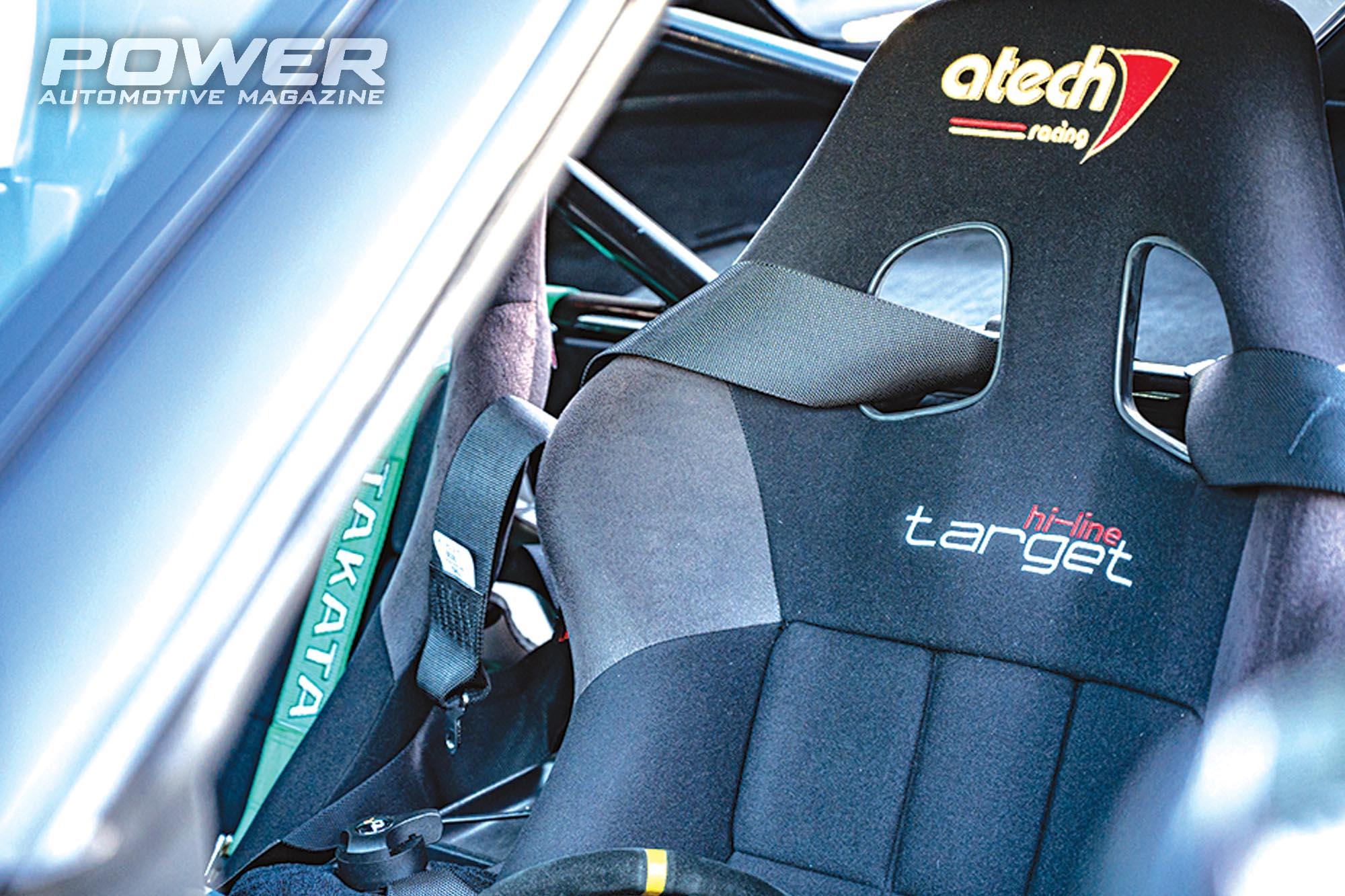 Πάνω κάτω, στον κινητήρα αυτά είναι τα σημαντικότερα που χρειάζονται, αλλά εδώ δεν έχουμε να κάνουμε με αυτοκίνητο dragster, άρα ο κινητήρας και η μετάδοση δεν είναι τα μόνα πράγματα πάνω του που χρειάζονται βελτίωση. Μιας και την ανέφερα την μετάδοση, το MR2 του Δημήτρη έχει μπλοκέ διαφορικό της MFactory με βήμα 4,4:1, συμπλέκτη stage 4 της Competition clutch και custom ημιαξόνια από την Gatzelakis. Το στήσιμό του όμως είναι το πιο σημαντικό και εδώ ο Δημήτρης δεν έκανε «τσιγκουνιές», με την ακριβή coilover ανάρτηση 510 series της Fortune Auto με custom «βαλβίδωμα» και ελατήρια 7kg εμπρός και 10kg πίσω. Στο ίδιο μοτίβο, τα πίσω ψαλίδια είναι ρυθμιζόμενα Uniball της Hardrace, ενώ τα silent blocks στα εμπρός είναι σκληρότερα από την Superpro. Τέλος, το άλλο μεγάλο κεφάλαιο για καλό χρόνο στην πίστα είναι τα φρένα, εδώ έχουμε τετραπίστονες δαγκάνες της AP Racing για την δύναμη και τακάκια Carbotech XP8 για την αντοχή στην σκληρή χρήση των συνεχόμενων γύρων, τα οποία μάλιστα δεν σφύριζαν υπερβολικά, όπως έχουμε συνηθίσει από τις racing πάστες. Για την ασφάλεια του «πληρώματος», υπάρχει μισό roll cage κατασκευής Γιαννόπουλου (είναι φανοποιείο στην Τρίπολη, όχι της Λιβύης) και φυσικά καθίσματα bucket της Atech Racing, με ζώνες 4 σημείων της TRS.