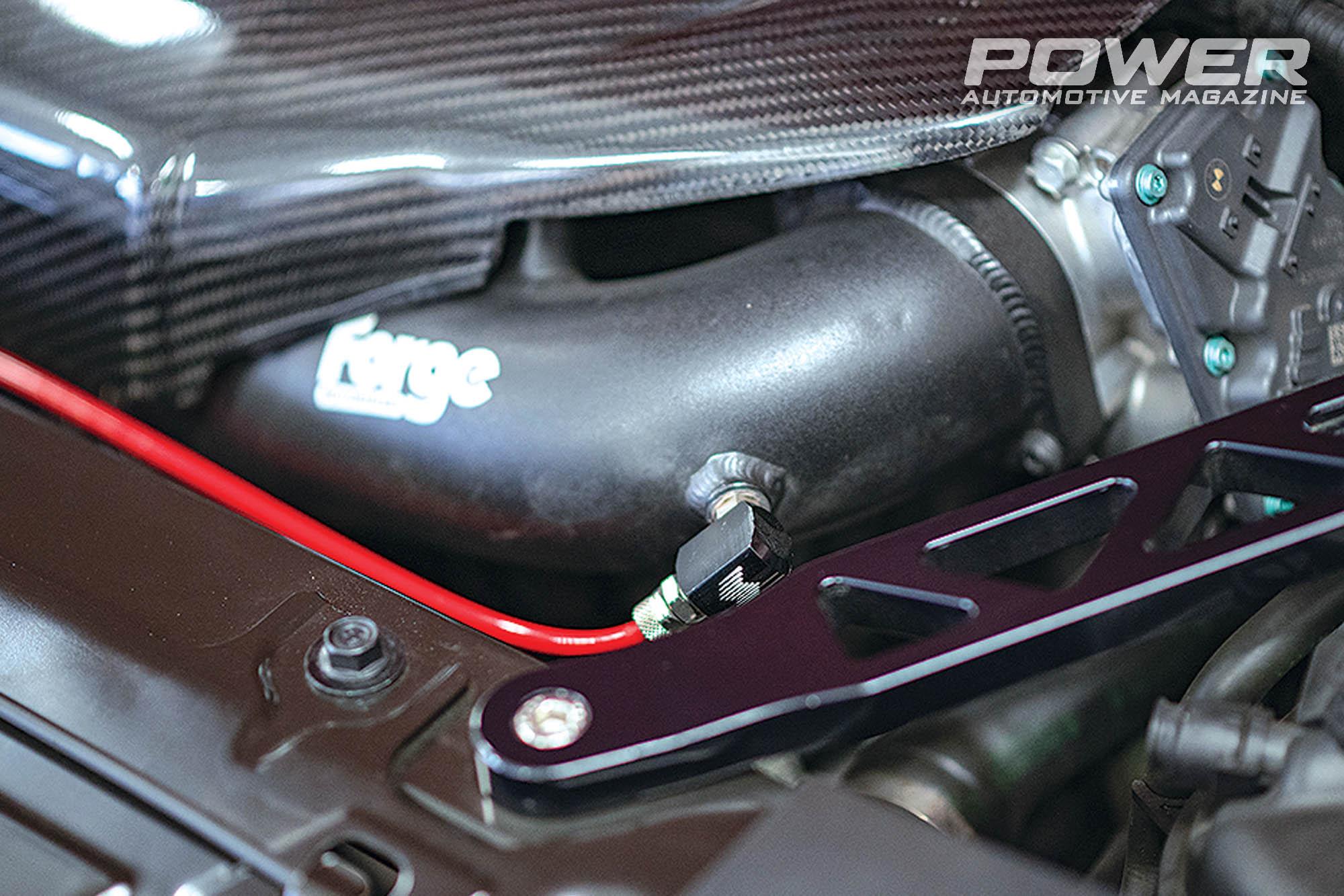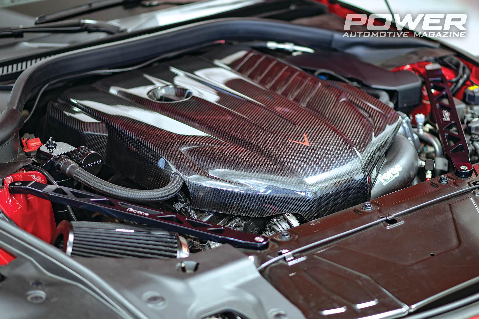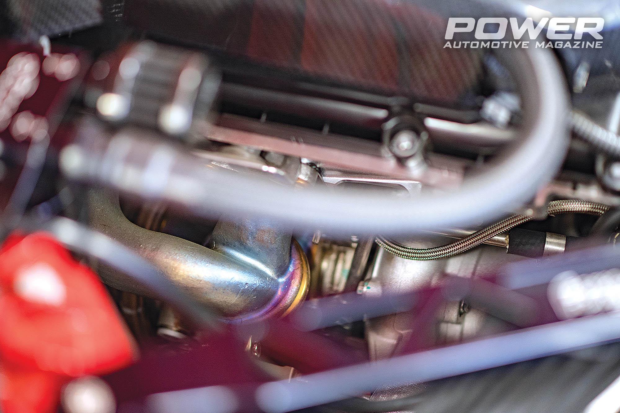 Είναι μονοτούρμπινο και όχι twin turbo, όπως το τέρας S58 των νέων G80/G82 M3/M4 και αυτό του δίνει καλύτερο ήχο, τον οποίο ενισχύει και η εξάτμιση τιτανίου της Akrapovic που του έχουν τοποθετήσει, με downpipe 89mm της Brondex performance parts, με τα οποία κατά την κρύα εκκίνηση σείεται όλο το μαγαζί. Αν μένεις δηλαδή σε πολυκατοικία και θέλεις να το πάρεις νύχτα και να βγεις από το γκαράζ ή την πιλοτή, αυτοί που μένουν στον πρώτο θα νομίζουν πως κάνει σεισμό. Η τουρμπίνα του είναι η CTS TR-1059 ειδικά εξελιγμένη για τον Β58, η οποία αντιστοιχεί σε διαστάσεις και χαρακτηριστικά με την Garrett GTX3582R και είναι ειδικά μελετημένη σε flow bench για την twin scroll αρχιτεκτονική που έχει ο Β58. Μπαίνει απευθείας στη θέση της εργοστασιακής χωρίς αντάπτορα ή πλακάκι, ακόμα και με την εργοστασιακή εξάτμιση... που σιγά μην βάλει κάποιος αυτό το θηρίο για τουρμπίνα και αφήσει το εργοστασιακό downpipe.
