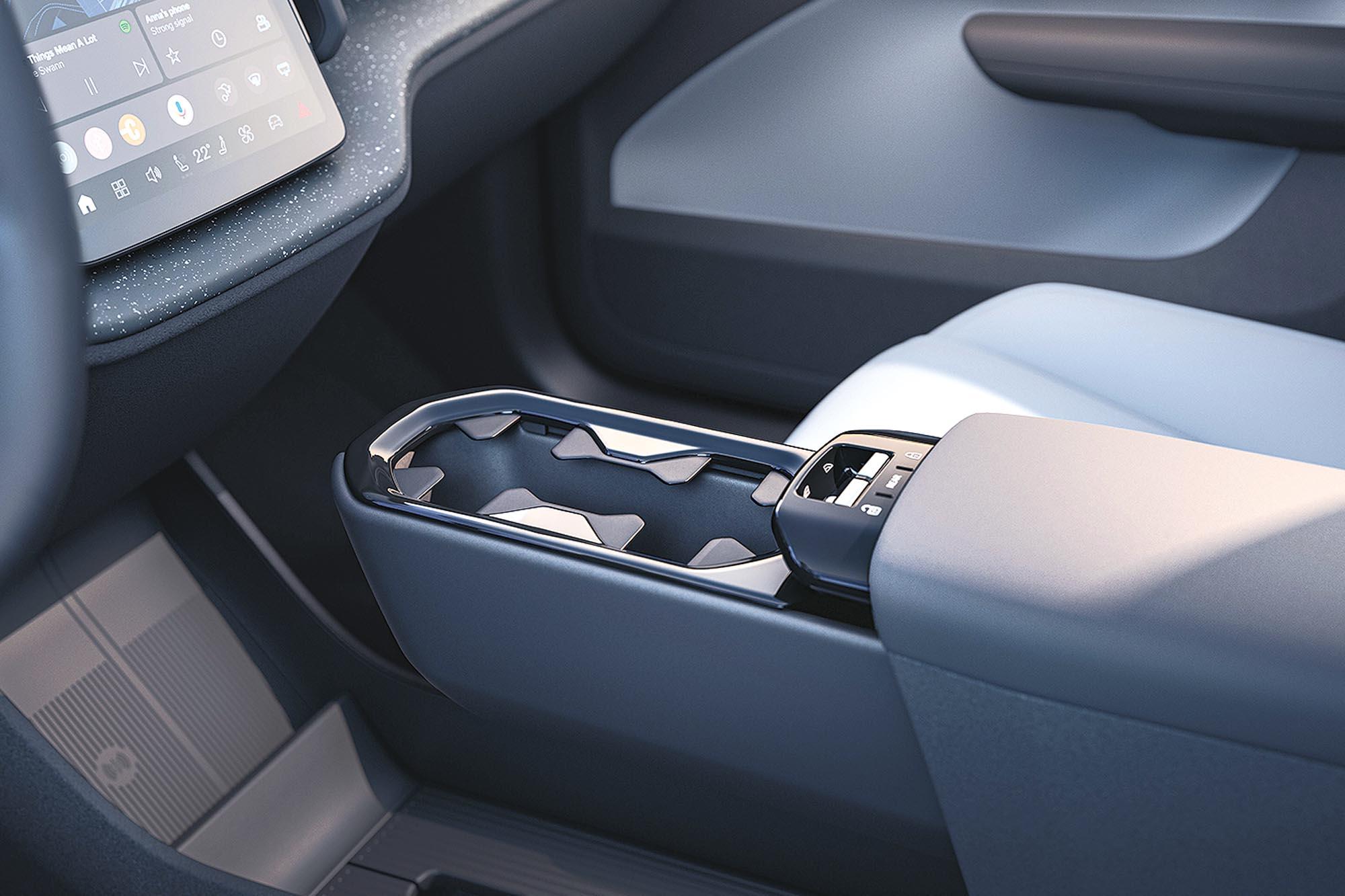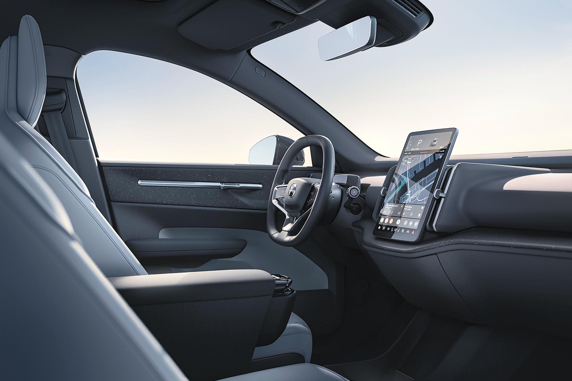 Το εσωτερικό του είναι η απόλυτη έκφραση του minimal σε μία ψηφιακή εποχή. Η μεγάλη οθόνη αφής 12,3in στο κέντρο του ταμπλό αποτελεί το «επιχειρησιακό κέντρο» του οδηγού. Μιλάμε ίσως για υπέρμετρο μινιμαλισμό, αφού ο οδηγός μπροστά του δεν έχει απολύτως τίποτα και όλες οι λειτουργίες και ρυθμίσεις του αυτοκινήτου γίνονται από την κεντρική οθόνη η οποία χωρίζεται, με το πάνω μέρος να παίζει τον ρόλο του πίνακα οργάνων και από κάτω να βρίσκονται τα μενού των συστημάτων και εφαρμογών της Google και ορισμένες συντομεύσεις. Το λογισμικό της Google είναι πολύ καλό, με γρήγορη απόκριση και ευδιάκριτες ενδείξεις, όμως το γεγονός ότι όλες οι ρυθμίσεις γίνονται από εδώ δημιουργεί ορισμένα προβλήματα: όπως η ρύθμιση των καθρεφτών ή το θερμαινόμενο πίσω παρμπρίζ είναι και τα δύο κρυμμένα μέσα σε υπομενού της οθόνης. Η φιλοσοφία θυμίζει σε μεγάλο βαθμό αυτή των μοντέλων της Tesla. Το EX30 μπορεί να περηφανεύεται ότι διαθέτει καμπίνα κατασκευασμένη αποκλειστικά από ανακυκλωμένα υλικά, ωστόσο ο διάκοσμος δείχνει κάπως φτωχός και η αποκλειστική χρήση σκληρών πλαστικών θα ενοχλήσει όσους έχουν συγκεκριμένη εικόνα για τα μοντέλα της Volvo και το premium «ποιόν» τους. Κάτι που θα ενισχύσει την εικόνα στο εσωτερικό είναι οι επιλογές Breeze ή Mist από τον προαιρετικό εξοπλισμό (διαθέσιμες μονάχα στις εκδόσεις Plus και Ultra) με τις όμορφες ανοιχτόχρωμες επενδύσεις για τα καθίσματα, τα door panels και το ταμπλό. Οι χώροι είναι καλοί, αυστηρά για 4 επιβάτες, κάτι απόλυτα λογικό αν αναλογιστούμε τα 4,2m μήκους. Ο χώρος αποσκευών είναι μικρός, με χωρητικότητα 318lt στο πίσω μέρος και έναν επιπλέον αποθηκευτικό χώρο 7lt κάτω από το εμπρός καπό (325lt συνολικά).