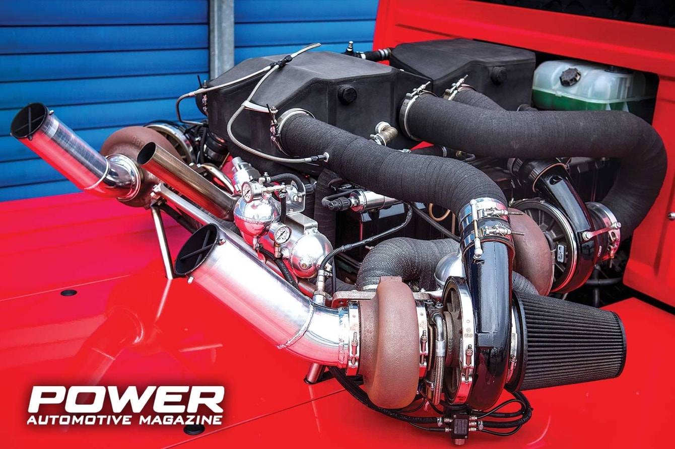 Πέρα από το τεράστιο μέγεθός του, ο κινητήρας αυτός παρουσιάζει φοβερό ενδιαφέρον. Είναι ένα τυπικό εξακύλινδρο σύνολο σε σειρά, κατασκευασμένο από την Volvo, με κωδικό D12A 420 Mark 2. Όπως υποδηλώνει ο κωδικός, το 12 αναφέρεται στον κυβισμό, που είναι στα 12lt, ενώ το 420 είναι η εργοστασιακή του ιπποδύναμη. Ο κινητήρας χρησιμοποιεί διαιρούμενα πιστόνια, τα οποία έχουν κεφαλή από ατσάλι, φούστες από αλουμίνιο και παλινδρομούν μέσα σε τεράστια υδροχιτώνια. Τα πιστόνια έχουν διάμετρο στα 131mm, ενώ η διαδρομή, που φτάνει στα 150mm, ορίζει τον κυβισμό του συνόλου στα 12.130cc! Η δε συμπίεσή του φτάνει στο 17,5:1, το βάρος του είναι στα 1.175kg, οι βαλβίδες εισαγωγής έχουν 40mm διάμετρο, με 8mm καλάμι, ο κάθε κύλινδρος έχει δύο βαλβίδες με τον εκκεντροφόρο να παίρνει κίνηση από το στρόφαλο μέσω γραναζιών και όχι μέσω ιμάντα ή αλυσίδας. Ο κινητήρας έχει άμεσο ηλεκτρονικό ψεκασμό, χρησιμοποιεί μία αντλία που σε full duty σηκώνει 45PSI και τροφοδοτεί τα έξι μπεκ. Εδώ, όπως καταλάβατε και είδατε στις φωτογραφίες, χρησιμοποιούνται τρεις Garrett GT55R, με τις δύο πρώτες να είναι παράλληλα τοποθετημένες και να έχουν αναλάβει τις χαμηλές στροφές και την τρίτη τις υψηλές. Όταν βέβαια μιλάμε για υψηλές στροφές σε έναν κινητήρα φορτηγού, μιλάμε για τις 1.900rpm-2.200rpm. Για να μπουν επάνω τα turbo, έπρεπε να μελετηθεί η ακριβής θέση τους, να κατασκευαστούν από το μηδέν οι βάσεις και όλες οι σωληνώσεις από και προς τα charge-cooler, καθώς φυσικά και οι εξατμίσεις και οι εισαγωγές αέρα. Παντού χρησιμοποιήθηκαν συνδέσεις v-band, σιλικονούχα κολάρα, τα οποία ασφαλίστηκαν με λάμες επάνω στα turbo. Στη συνέχεια κατασκευάστηκαν βάσεις για να τοποθετηθούν οι αισθητήρες για τη θερμοκρασία καυσαερίων και για τη θερμοκρασία εισερχόμενου αέρα. Δύο external της TiAL πήραν τη θέση τους στο κύκλωμα, ενώ στις εισαγωγές των turbo θα συναντήσουμε τρεις φιλτροχοάνες της Κ&Ν. Παράλληλα, τοποθετήθηκαν τα μπεκ για το σύστημα νίτρο της Nitrous Express και πλέον είχε σειρά να τοποθετηθεί αισθητήρας wideband της Innovate Motorsports, καθώς και ένας αισθητήρας backpressure της Volvo των 1.000kPa. Στη συνέχεια βρήκαν τη θέση τους δύο ΜΑΡ sensors, ένας της Volvo και ένας της KMS. Το επόμενο και δυσκολότερο βήμα ήταν ο προγραμματισμός των μονάδων διαχείρισης του κινητήρα και του κιβωτίου ταχυτήτων. Η μονάδα του κινητήρα θα έπρεπε να διαχειριστεί, εκτός από τα μπεκ καυσίμου, τον ψεκασμό του νίτρο, το traction control, το boost controller, καθώς και το launch control. Παράλληλα θα έπρεπε να ρυθμιστεί η μονάδα του κιβωτίου με το flat-shift, συνδυασμένη με τον κόφτη πίεσης και πολλές ακόμα παράμετροι που απαιτούσαν άπειρες δοκιμές επάνω στο δυναμόμετρο και πολύ ψάξιμο. Μόνο και μόνο για το βασικό σετάρισμα χρειάστηκαν περίπου 500 ώρες και 240 logs!